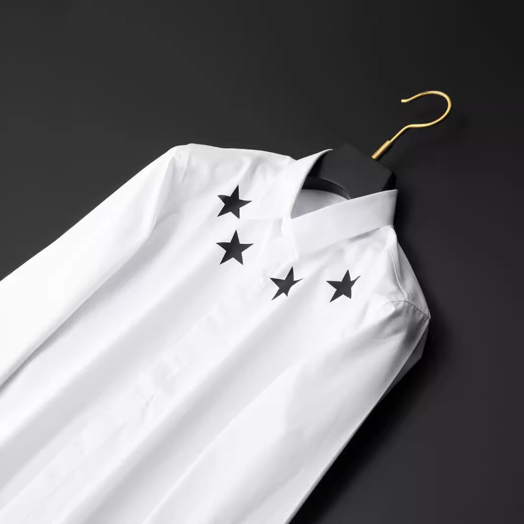Áo sơ mi dài tay nam có hình ngôi sao năm cánh in nổi bật, phong cách thời trang đường phố. Chất vải mềm mại, thoáng mát, tạo cảm giác dễ chịu khi mặc cả ngày. Kiểu dáng rộng rãi thoải mái, phù hợp cho các hoạt động hằng ngày. Sản phẩm dễ dàng phối với quần jean hay quần kaki. Có thể giặt máy nhẹ nhàng và phơi khô tự nhiên để bảo quản hình in được lâu. | Tên sản phẩm: Áo Sơ Mi Nam Dài Tay Họa Tiết Hoa Phong Cách Âu Mỹ - Thời Trang Nam | Mã sản phẩm: C1200 - Giá: 1.130.000đ | Mã nhà sản xuất: FODAR-G04Hình ảnh sản phẩm