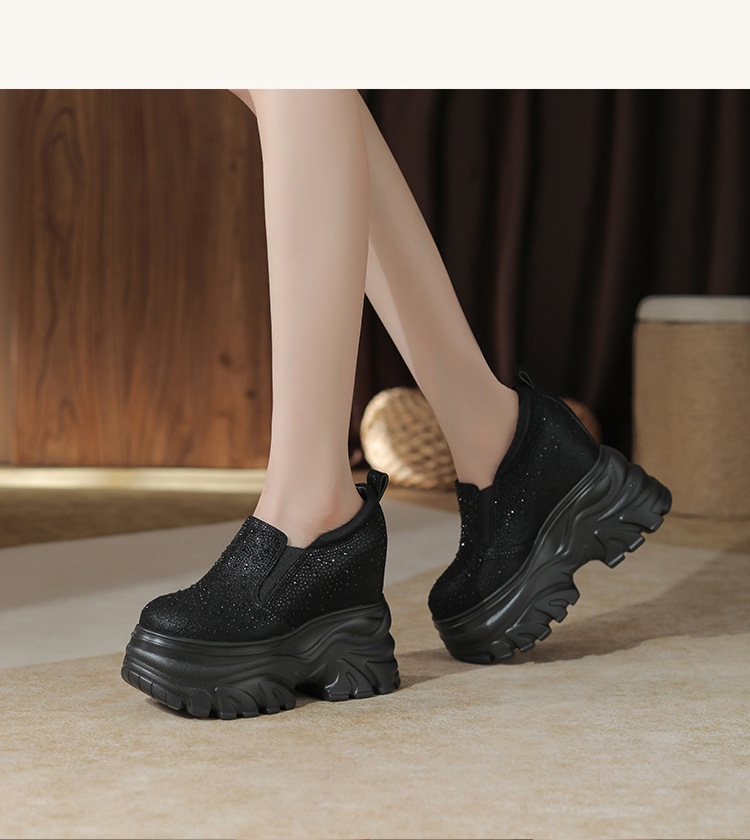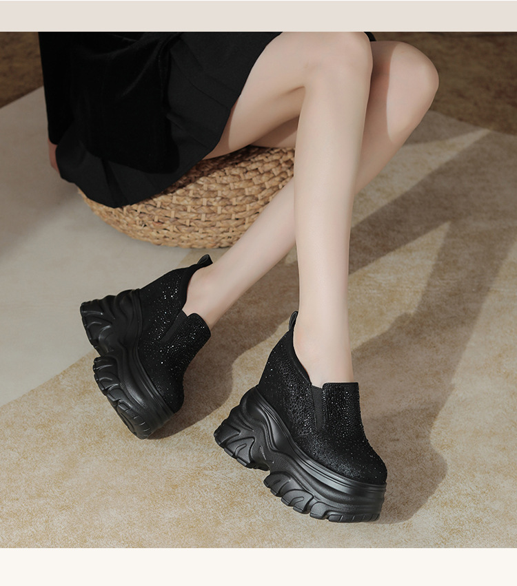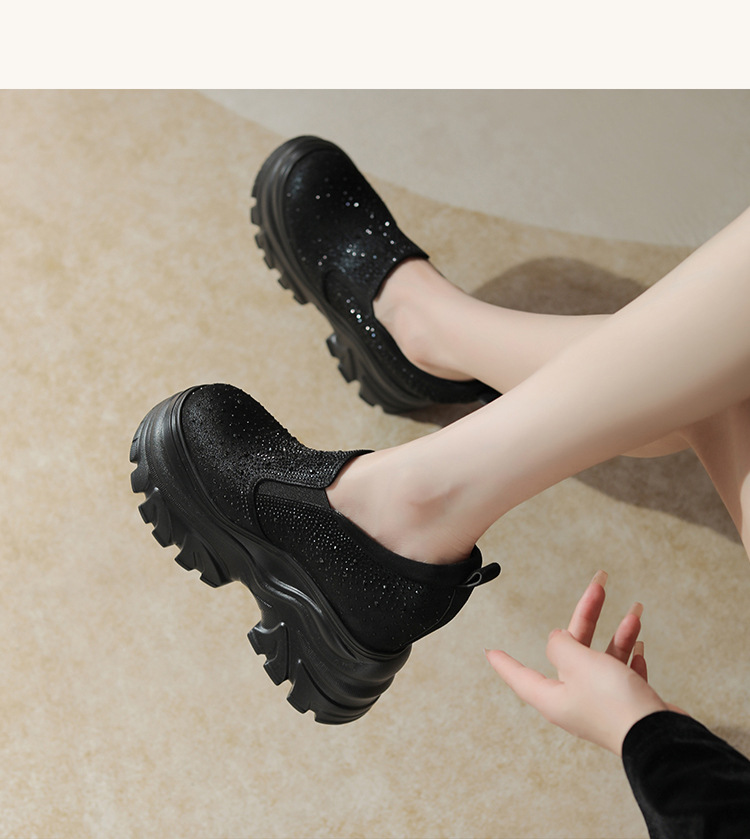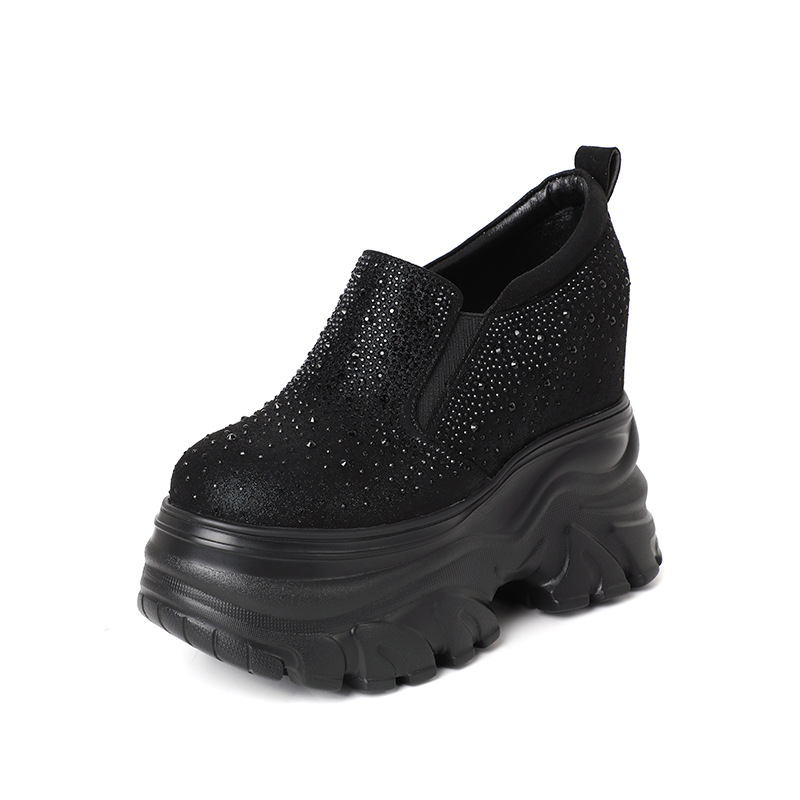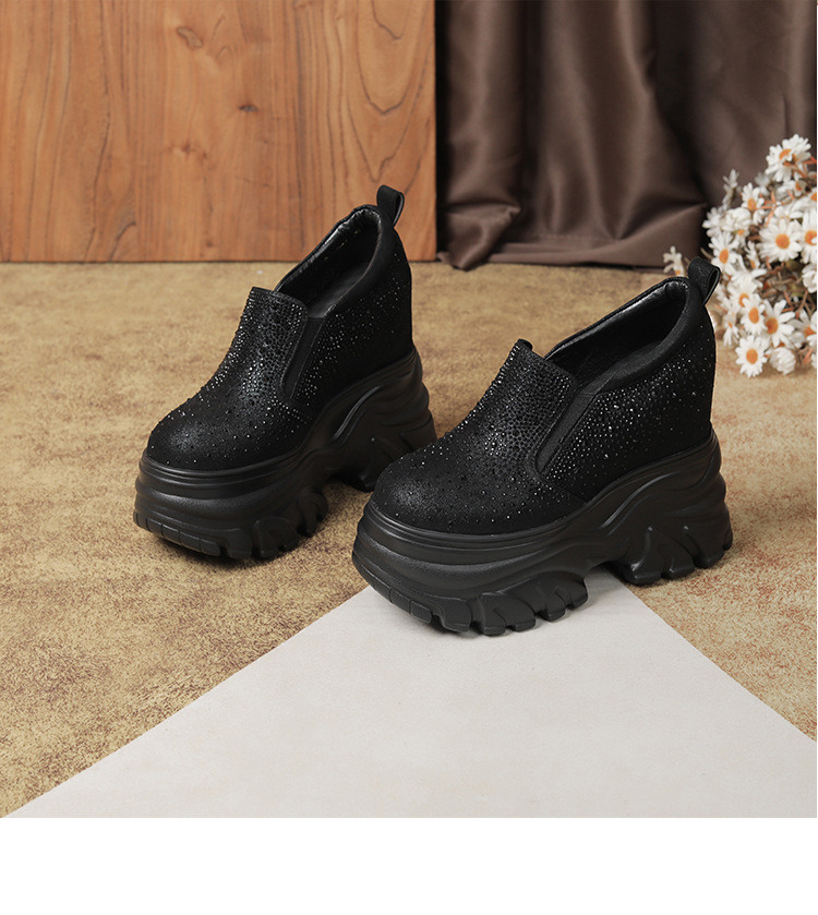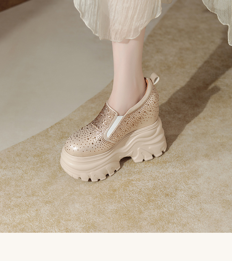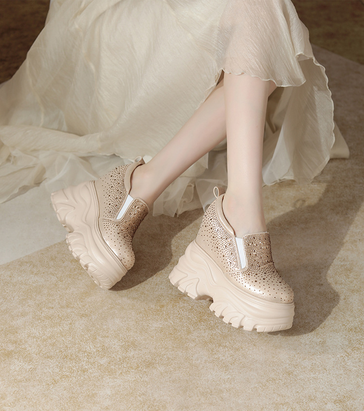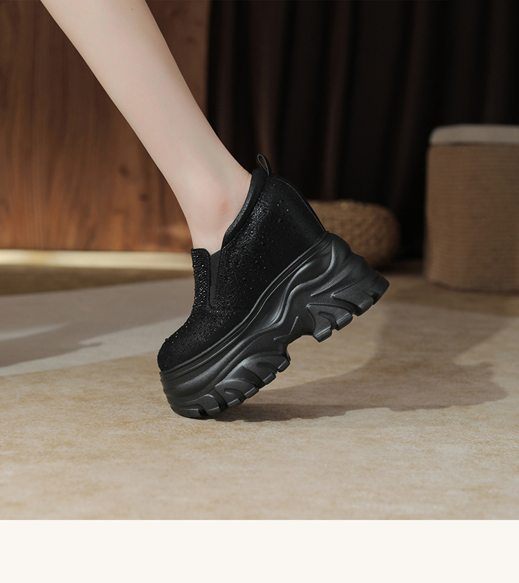 Đôi giày này có phần đế dày và phía trong được thiết kế thêm một lớp đệm nâng đỡ, giúp tăng chiều cao một cách tinh tế. Kiểu dáng giày slip-on rất thuận tiện, dễ dàng mang vào hay tháo ra. Mặt trên giàu được điểm xuyết bằng các chi tiết pha lê lấp lánh, tạo điểm nhấn nổi bật. Phong cách thiết kế kết hợp giữa sự thoải mái cho những lúc thư giãn và vẻ thanh lịch phù hợp cho nhiều dịp. Bạn chỉ cần xỏ chân vào là có thể tự tin bước đi ngay lập tức. | Tên sản phẩm: Giày Cao Gót Nữ Cao 14cm Gắn Đá Tăng Chiều Cao Đế Cao - Giày Dép Nữ | Mã sản phẩm: C1281 - Giá: 3.870.000đ | Mã nhà sản xuất: QIDNG-G06Hình ảnh sản phẩm
