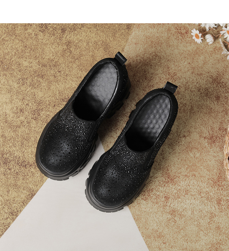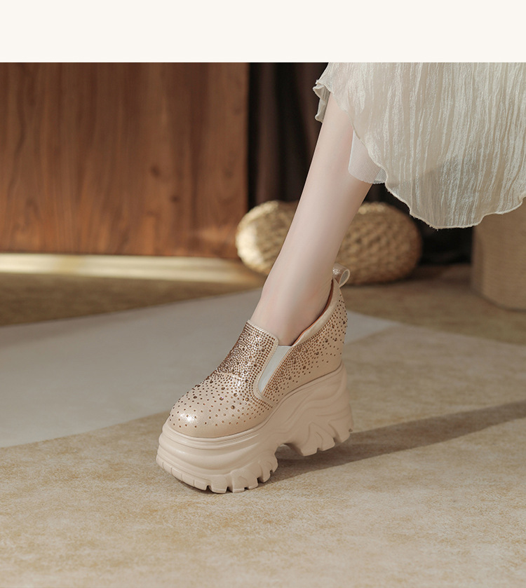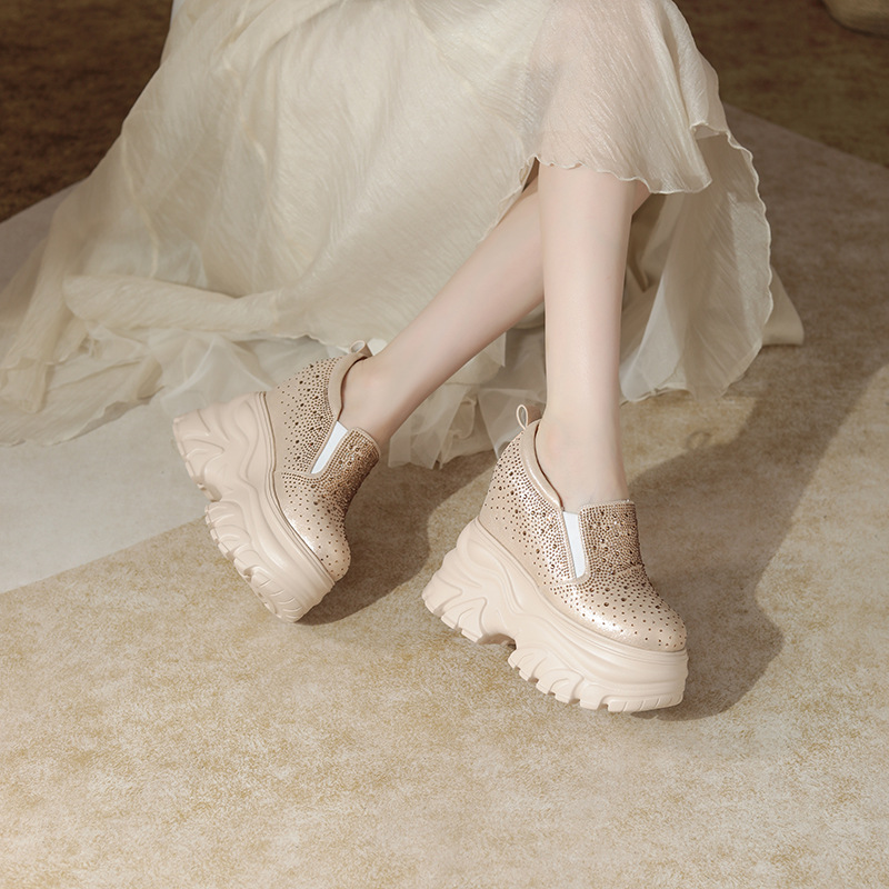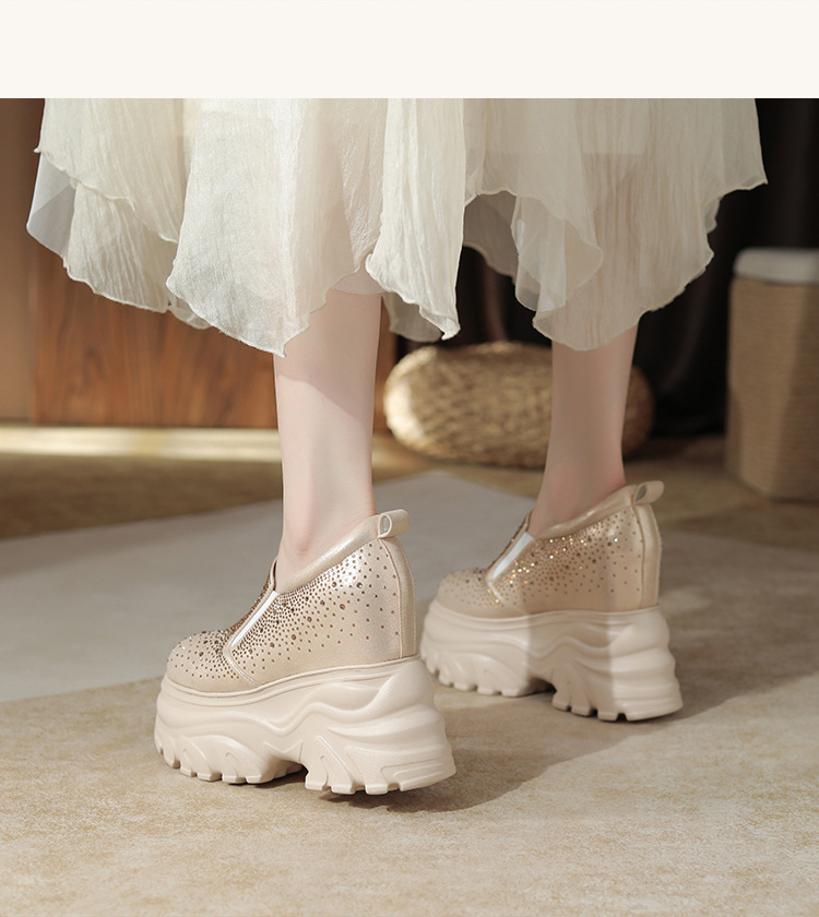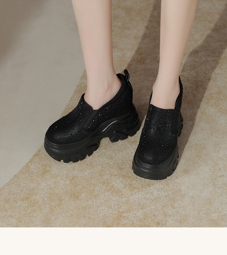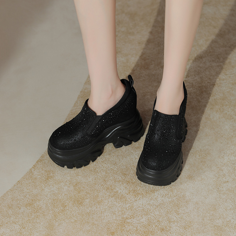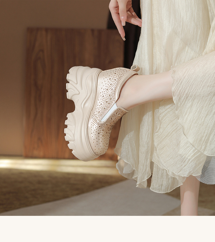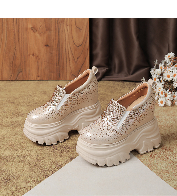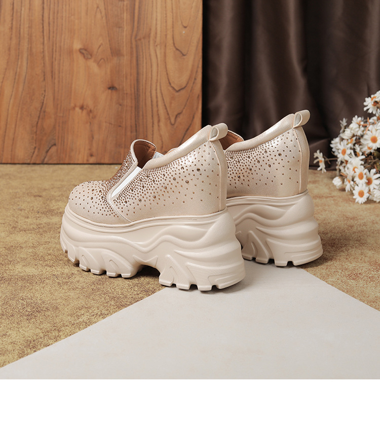 Đôi giày này có phần đế dày và phía trong được thiết kế thêm một lớp đệm nâng đỡ, giúp tăng chiều cao một cách tinh tế. Kiểu dáng giày slip-on rất thuận tiện, dễ dàng mang vào hay tháo ra. Mặt trên giàu được điểm xuyết bằng các chi tiết pha lê lấp lánh, tạo điểm nhấn nổi bật. Phong cách thiết kế kết hợp giữa sự thoải mái cho những lúc thư giãn và vẻ thanh lịch phù hợp cho nhiều dịp. Bạn chỉ cần xỏ chân vào là có thể tự tin bước đi ngay lập tức. | Tên sản phẩm: Giày Cao Gót Nữ Cao 14cm Gắn Đá Tăng Chiều Cao Đế Cao - Giày Dép Nữ | Mã sản phẩm: C1281 - Giá: 3.870.000đ | Mã nhà sản xuất: QIDNG-G06Hình ảnh sản phẩm