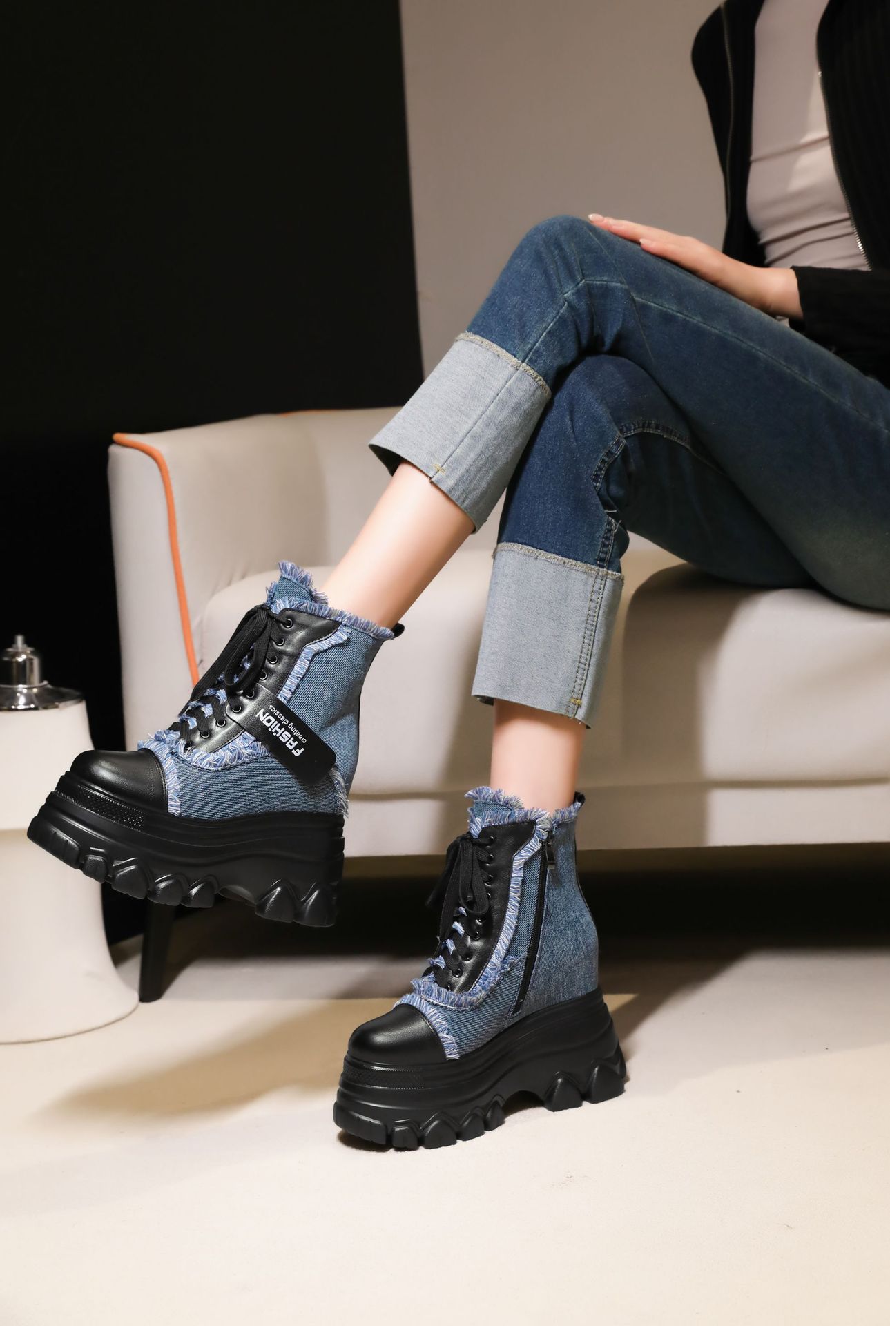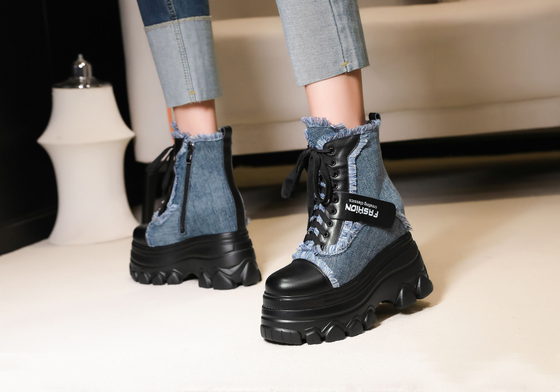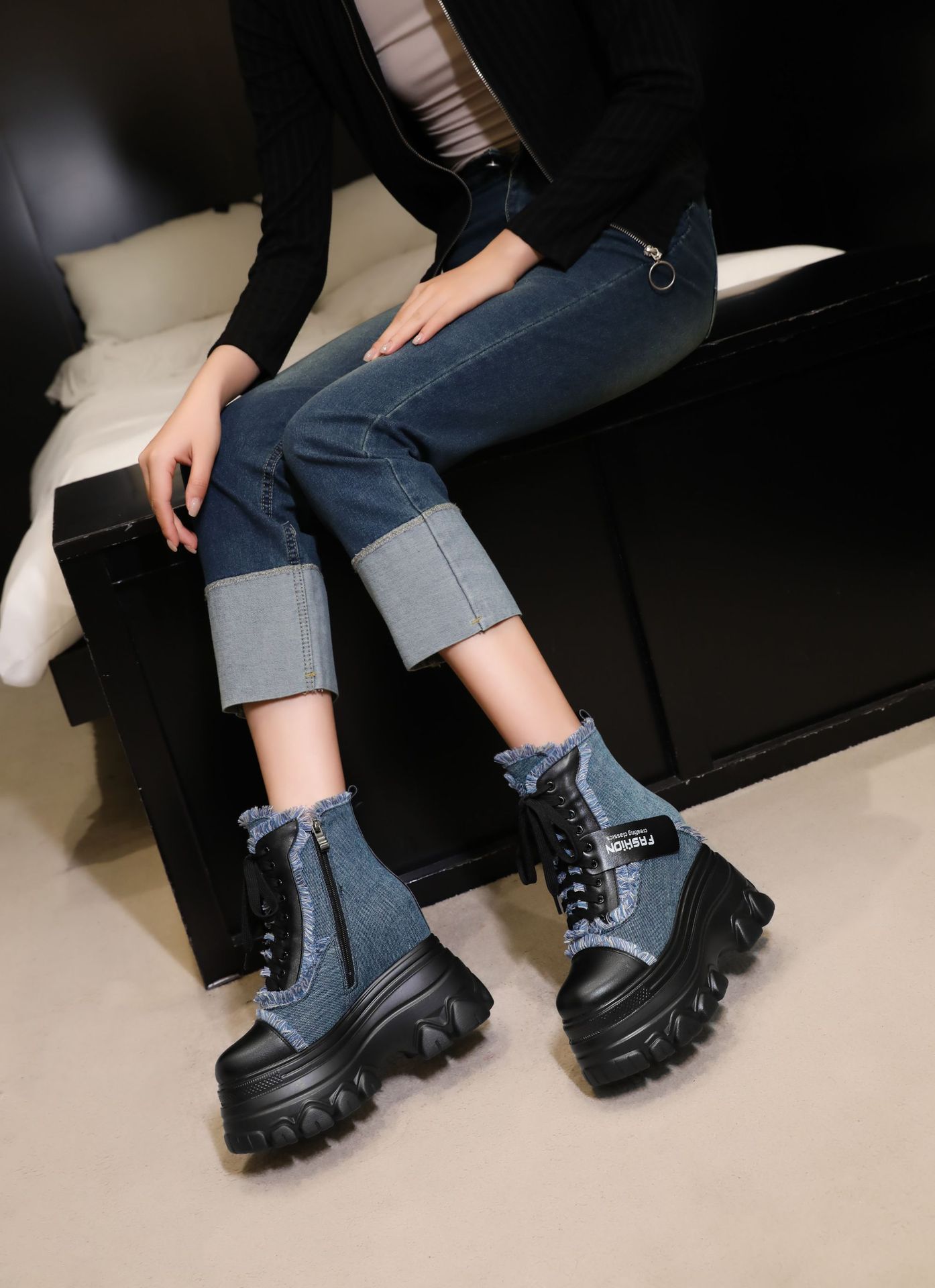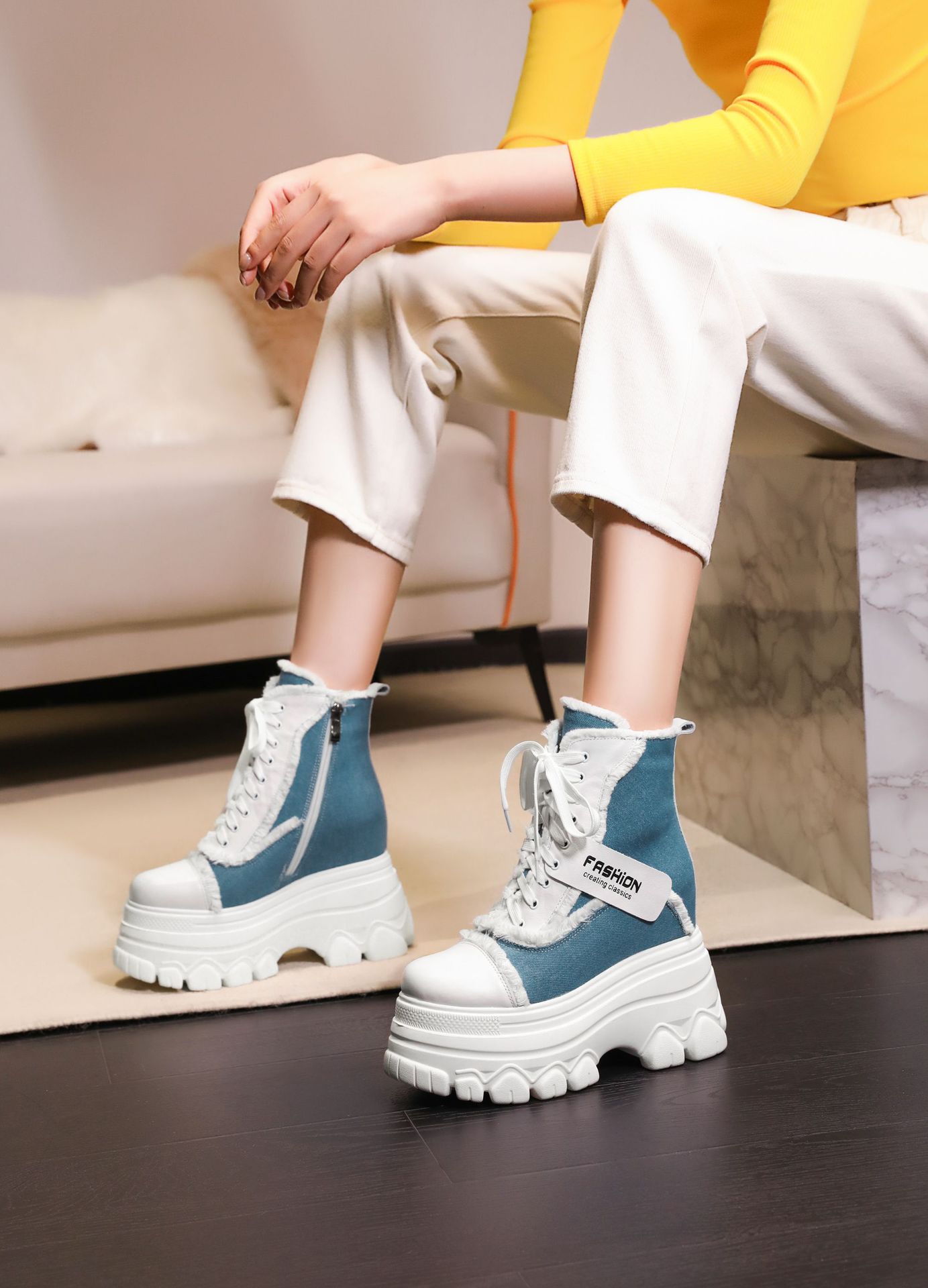 Đôi bốt ngắn này có phần đế hơi dày, giúp tăng thêm chiều cao một cách nhẹ nhàng. Kiểu dáng thiết kế nhiều màu kết hợp, cùng dây buộc phía trước mang đến vẻ ngoài trẻ trung, năng động. Sản phẩm phù hợp để diện trong mùa thu đông, kết hợp cùng nhiều loại trang phục khác nhau. Bạn chỉ cần xỏ chân vào, kéo chỉnh dây cho vừa vặn và thắt nút cẩn thận là có thể sử dụng ngay. | Tên sản phẩm: Boot Cổ Thấp Nữ Cao 12cm Tăng Chiều Cao Đế Cao Hàng Mùa Xuân Thu Đông - Giày Dép Nữ | Mã sản phẩm: C1299 - Giá: 3.400.000đ | Mã nhà sản xuất: QIDNG-G06Hình ảnh sản phẩm