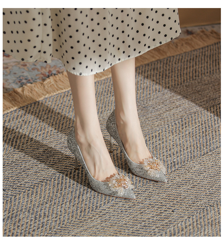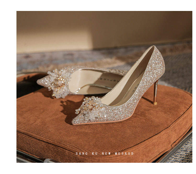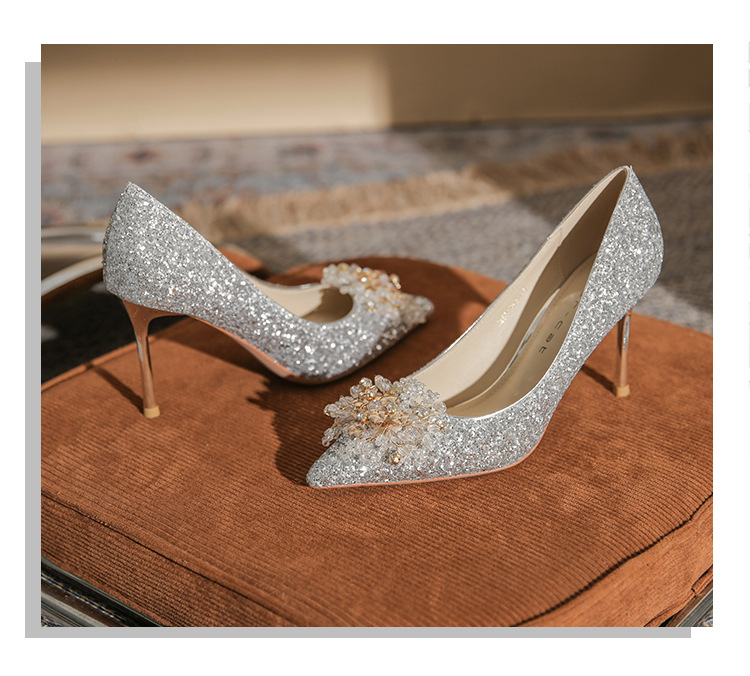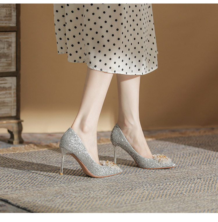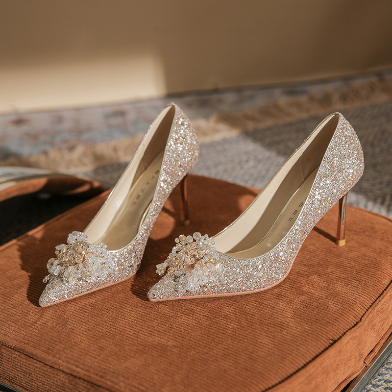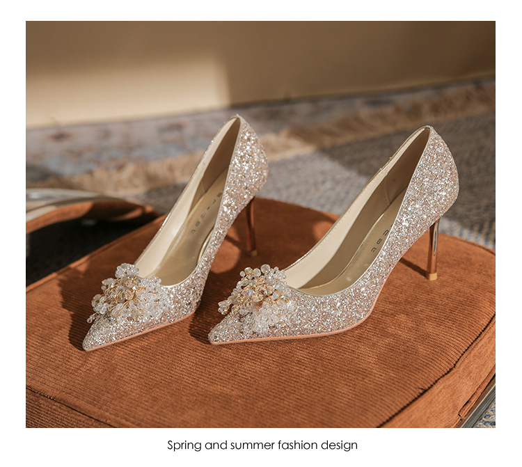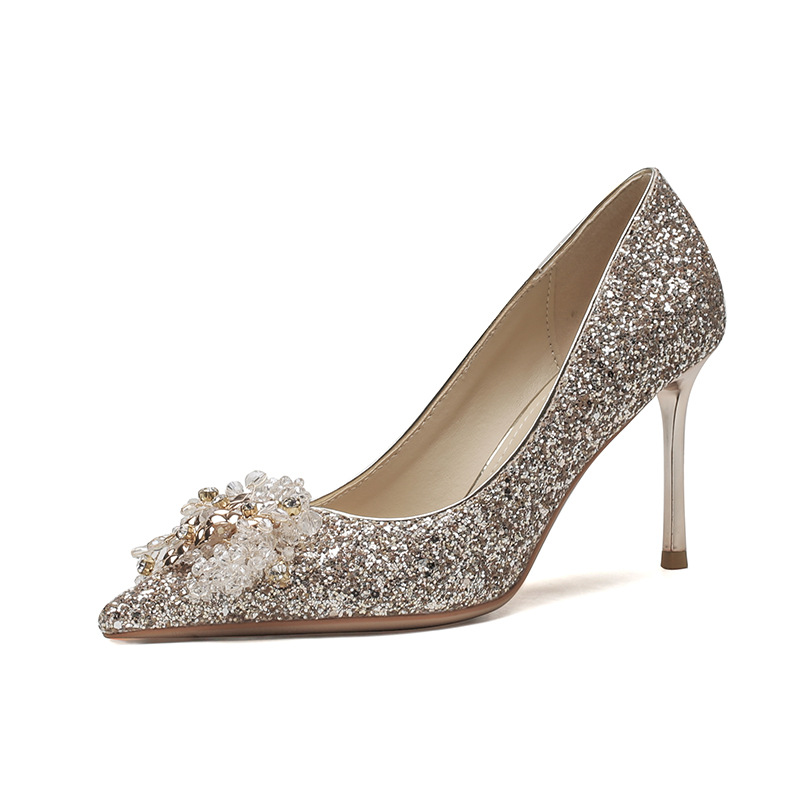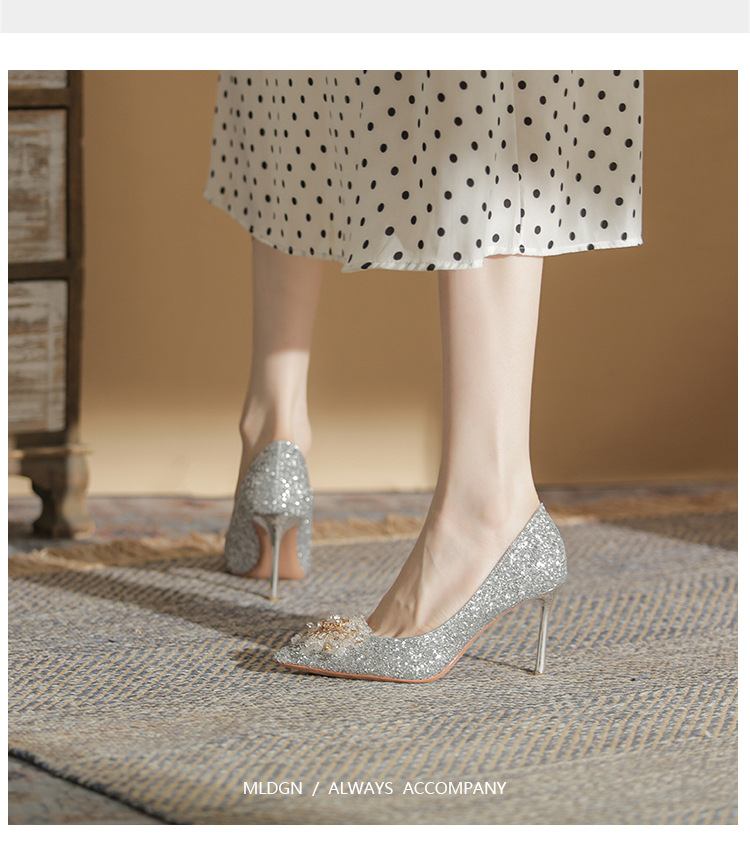 Đôi giày cao gót này có mũi nhọn thanh thoát, phong cách thiết kế theo kiểu dáng Pháp. Thân giày được điểm xuyết bằng những chi tiết ánh kim lấp lánh, tạo nên vẻ đẹp nổi bật. Phần gót được thiết kế tỉ mỉ, giúp nâng đỡ bàn chân một cách vững chãi. Sản phẩm thích hợp để mang trong các buổi tiệc hoặc dùng làm giày cho cô dâu, phù hợp đi cùng các bộ trang phục dự tiệc. Khi sử dụng, nên chọn cỡ vừa vặn và đi những bước nhẹ nhàng để cảm thấy thoải mái. | Tên sản phẩm: Giày Cao Gót Nữ Mũi Nhọn Gót Nhọn Dùng Trong Lễ Cưới - Giày Dép Nữ | Mã sản phẩm: D0268 - Giá: 1.090.000đ | Mã nhà sản xuất: HUDS-G03Hình ảnh sản phẩm
