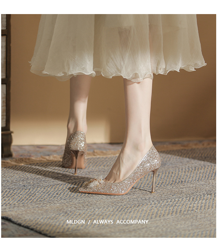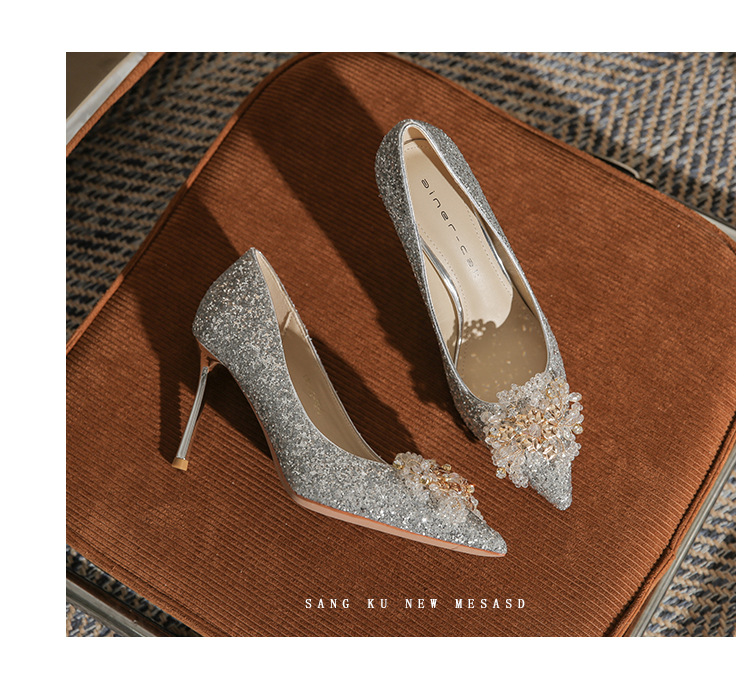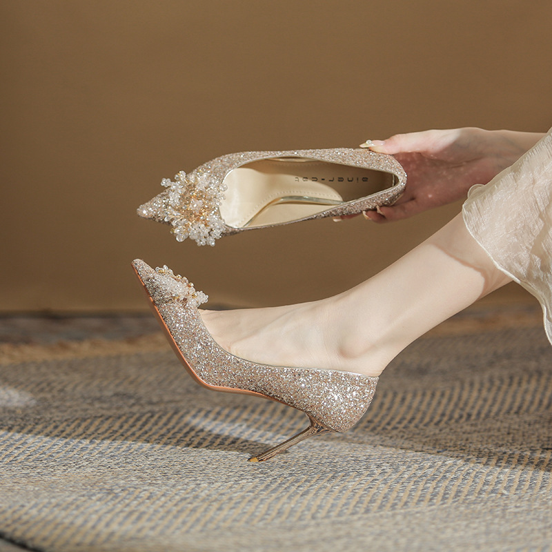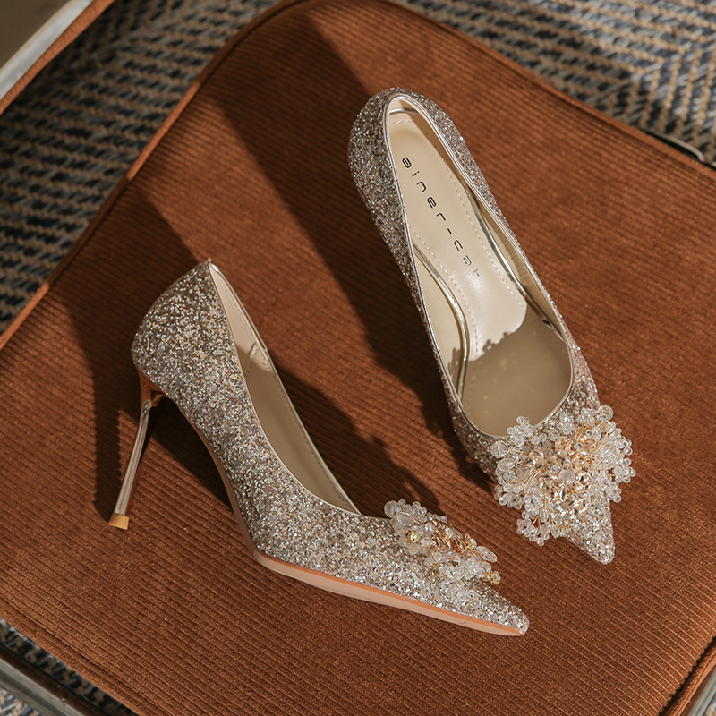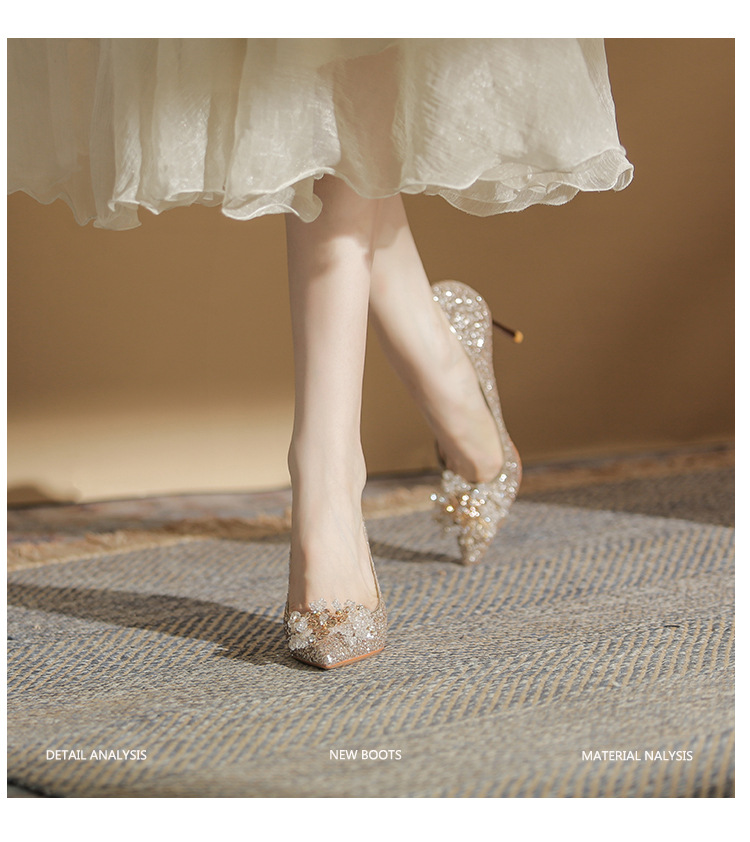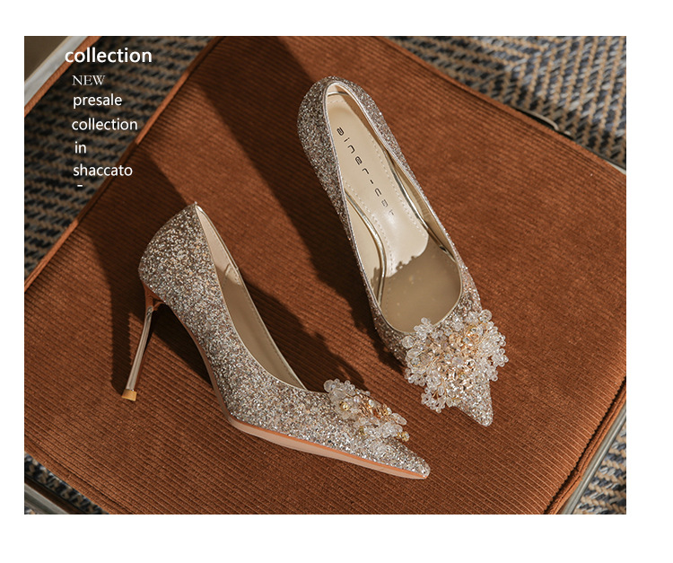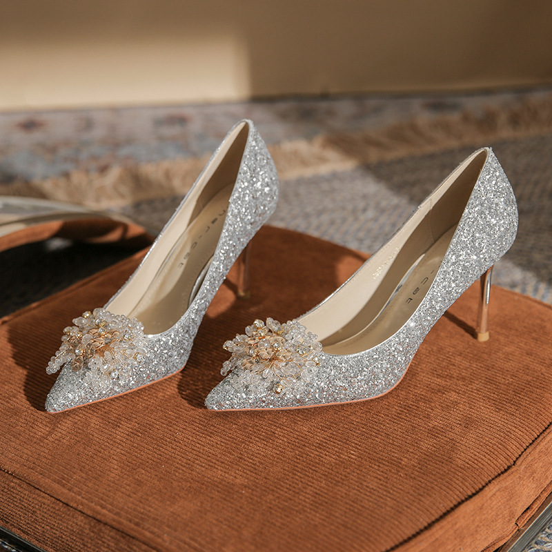 Đôi giày cao gót này có mũi nhọn thanh thoát, phong cách thiết kế theo kiểu dáng Pháp. Thân giày được điểm xuyết bằng những chi tiết ánh kim lấp lánh, tạo nên vẻ đẹp nổi bật. Phần gót được thiết kế tỉ mỉ, giúp nâng đỡ bàn chân một cách vững chãi. Sản phẩm thích hợp để mang trong các buổi tiệc hoặc dùng làm giày cho cô dâu, phù hợp đi cùng các bộ trang phục dự tiệc. Khi sử dụng, nên chọn cỡ vừa vặn và đi những bước nhẹ nhàng để cảm thấy thoải mái. | Tên sản phẩm: Giày Cao Gót Nữ Mũi Nhọn Gót Nhọn Dùng Trong Lễ Cưới - Giày Dép Nữ | Mã sản phẩm: D0268 - Giá: 1.090.000đ | Mã nhà sản xuất: HUDS-G03Hình ảnh sản phẩm
