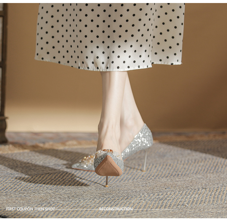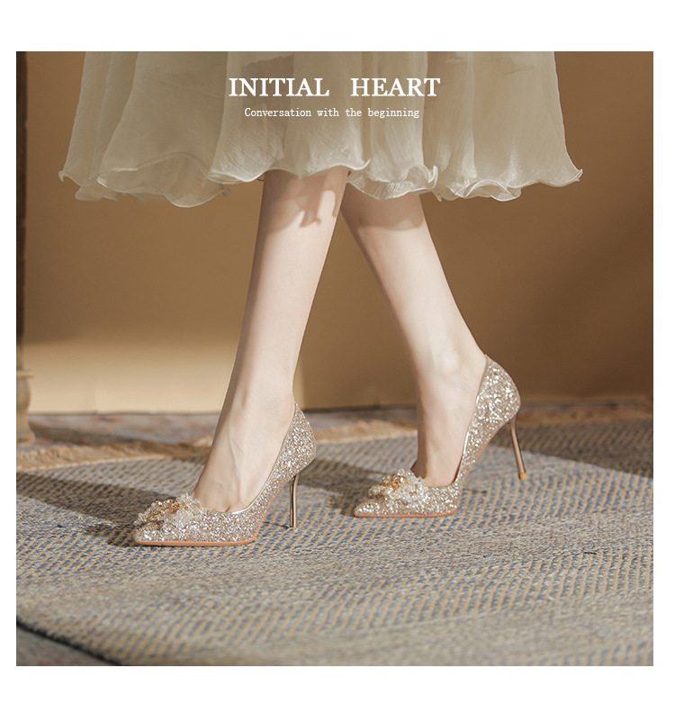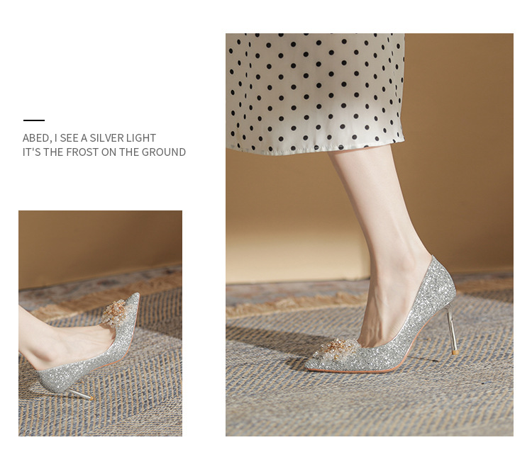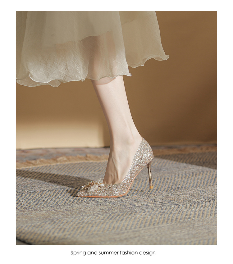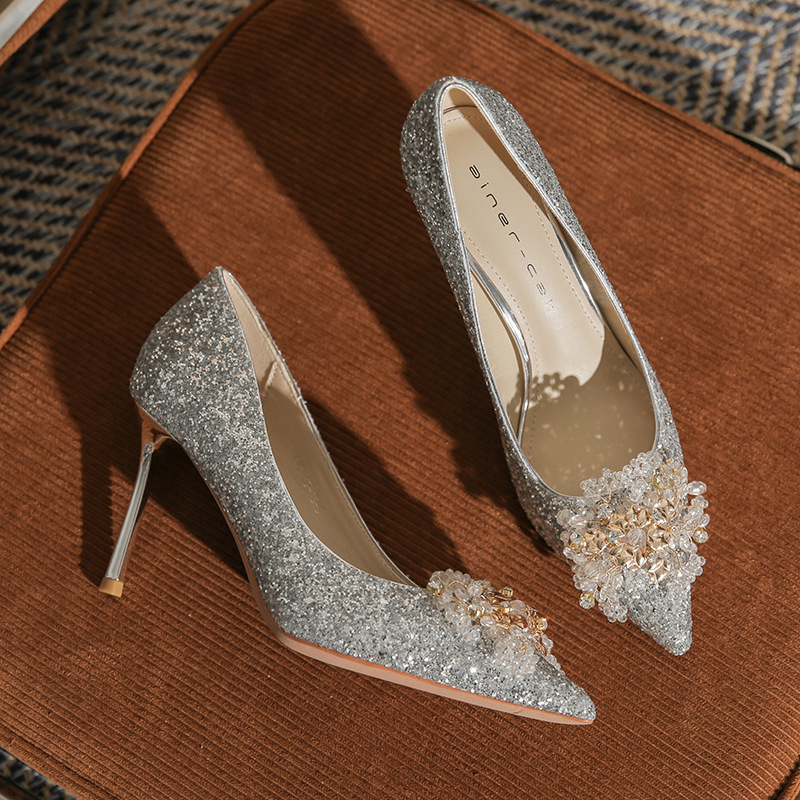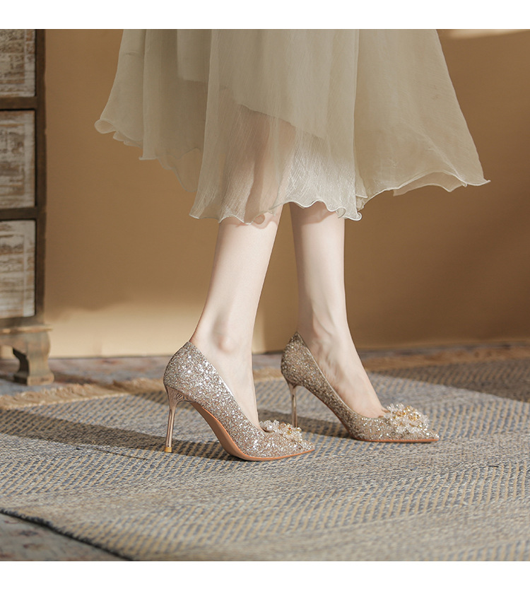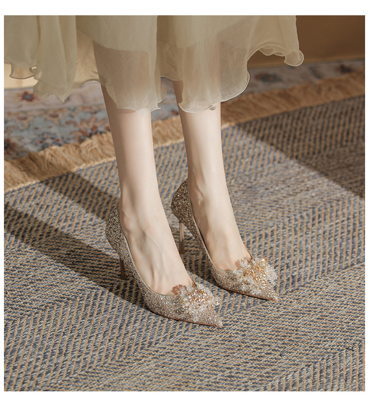 Đôi giày cao gót này có mũi nhọn thanh thoát, phong cách thiết kế theo kiểu dáng Pháp. Thân giày được điểm xuyết bằng những chi tiết ánh kim lấp lánh, tạo nên vẻ đẹp nổi bật. Phần gót được thiết kế tỉ mỉ, giúp nâng đỡ bàn chân một cách vững chãi. Sản phẩm thích hợp để mang trong các buổi tiệc hoặc dùng làm giày cho cô dâu, phù hợp đi cùng các bộ trang phục dự tiệc. Khi sử dụng, nên chọn cỡ vừa vặn và đi những bước nhẹ nhàng để cảm thấy thoải mái. | Tên sản phẩm: Giày Cao Gót Nữ Mũi Nhọn Gót Nhọn Dùng Trong Lễ Cưới - Giày Dép Nữ | Mã sản phẩm: D0268 - Giá: 1.090.000đ | Mã nhà sản xuất: HUDS-G03Hình ảnh sản phẩm