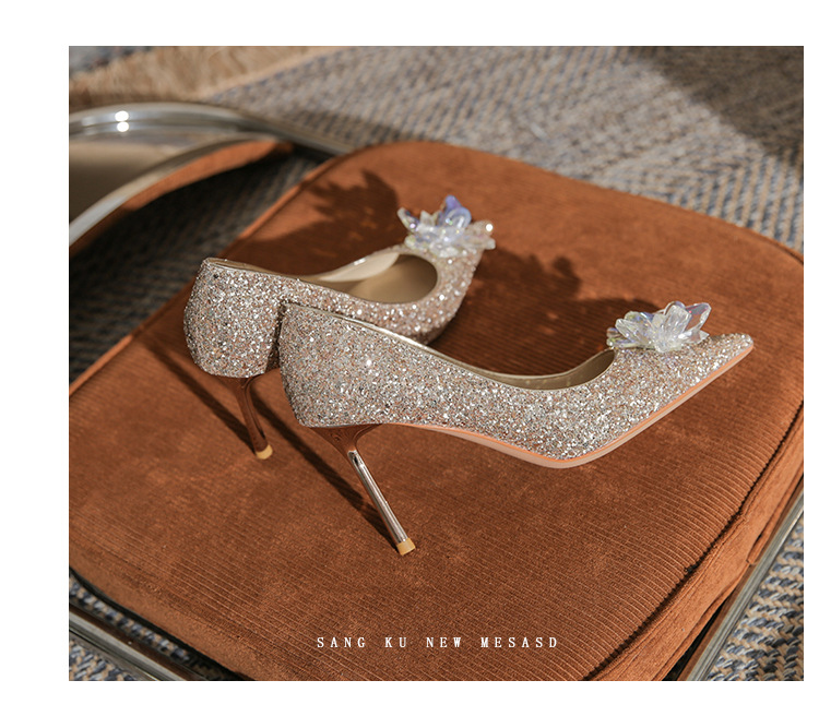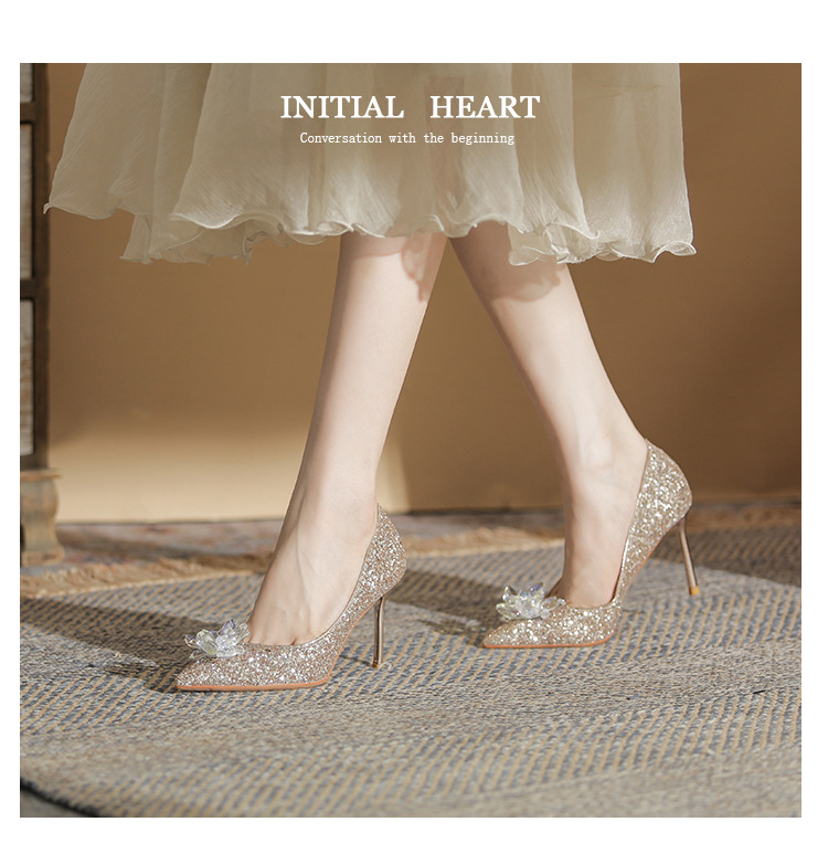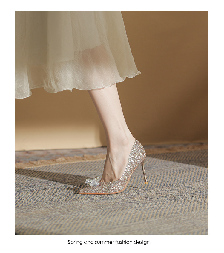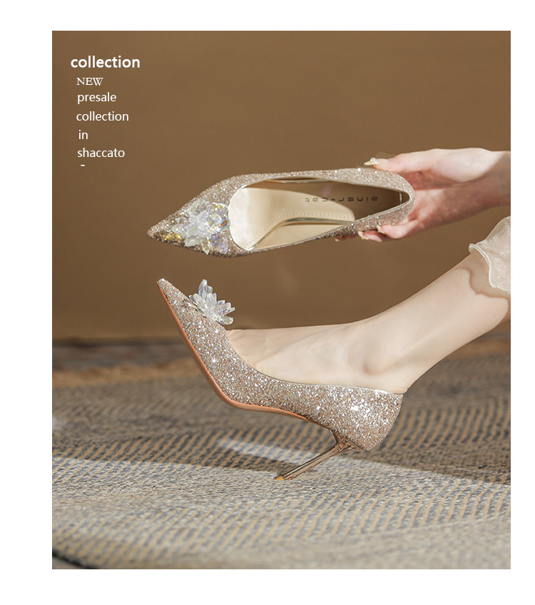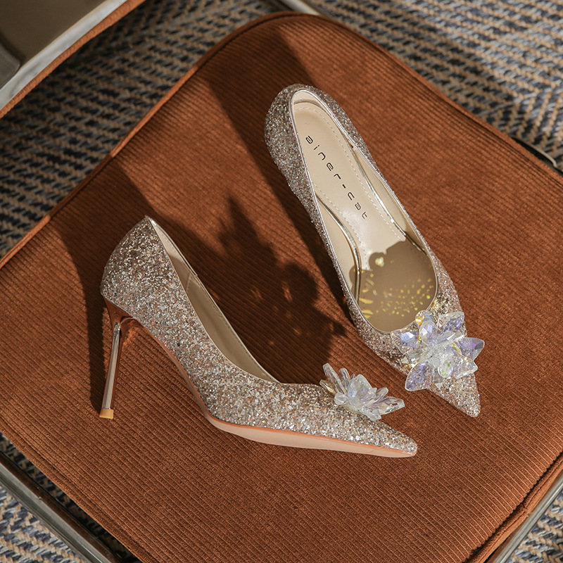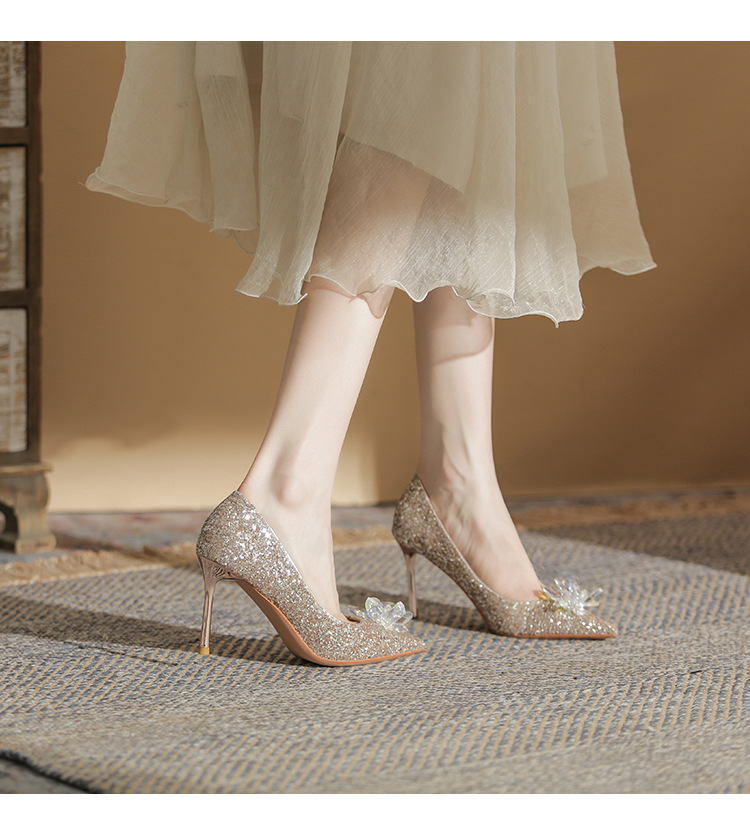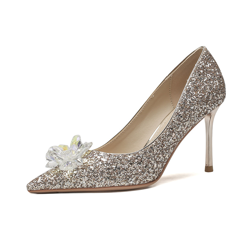 Giày cao gót nữ với mũi nhọn thanh thoát, kiểu dáng mới năm 2022. Phong cách thiết kế mang hơi hướng Pháp tinh tế, điểm nhấn là chi tiết pha lê ánh vàng lấp lánh phía trước. Sản phẩm phù hợp làm giày cô dâu trong ngày cưới hoặc giày cho các bạn phụ dâu. Đế cao gót mảnh giúp tôn dáng người sử dụng. Khi dùng, nên chọn size vừa vặn và tập đi lại nhẹ nhàng để làm quen với độ cao của gót. | Tên sản phẩm: Giày Cao Gót Nữ Mũi Nhọn Gót Nhọn Dùng Trong Lễ Cưới - Giày Dép Nữ | Mã sản phẩm: D0352 - Giá: 1.000.000đ | Mã nhà sản xuất: HUDS-G03Hình ảnh sản phẩm