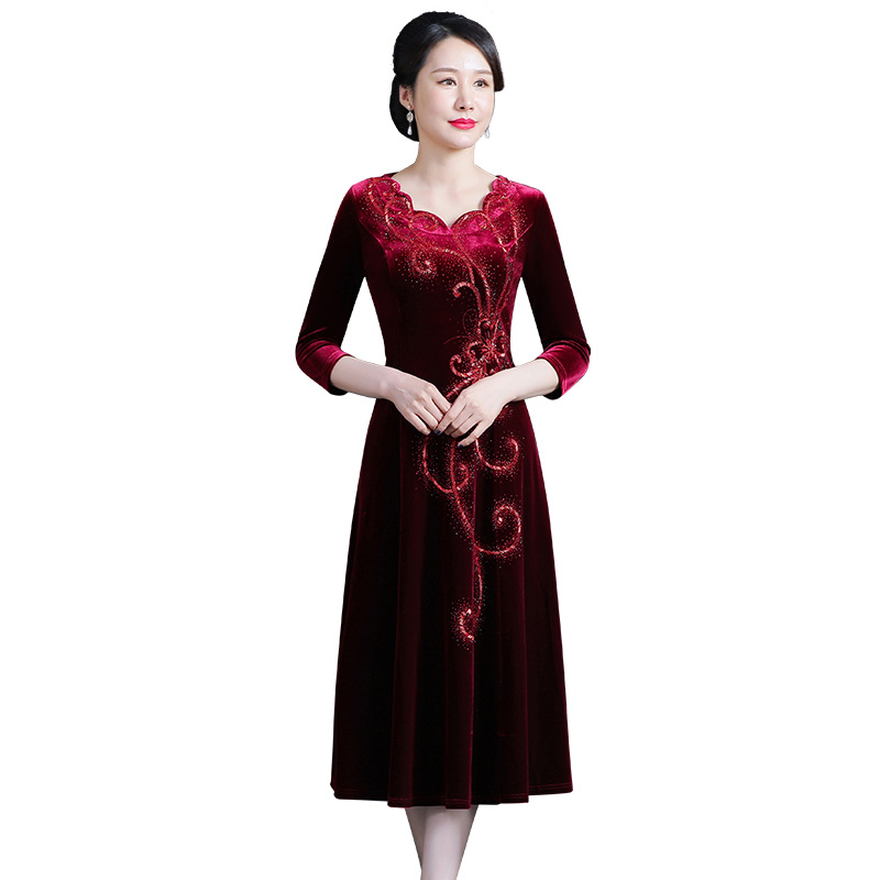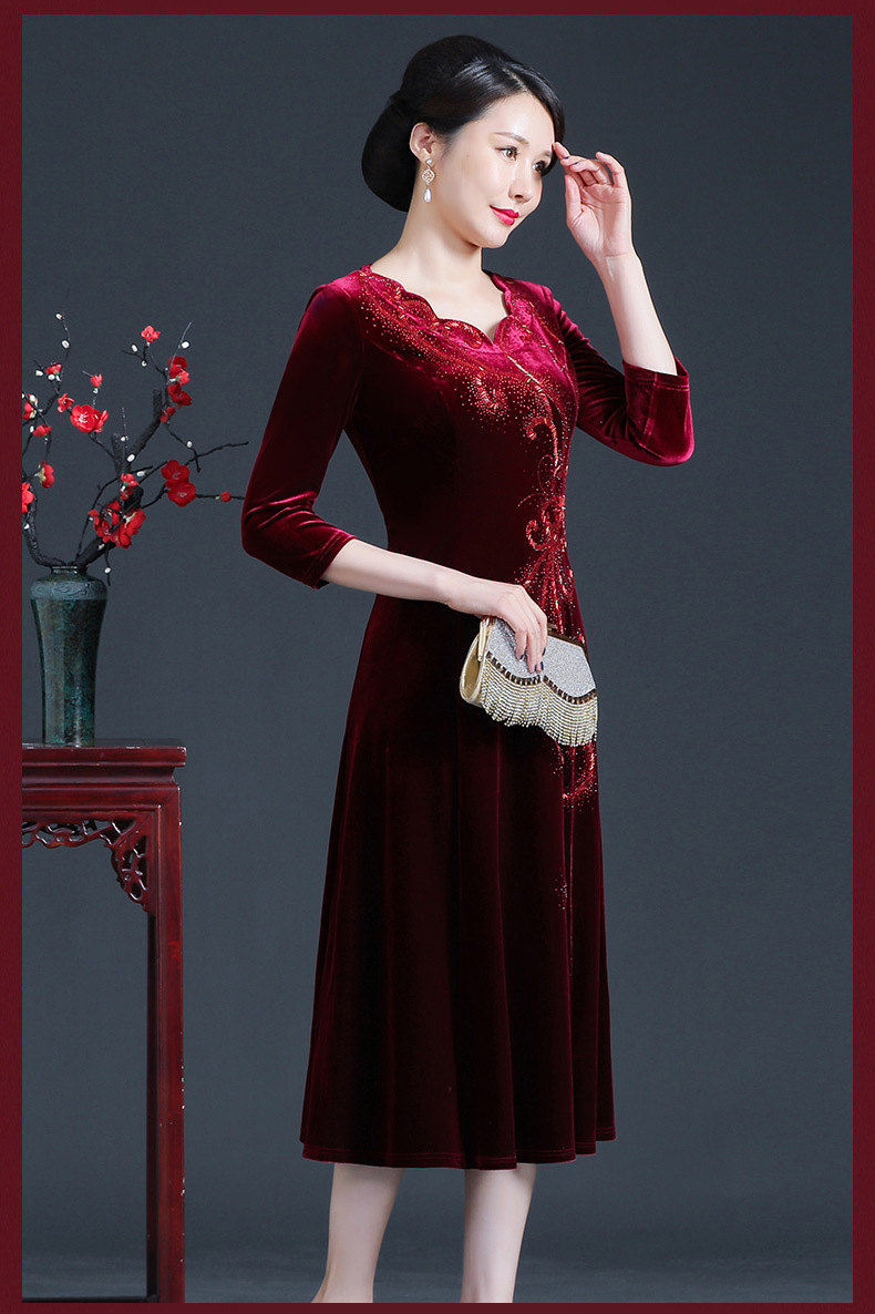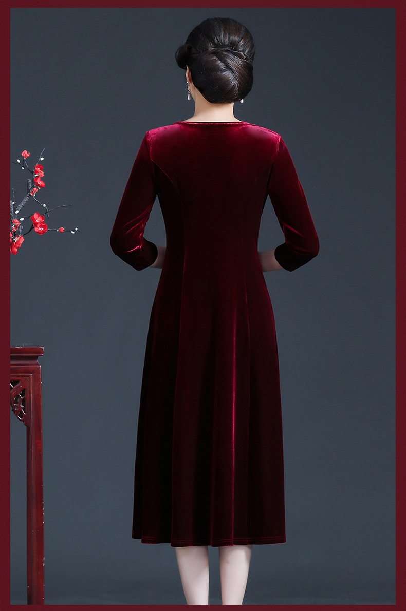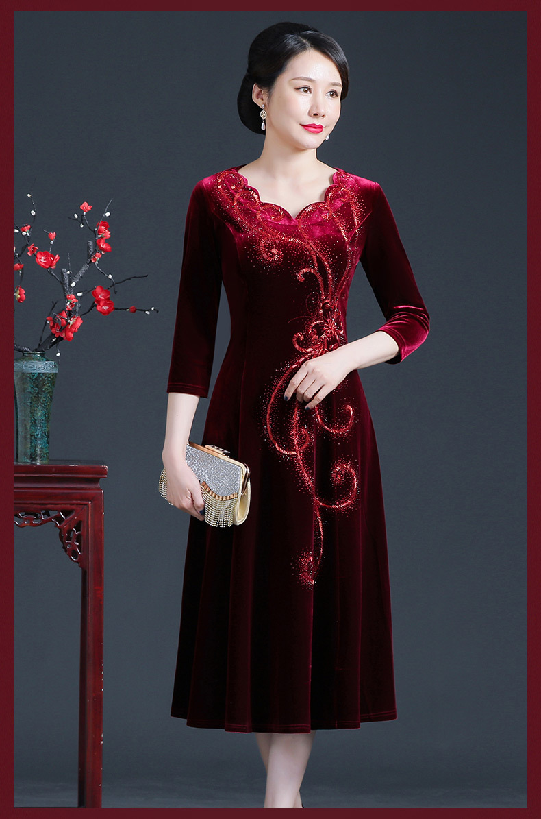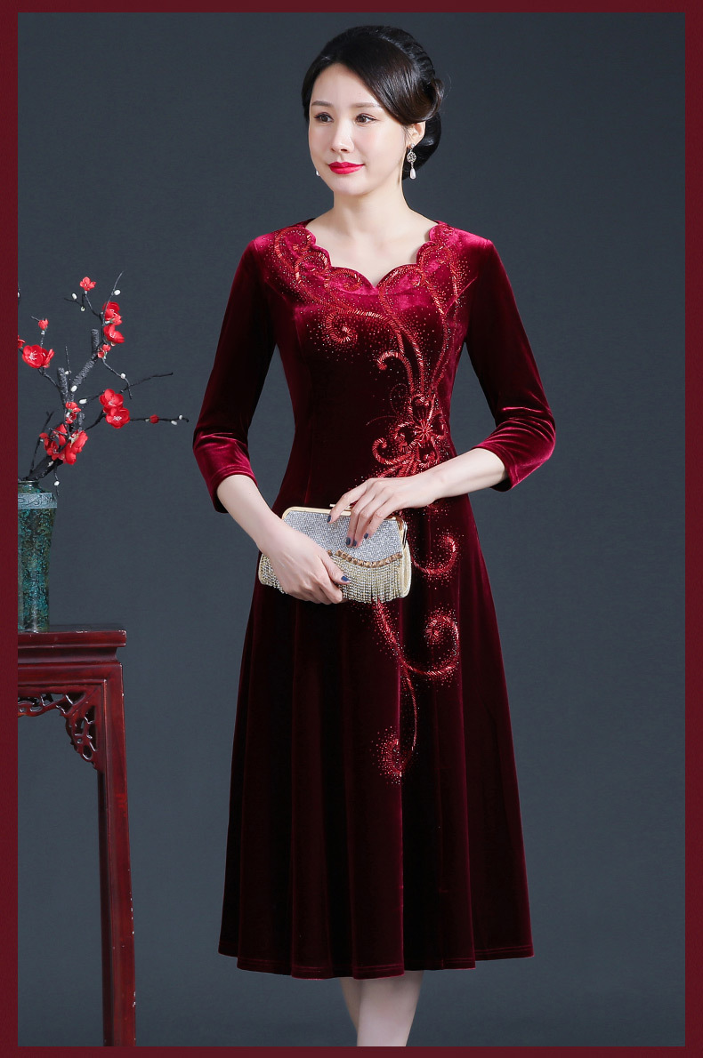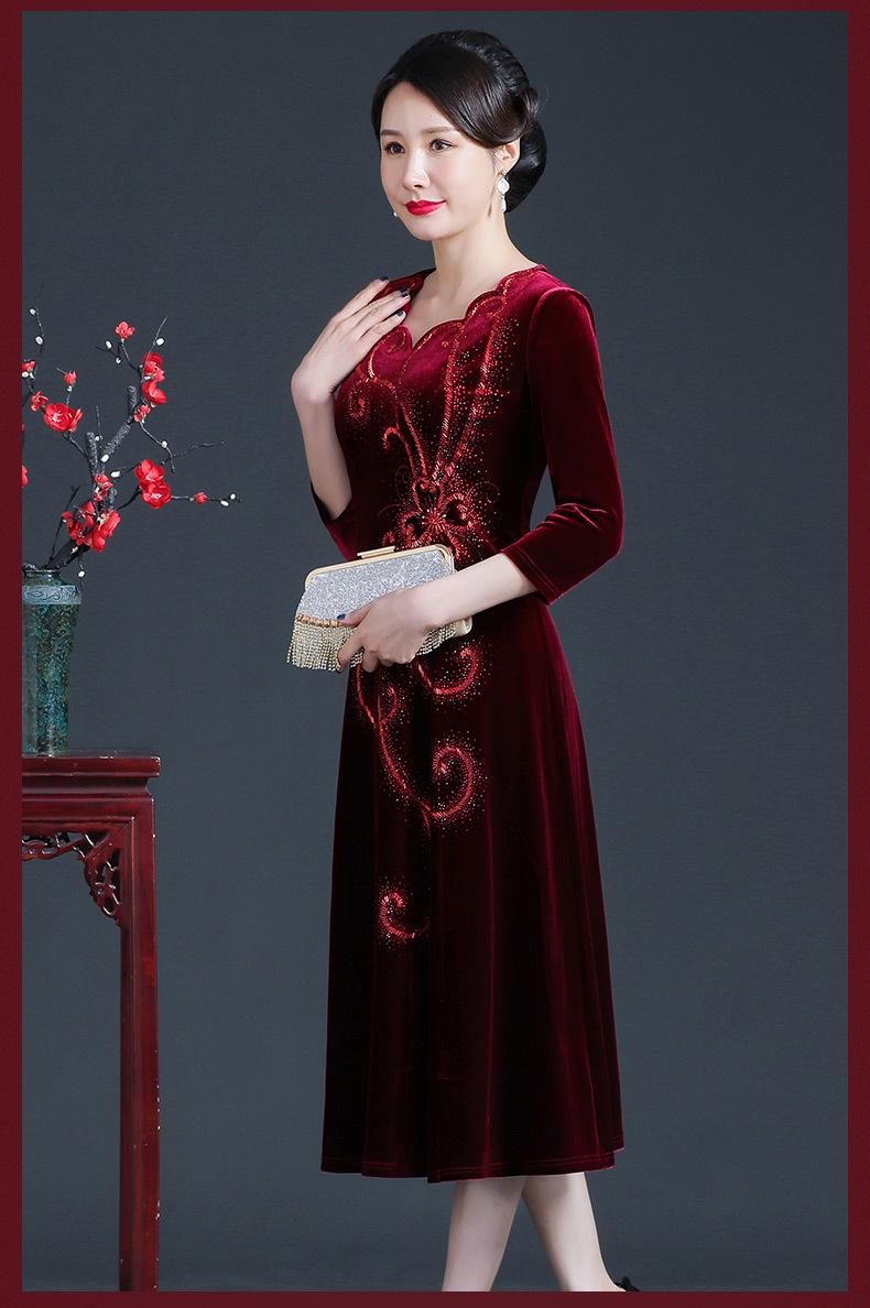 Chiếc váy dành cho các bà mẹ, được làm từ chất liệu nhung mềm mại và có ánh lụa. Thiết kế dáng dài qua gối, tôn lên vẻ đẹp dịu dàng và lịch sự. Kiểu dáng ôn hòa, phù hợp cho nhiều hoàn cảnh như dự tiệc cưới hay các buổi họp mặt. Cách sử dụng đơn giản, có thể kết hợp cùng áo khoác mỏng và phụ kiện nhẹ nhàng để hoàn thiện bộ trang phục. | Tên sản phẩm: Váy Đầm Liền Thân Nữ Hàng Mùa Xuân Thu Đông Trung Niên Dùng Trong Lễ Cưới - Thời Trang Nữ | Mã sản phẩm: D1603 - Giá: 3.330.000đ | Mã nhà sản xuất: SHDG-G06Hình ảnh sản phẩm