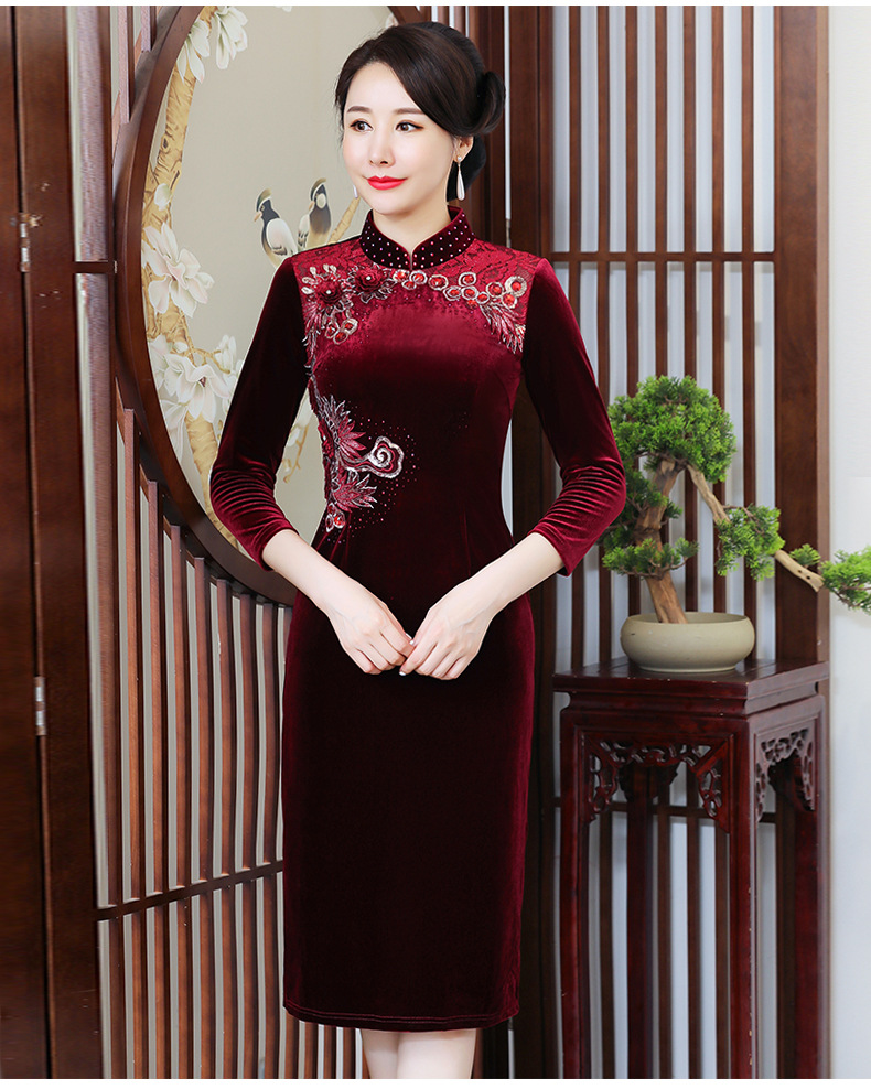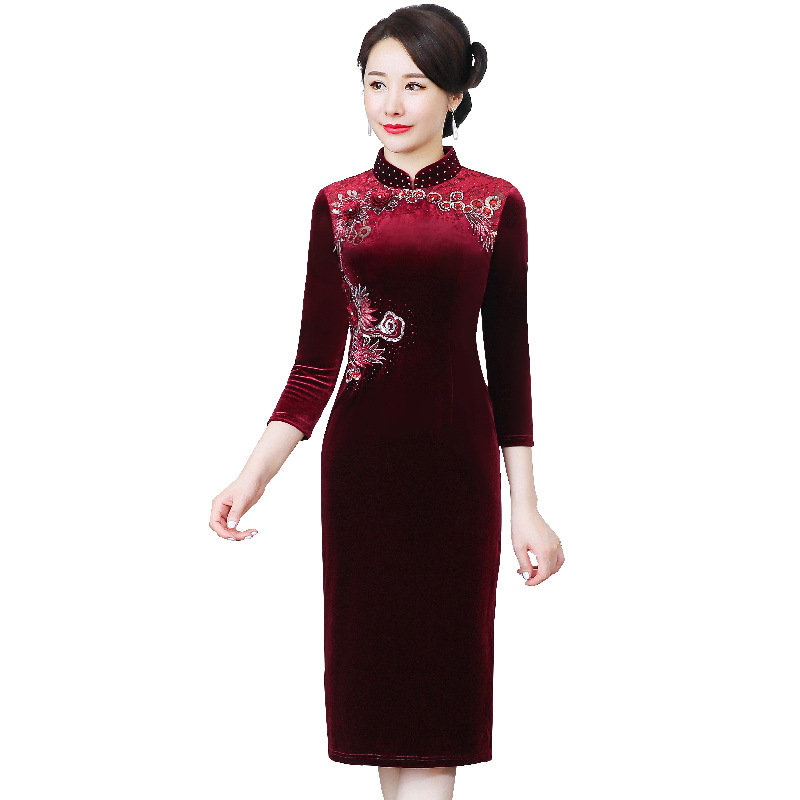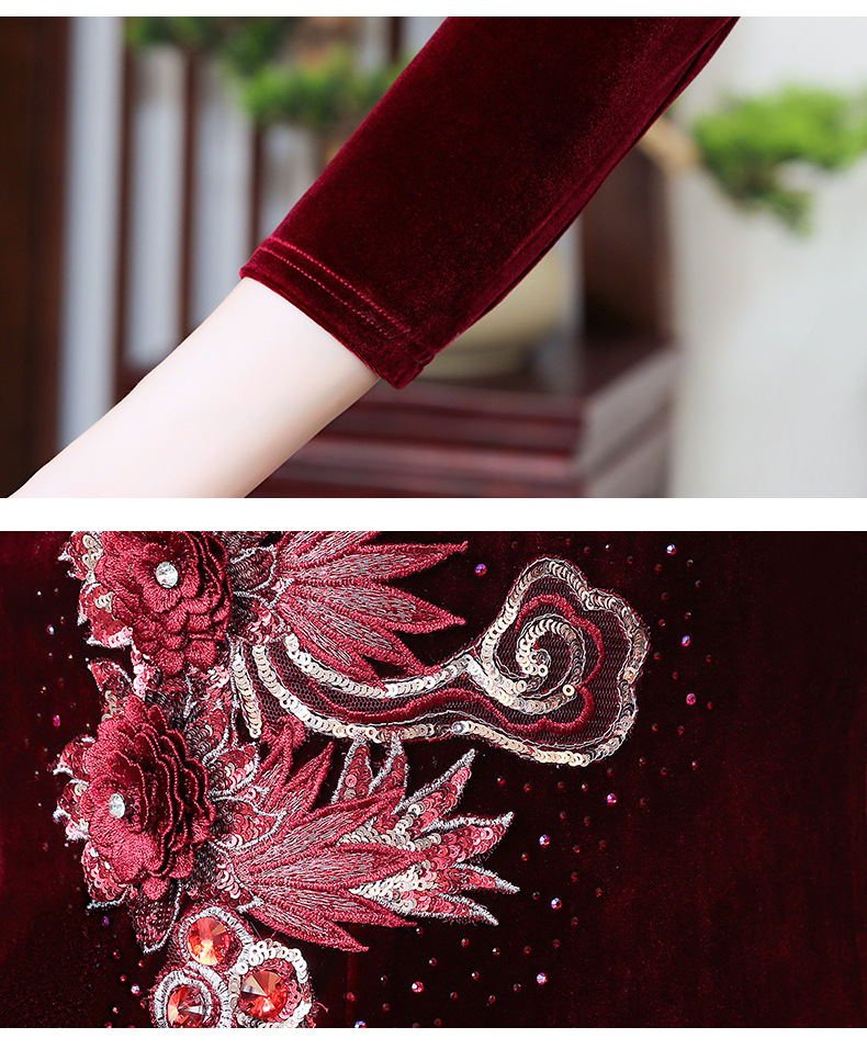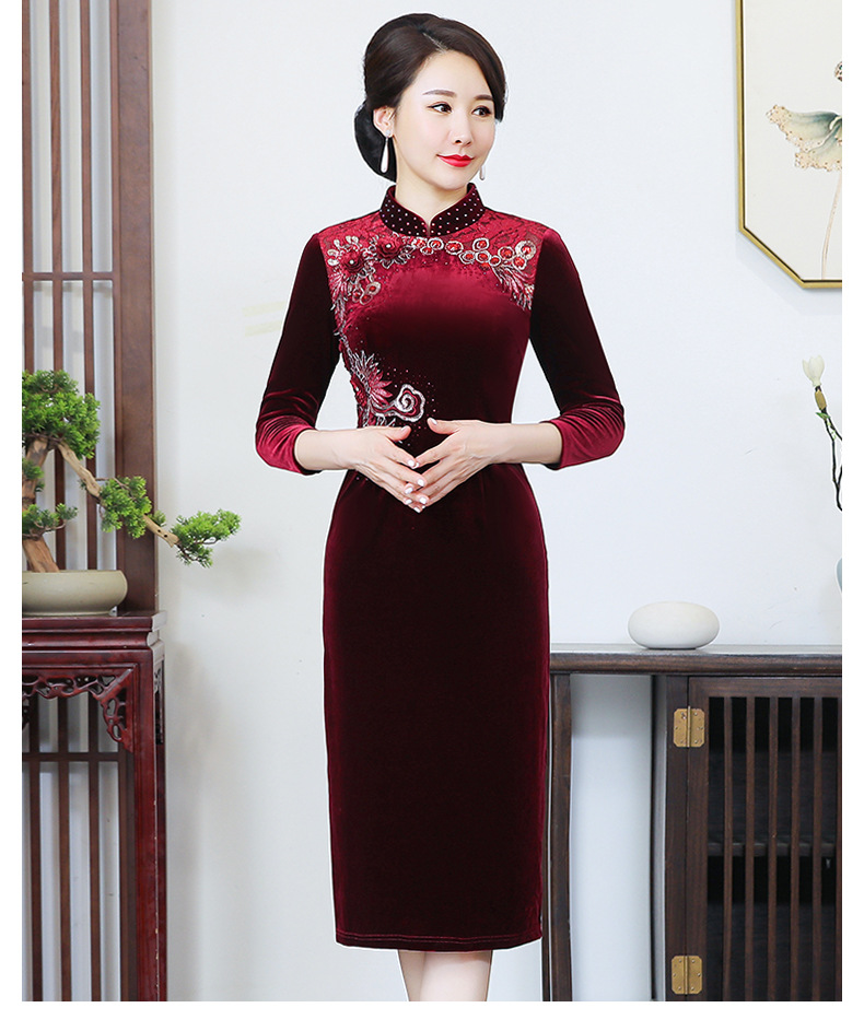 Chiếc áo dài cách tân này được làm từ chất liệu nhung mềm mại, phối cùng họa tiết thêu tay tinh xảo và điểm xuyết những hạt ngọc tr lấp lánh. Thiết kế dáng dài ôn nhu, kín đáo và rất thoải mái, phù hợp cho các dịp lễ hội, tiệc cưới. Bạn có thể mặc kết hợp cùng giày cao gót và một chiếc túm nhỏ để hoàn thiện bộ trang phục. | Tên sản phẩm: Váy Đầm Liền Thân Nữ Thêu Họa Tiết Hoa Hàng Mùa Xuân Thu Đông Trung Niên Dùng Trong Lễ Cưới - Thời Trang Nữ | Mã sản phẩm: D1624 - Giá: 3.560.000đ | Mã nhà sản xuất: SHDG-G06Hình ảnh sản phẩm