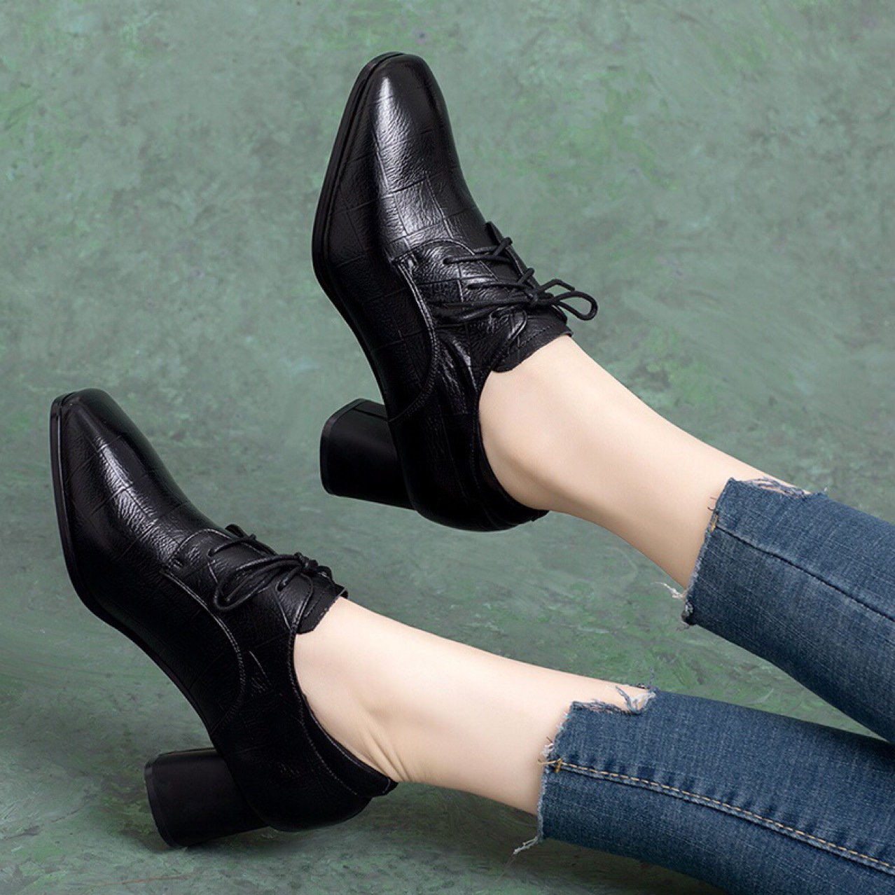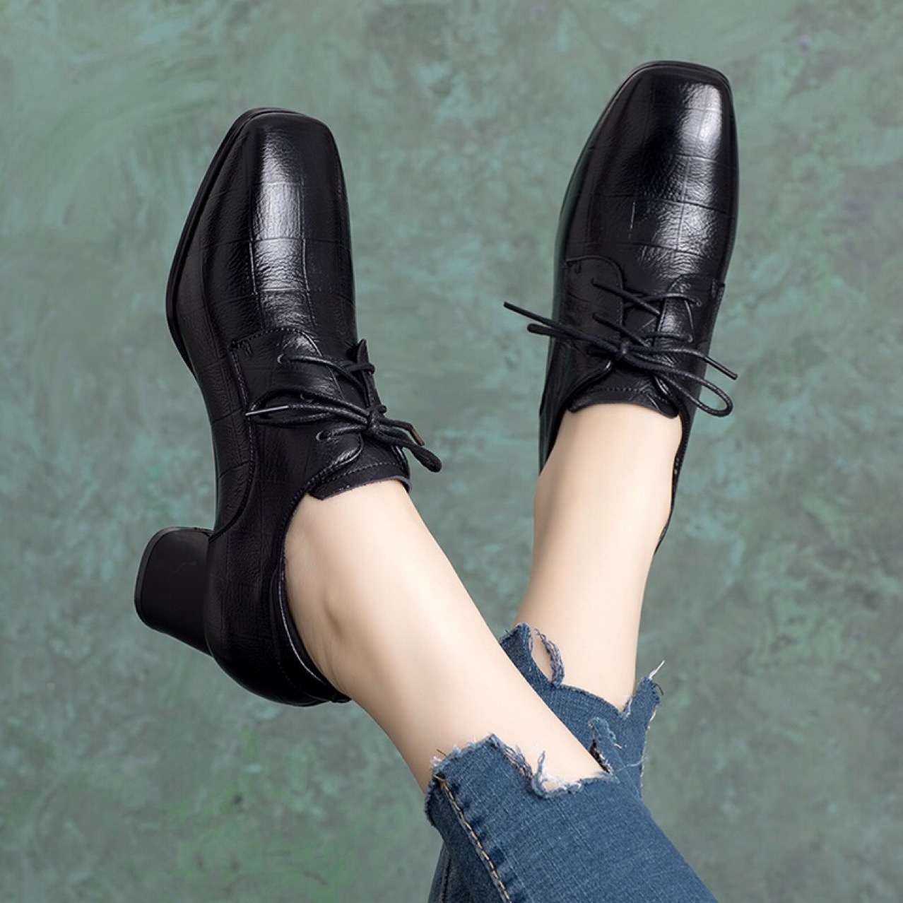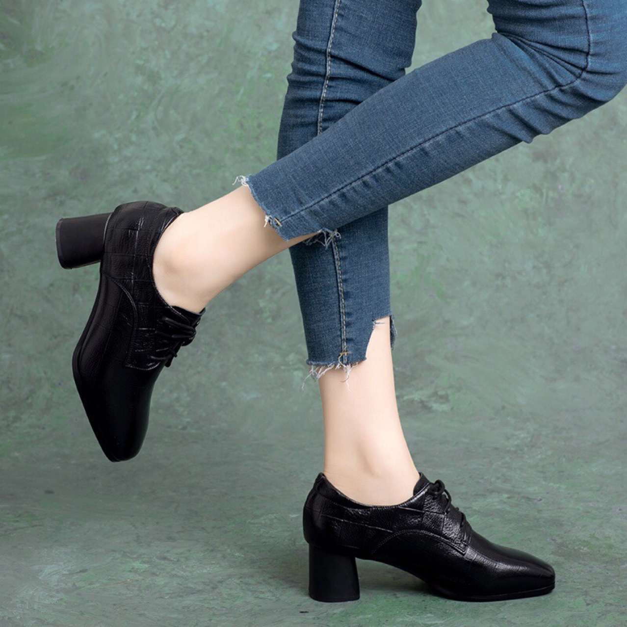 Giày búp bê nữ với thiết kế cổ sâu ôm chân, làm từ chất liệu da mềm mại. Mẫu giày có phần mũi vuông nhẹ nhàng, đi kèm qu cột nơ duyên dáng. Phần đế được thiết kế vừa phải, tạo dáng đứng và thoải mái khi di chuyển. Đây là kiểu giày dễ dàng phối cùng nhiều trang phục khác nhau như quần tây, váy liền hay jean. Bạn có thể sử dụng hằng ngày cho những dịp đi làm, đi chơi hoặc gặp mặt. | Tên sản phẩm: Giày Da Nữ Chất Liệu Da Bò Gót Vuông Hàng Mùa Xuân Thu Đông - Giày Dép Nữ | Mã sản phẩm: D6872 - Giá: 1.140.000đ | Mã nhà sản xuất: TOREHU-G04Hình ảnh sản phẩm