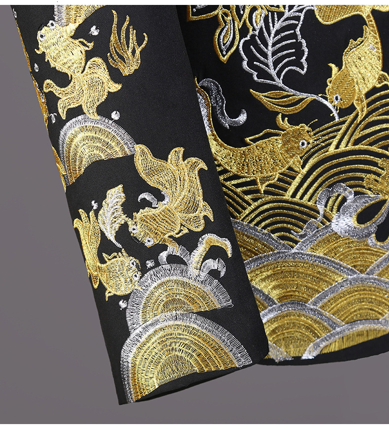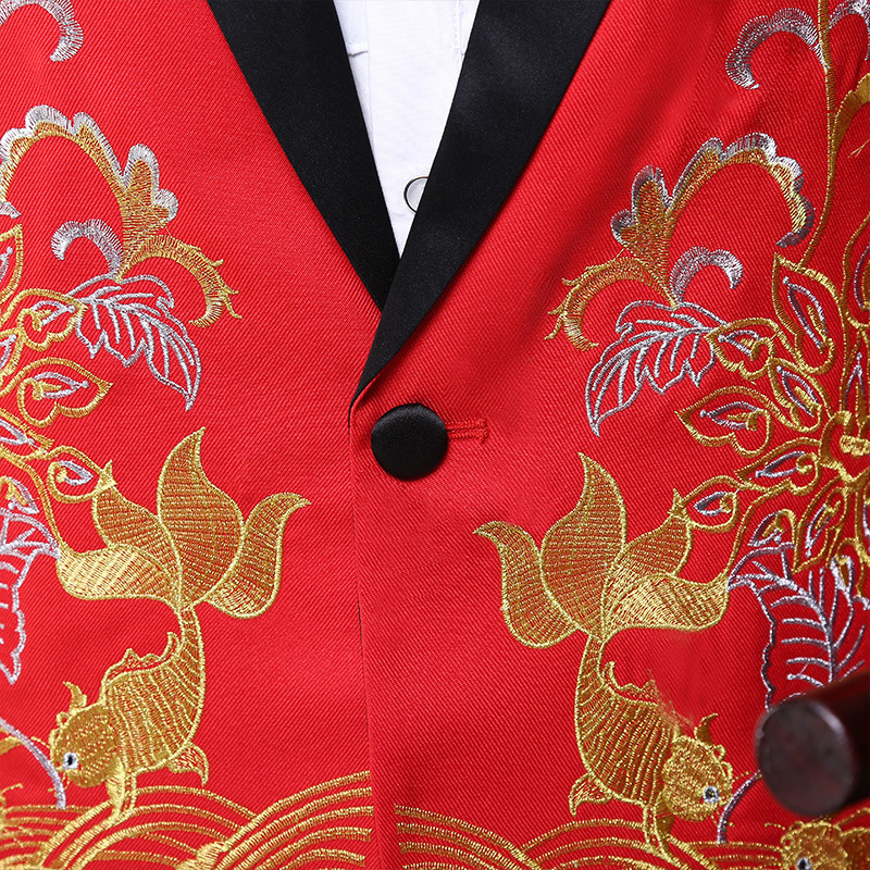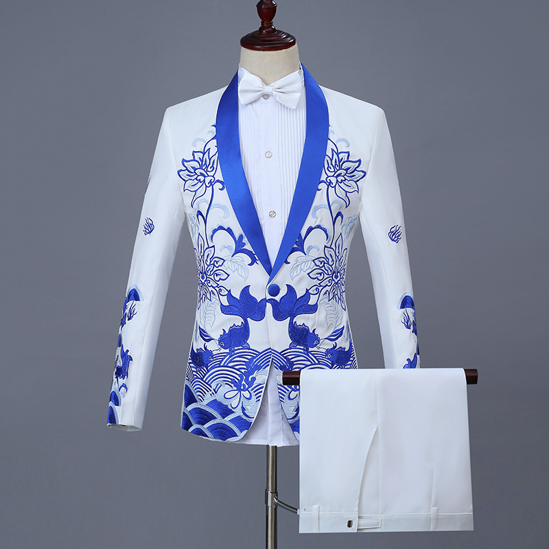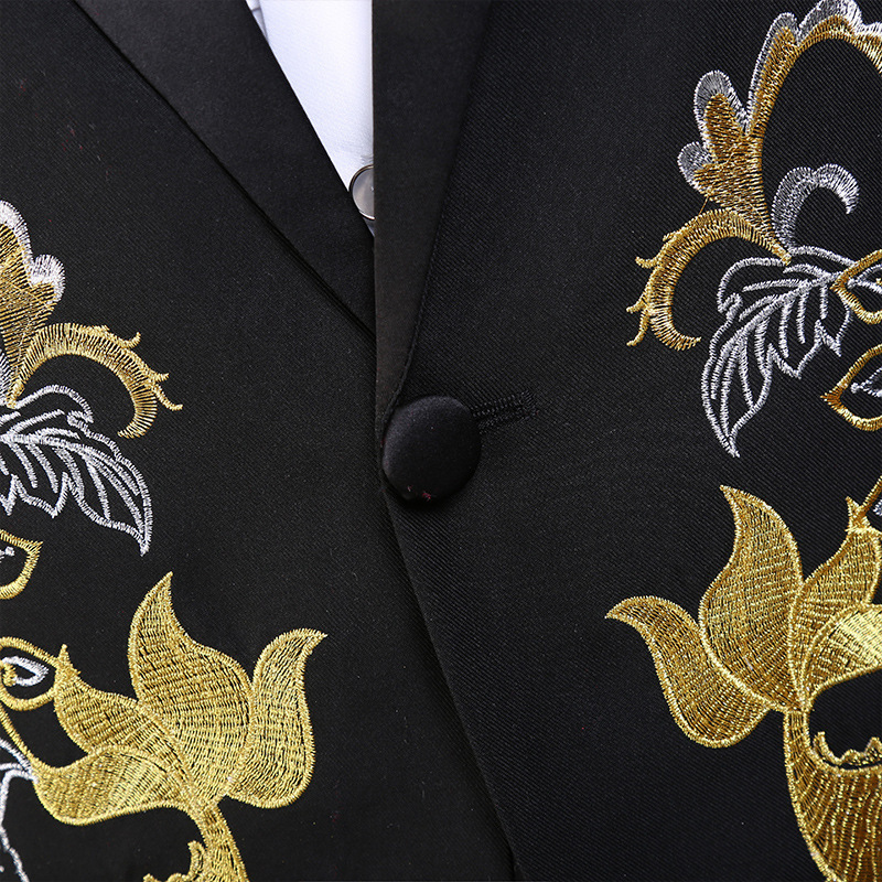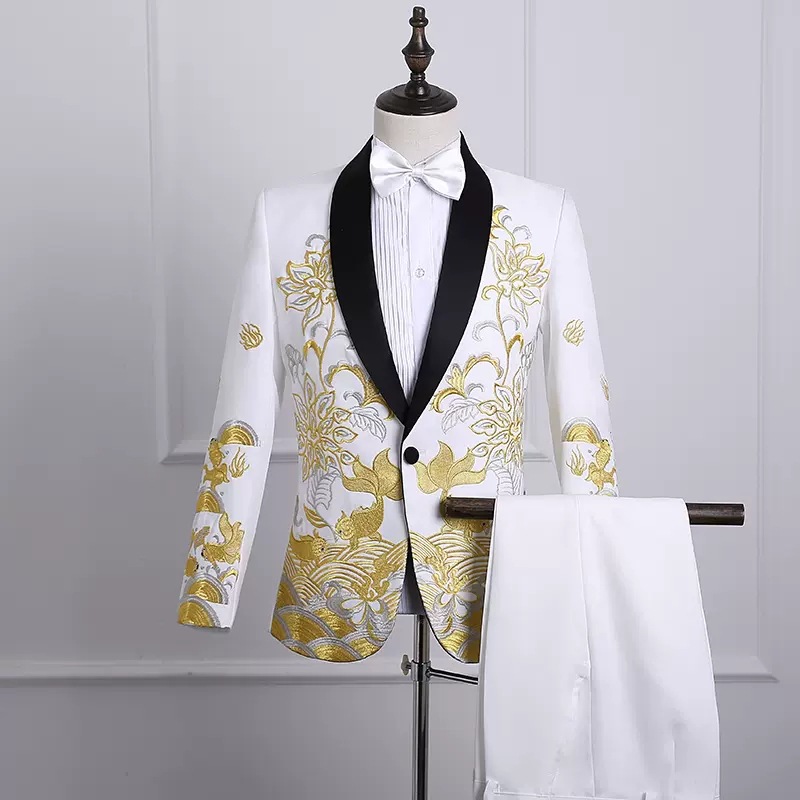 Bộ trang phục này mang phong cách hiện đại kết hợp nét đẹp truyền thống, đặc biệt phù hợp cho các dịp quan trọng. Áo khoác và quần tây được may từ chất liệu vải mềm mại, trên nền trắng tinh tế có điểm nhấn là họa tiết thêu sắc vàng tinh xảo. Sản phẩm dễ dàng phối cùng áo sơ mi trơn bên trong. Bạn có thể mặc nguyên bộ hoặc tách riêng áo khoác để tạo nhiều phong cách khác nhau. | Tên sản phẩm: Áo Vest Nam Vest Thêu Họa Tiết Hoa Dùng Trong Lễ Cưới - Thời Trang Nam | Mã sản phẩm: D7240 - Giá: 1.640.000đ | Mã nhà sản xuất: YIDAD-G05Hình ảnh sản phẩm