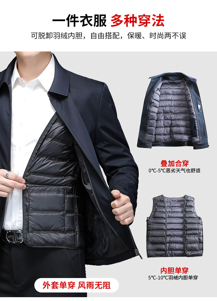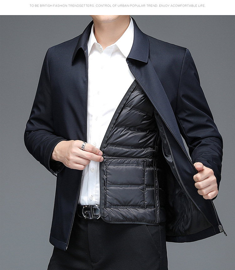 Áo khoác mùa lạnh dành cho các bậc cha, người trung niên và lớn tuổi. Sản phẩm có lớp áo bên trong bằng lông vũ có thể tháo rời, giúp giữ ấm tốt và rất tiện lợi. Chất liệu ngoài dày dặn, được lót thêm bông để tăng khả năng chống rét. Kiểu dáng đơn giản, dễ mặc và phù hợp cho các sinh hoạt hằng ngày. Có thể dùng như áo khoác ba lớp khi trời rất lạnh hoặc dùng riêng lớp áo ngoài khi thời tiết dịu mát hơn. | Tên sản phẩm: Áo Khoác Nam Chất Liệu Vải Bông Dày Ấm Hàng Mùa Xuân Thu Đông Trung Niên - Thời Trang Nam | Mã sản phẩm: E4991 - Giá: 1.970.000đ | Mã nhà sản xuất: SUDAP-G05Hình ảnh sản phẩm