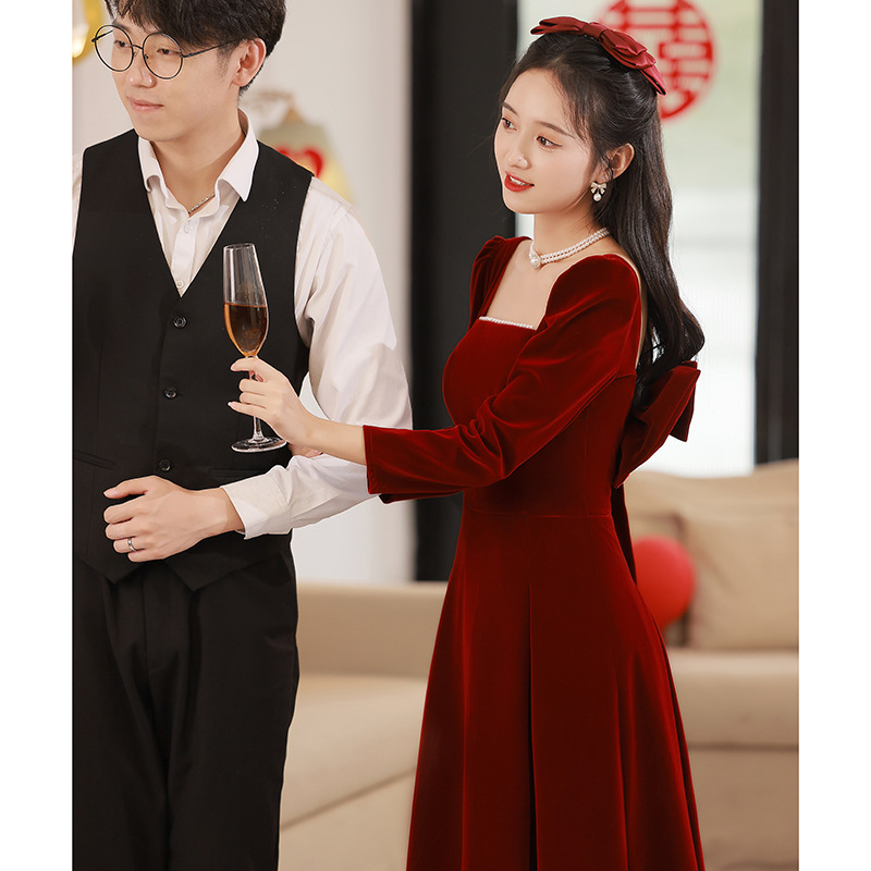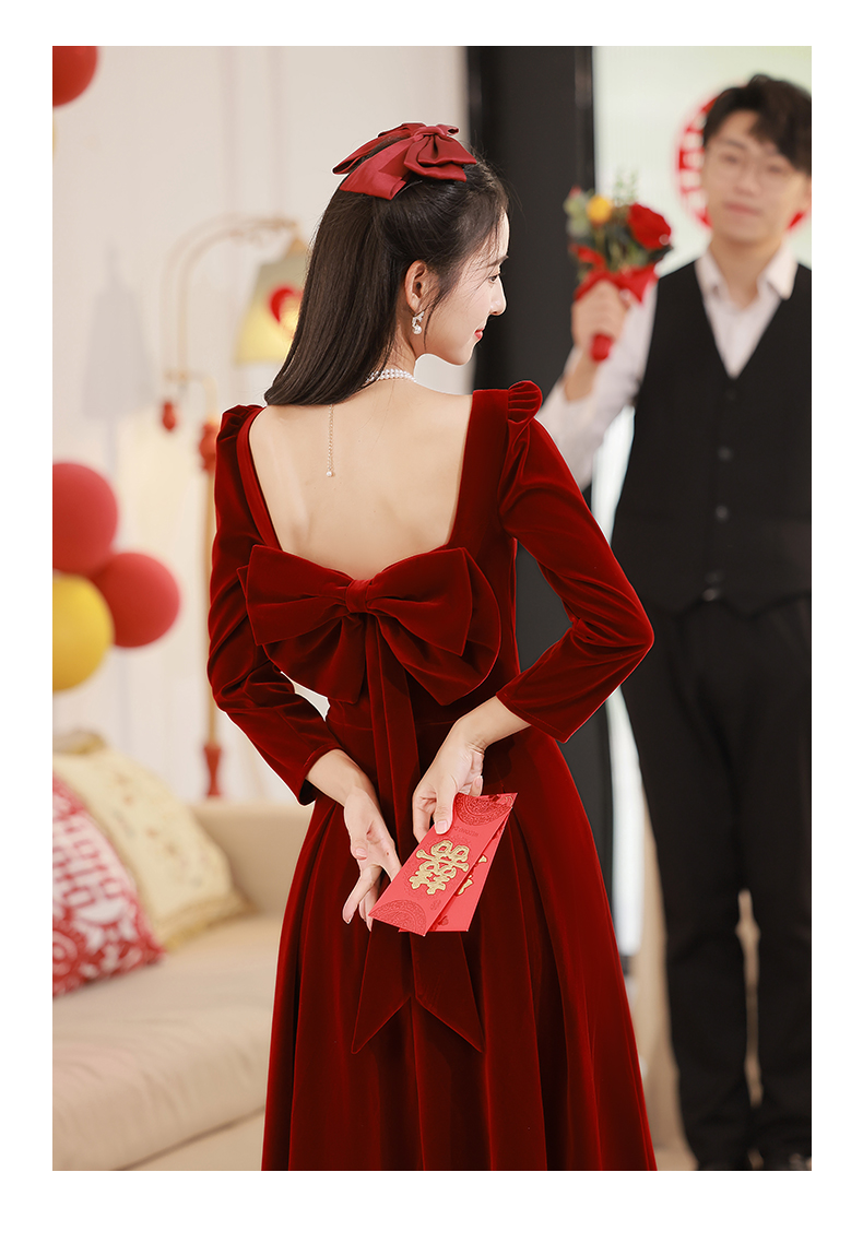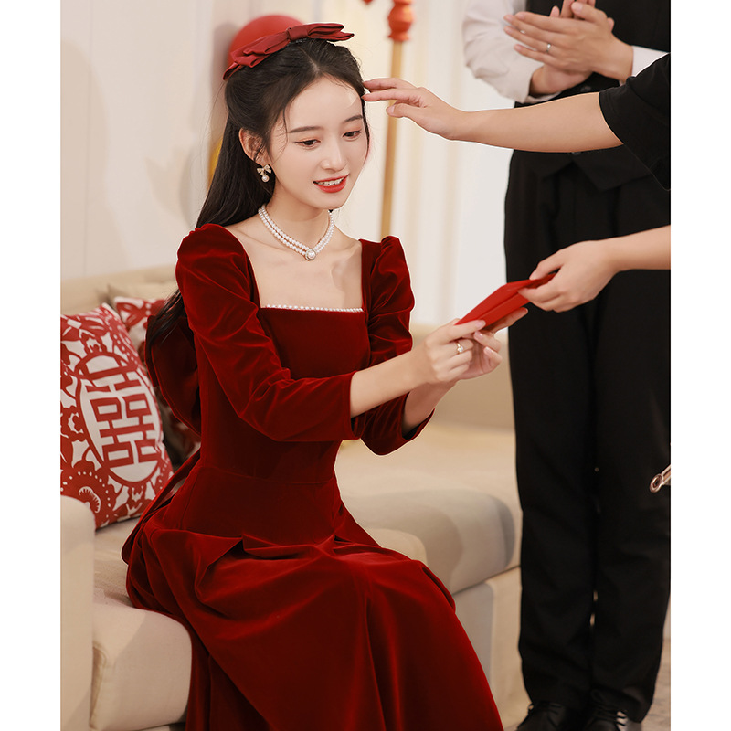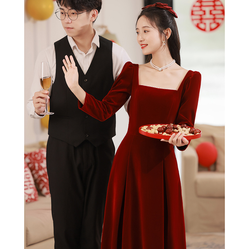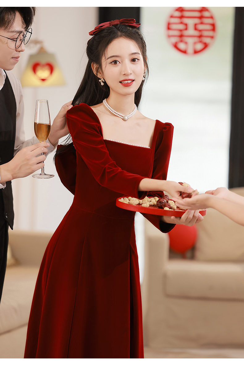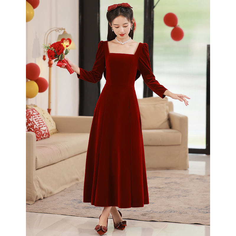Chiếc đầm dành cho cô dâu trong những buổi tiệc thân mật hay dịp về thăm nhà. Thiết kế tay dài với chất vải mềm mại, ấm áp, rất phù hợp cho thời tiết mùa thu đông. Màu rượu vang đậm tôn lên vẻ dịu dàng và nổi bật. Kiểu dáng ôn hòa, dễ mặc, có thể dùng trong các buổi gặp mặt gia đình, tiệc mừng nhỏ. Một lựa chọn nhã nhặn và phù hợp cho các dịp quan trọng. | Tên sản phẩm: Váy Đầm Liền Thân Dự Tiệc Nữ Dài Tay Hàng Mùa Xuân Thu Đông Dùng Trong Lễ Cưới - Thời Trang Nữ | Mã sản phẩm: E6285 - Giá: 1.380.000đ | Mã nhà sản xuất: GUREBE-G04Hình ảnh sản phẩm
