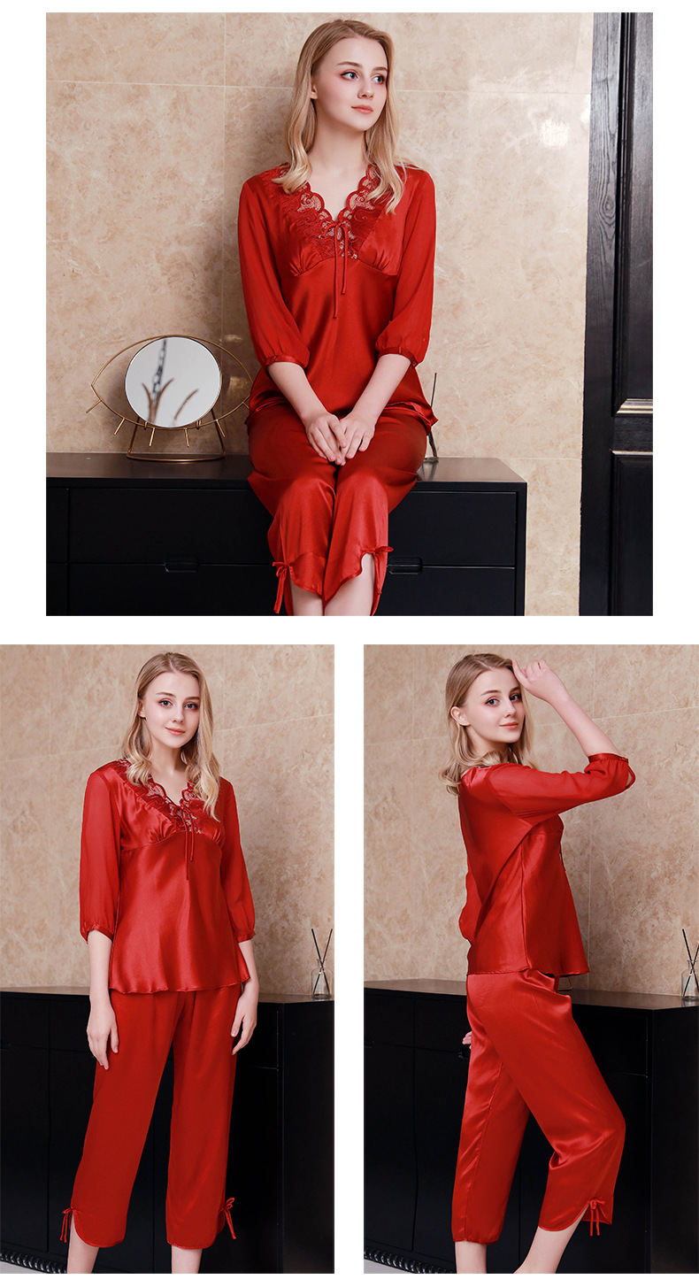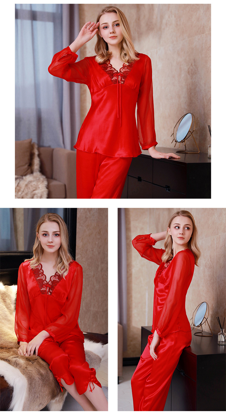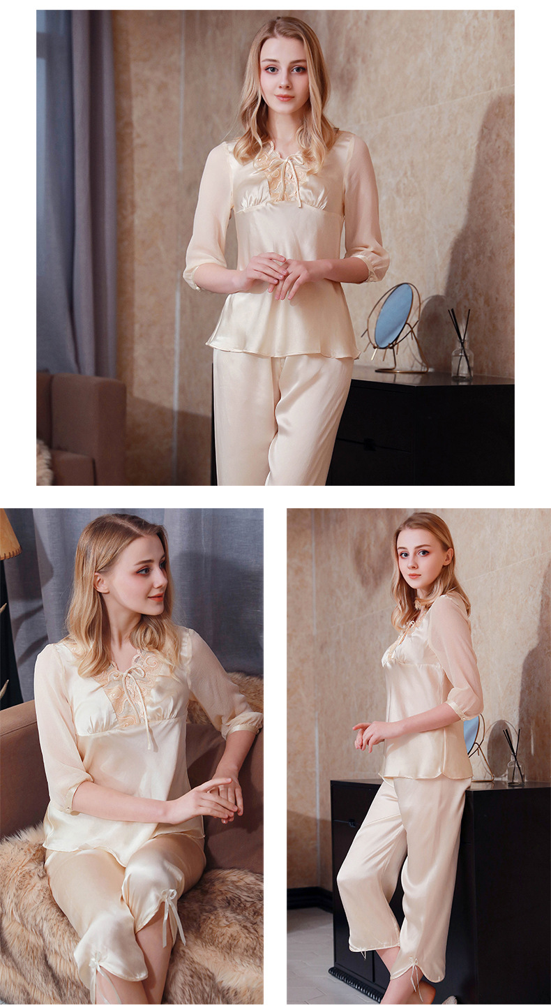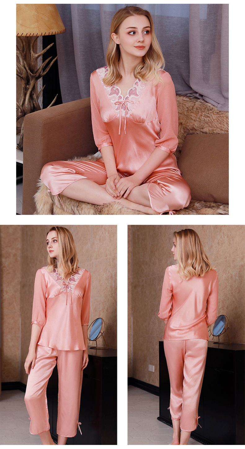 Bộ đồ ngủ hai mảnh dành cho nữ, có tay dài vừa phải, làm từ chất liệu tơ lụa mềm mại và thoáng mát, thích hợp dùng trong mùa xuân và thu. Thiết kế kết hợp điểm nhấn ren tinh tế, tạo nên vẻ đẹp dịu dàng. Sản phẩm phù hợp mặc nghỉ ngơi tại nhà, mang lại cảm giác dễ chịu, thoải mái. Có thể giặt bằng tay với nước thường và phơi ở nơi râm mát để giữ chất vải bền đẹp. | Tên sản phẩm: Đồ Ngủ Nữ Chất Liệu Lụa Tơ Tằm Cả Bộ 2 Món Hàng Mùa Hè Đồ Ngủ Hoặc Mặc Nhà - Thời Trang Nữ | Mã sản phẩm: E9199 - Giá: 2.780.000đ | Mã nhà sản xuất: TODN-G06Hình ảnh sản phẩm