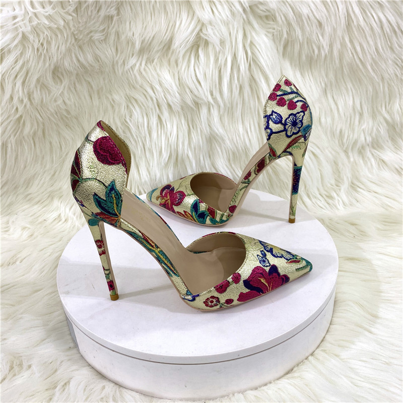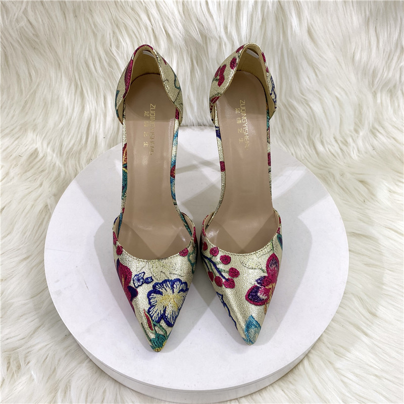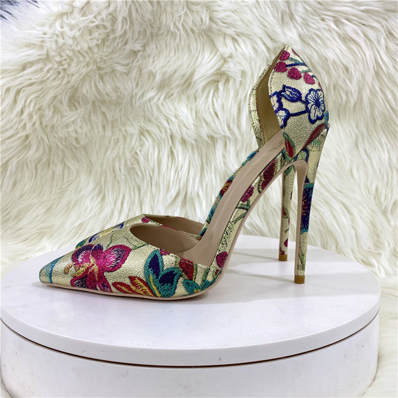 Giày cao gót kiểu dáng mới với phần mũi nhọn thanh lịch. Đôi điểm nhấn đặc biệt ở họa tiết thêu tinh xảo màu vàng ánh kim trên chất liệu, tạo nên vẻ đẹp nổi bật. Phần thiết kế rỗng ở thân giày mang đến nét cá tính và hiện đại. Chiều cao gót 12cm phù hợp để phối cùng nhiều trang phục như quần âu hay váy liền. Khi sử dụng, bạn nên chọn size phù hợp với chân để mang lại cảm giác thoải mái khi di chuyển. | Tên sản phẩm: Giày Cao Gót Nữ Mũi Nhọn Thêu Họa Tiết Hoa - Giày Dép Nữ | Mã sản phẩm: E9488 - Giá: 1.200.000đ | Mã nhà sản xuất: HURYNG-G04Hình ảnh sản phẩm