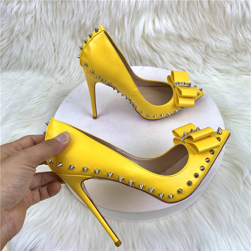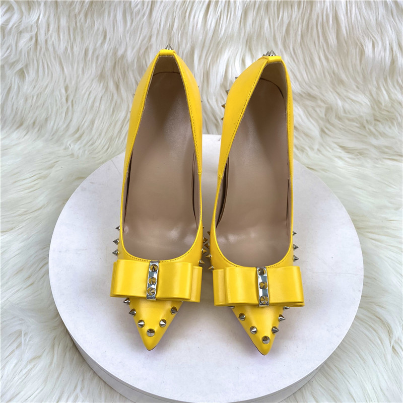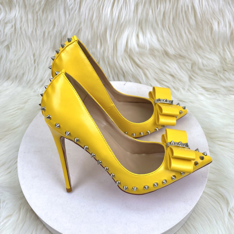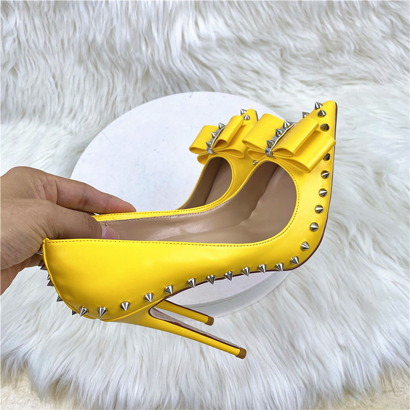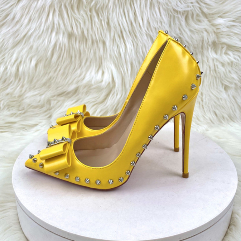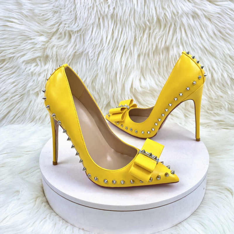 Giày cao gót mới với điểm nhấn là chiếc nơ và đinh tán trang trí. Phần mũi giày nhọn, gót cao và thanhai mảnh tôn dáng người đi. Kiểu dáng cổ điển, phù hợp để phối cùng nhiều trang phục khác nhau. Bạn có thể mang đôi giày này trong các buổi gặp mặt hoặc những dịp cần ăn mặc chỉn chu. Khi sử dụng, nên chọn size vừa vặn và tập đi lại nhẹ nhàng để làm quen với độ cao của gót. | Tên sản phẩm: Giày Cao Gót Nữ Thắt Nơ Bướm Mũi Nhọn Gót Nhọn - Giày Dép Nữ | Mã sản phẩm: E9557 - Giá: 1.320.000đ | Mã nhà sản xuất: HURYNG-G04Hình ảnh sản phẩm