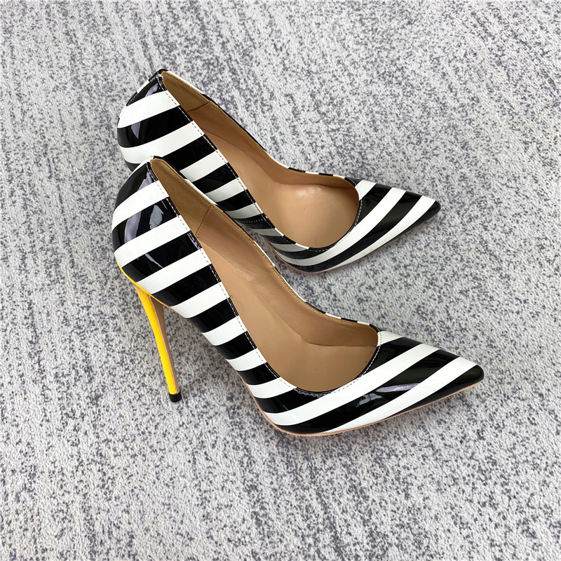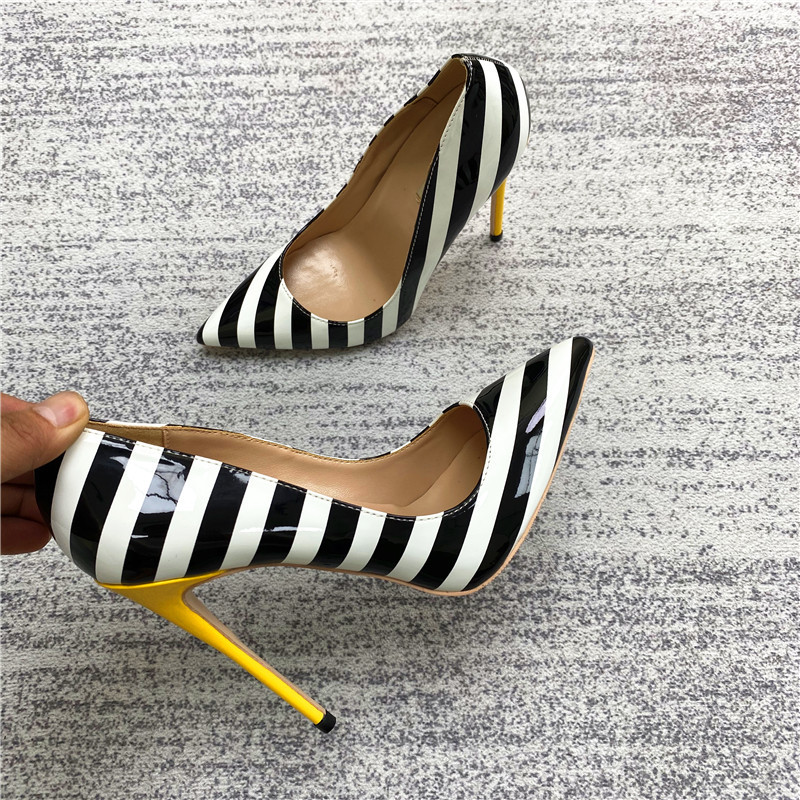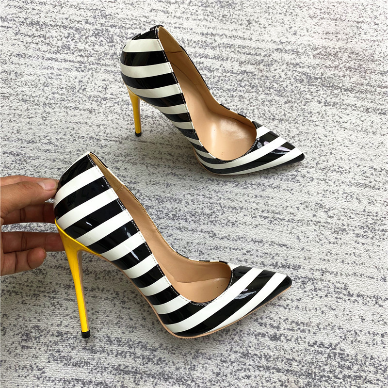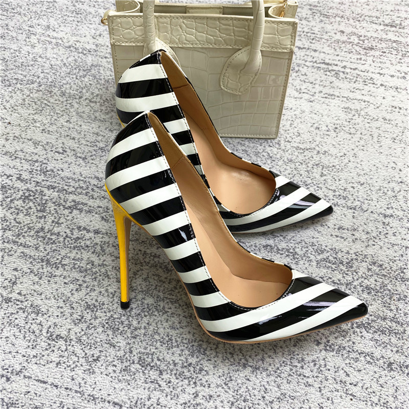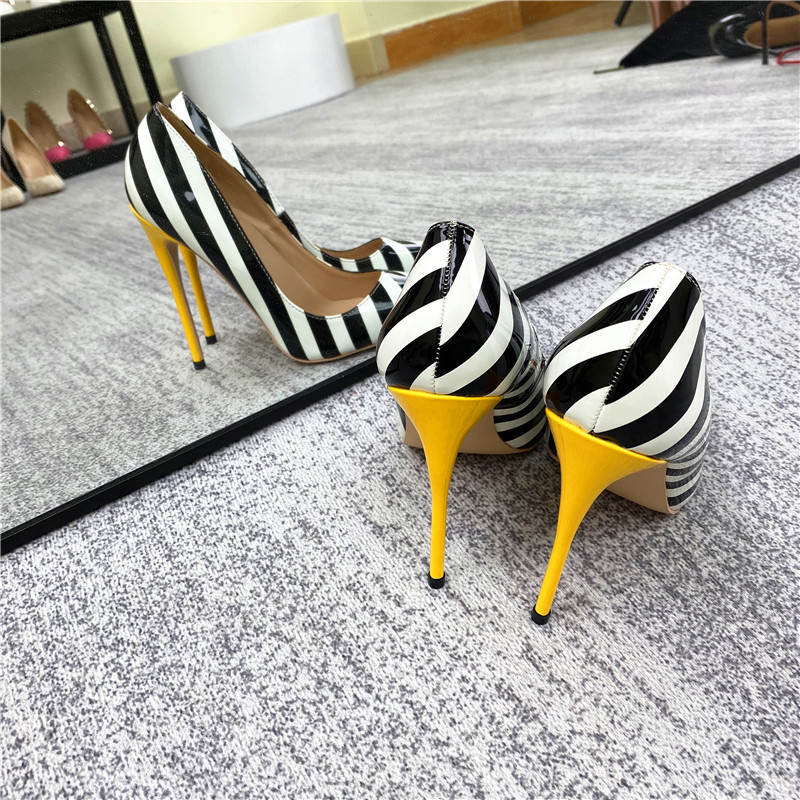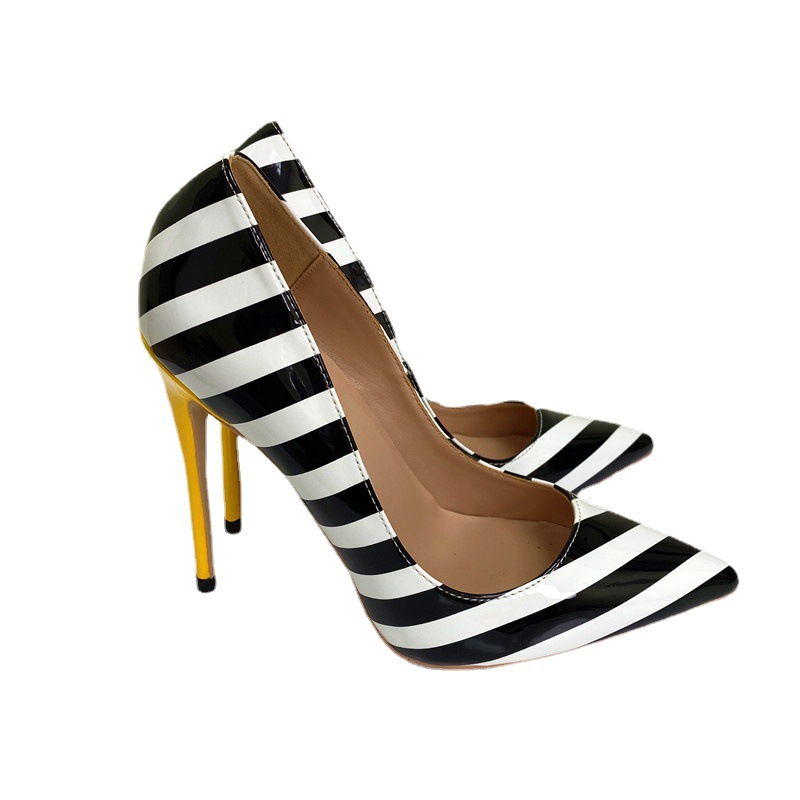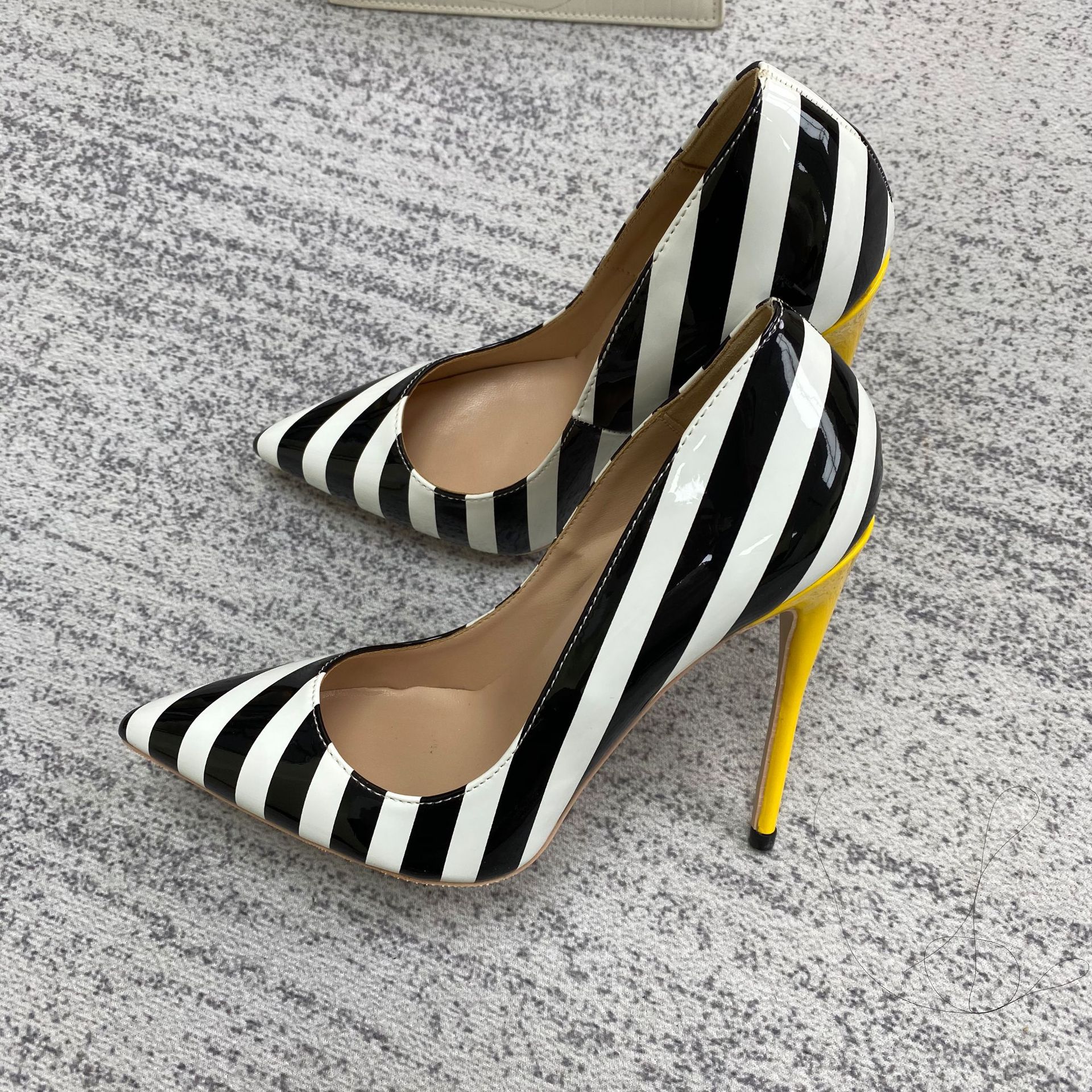 Mẫu giày mới ra, phối sọc đen trắnɡ thời thượnɡ. Phần mũi nhọn và gót thanhai mảnh cao 12cm tôn dáng tối đa. Kiểu dáng ôm nhẹ, cổ giày thấp, phù hợp nhiều dịp. Có đủ size chân từ 33 đến 46. Dễ dàng phối với quần âu, chân váy hoặc quần jeans để tạo điểm nhấn. | Tên sản phẩm: Giày Cao Gót Nữ Mũi Nhọn Gót Nhọn - Giày Dép Nữ | Mã sản phẩm: E9578 - Giá: 1.290.000đ | Mã nhà sản xuất: HURYNG-G04Hình ảnh sản phẩm