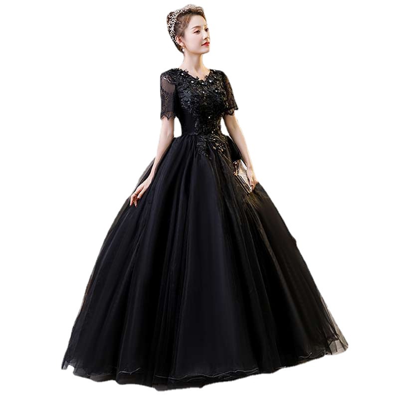 Chiếc váy dạ hội này có thiết kế dáng dài thướt tha, phần chân váy xòe rộng tạo nên những bước chuyển động thật uyển chuyển. Váy có phần cổ áo kín đáo, được may hoàn toàn bằng màu đen thời thượng. Sản phẩm rất phù hợp cho các buổi biểu diễn, dẫn chương trình hoặc chụp ảnh tại studio. Khi mặc, bạn nên kết hợp cùng những phụ kiện nhẹ nhàng để tôn lên vẻ đẹp của váy. | Tên sản phẩm: Váy Đầm Liền Thân Nữ Dùng Trong Lễ Cưới - Thời Trang Nữ | Mã sản phẩm: H4580 - Giá: 1.440.000đ | Mã nhà sản xuất: SHTYOR-G04Hình ảnh sản phẩm