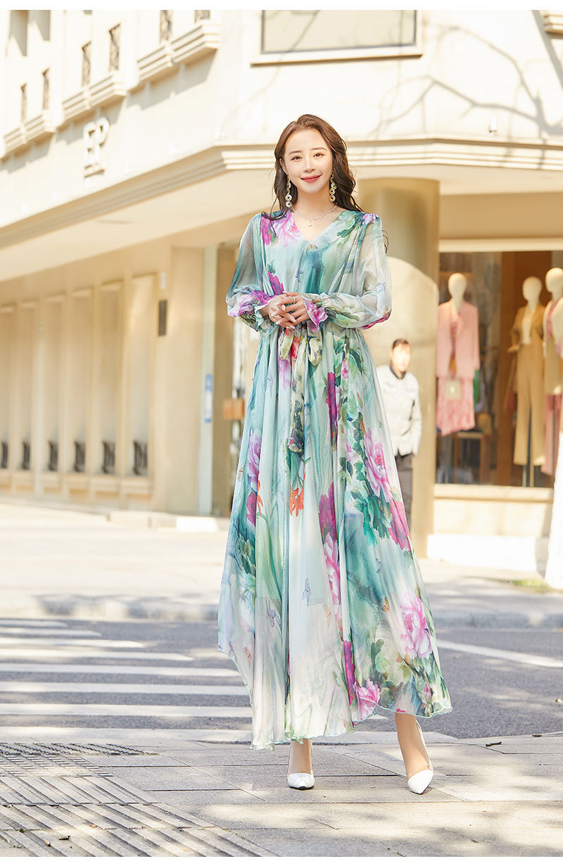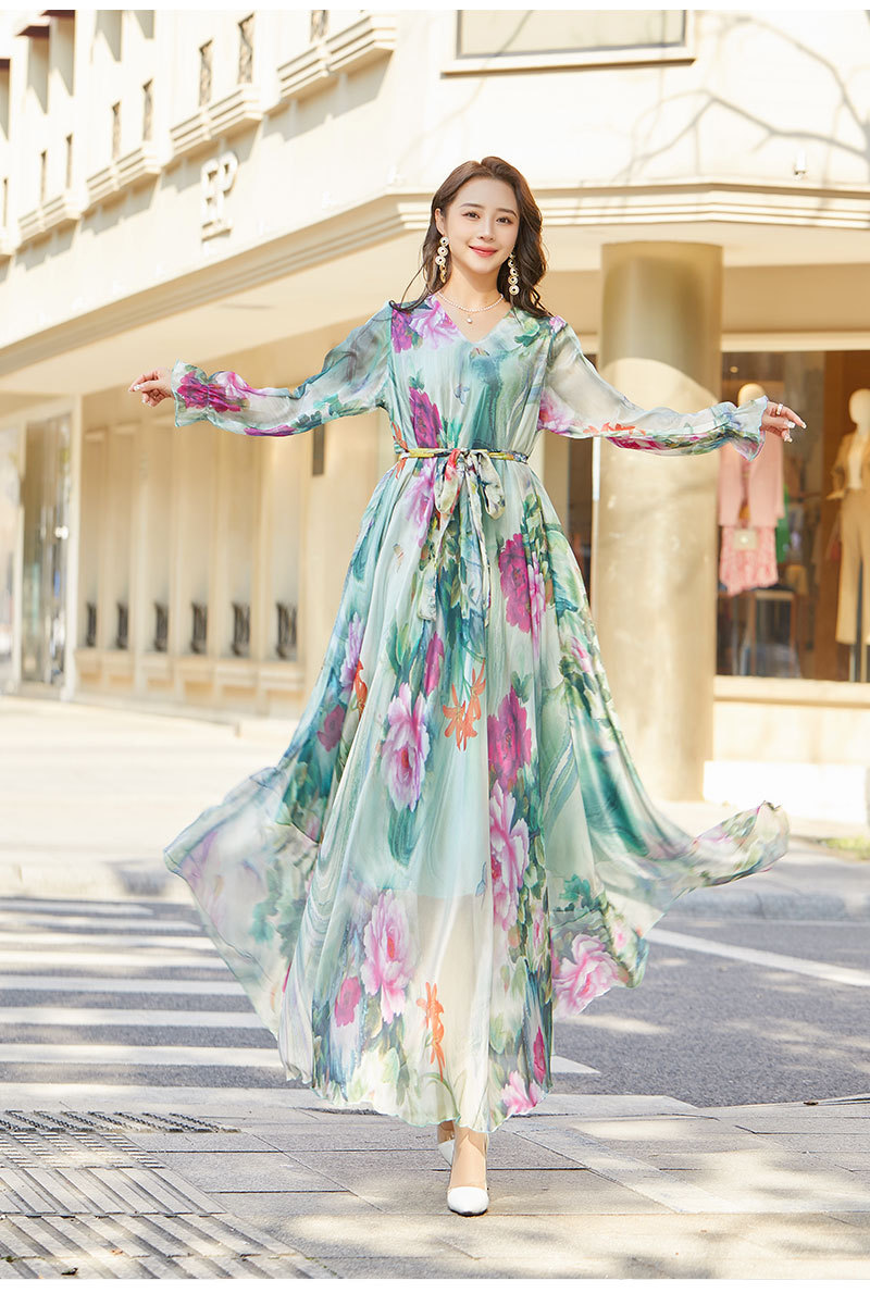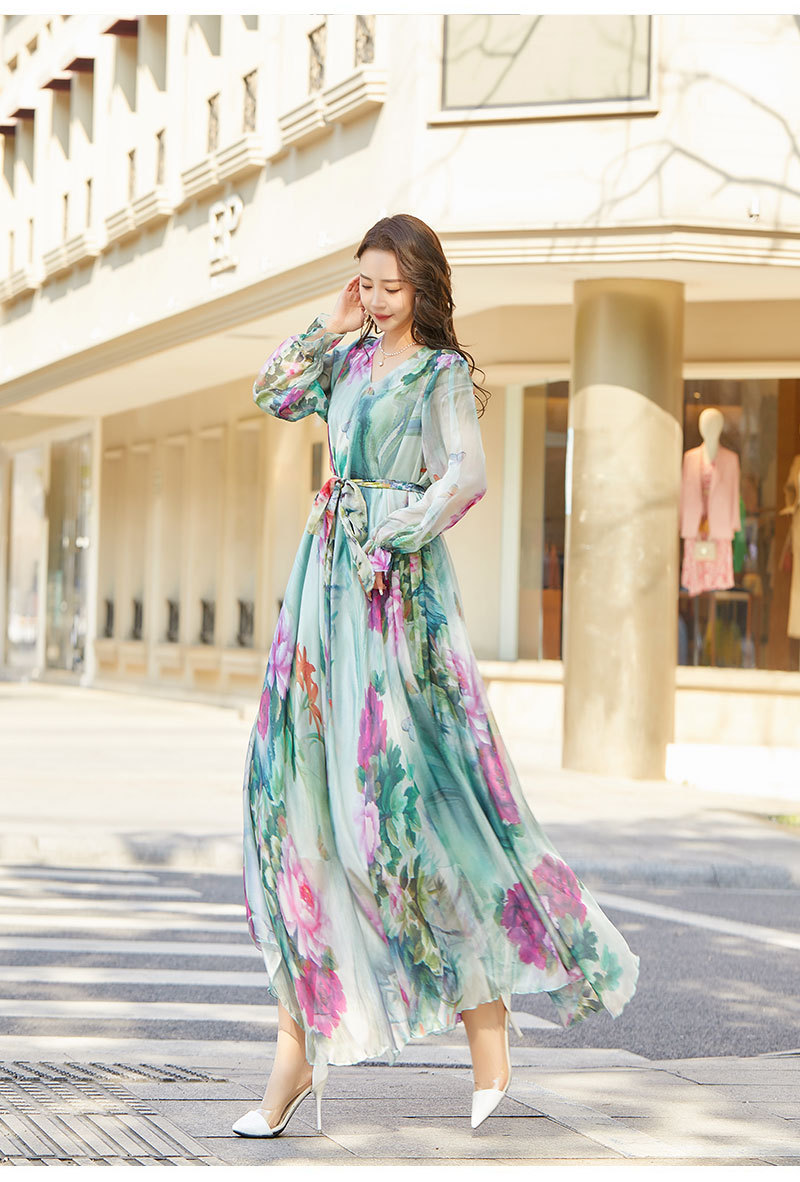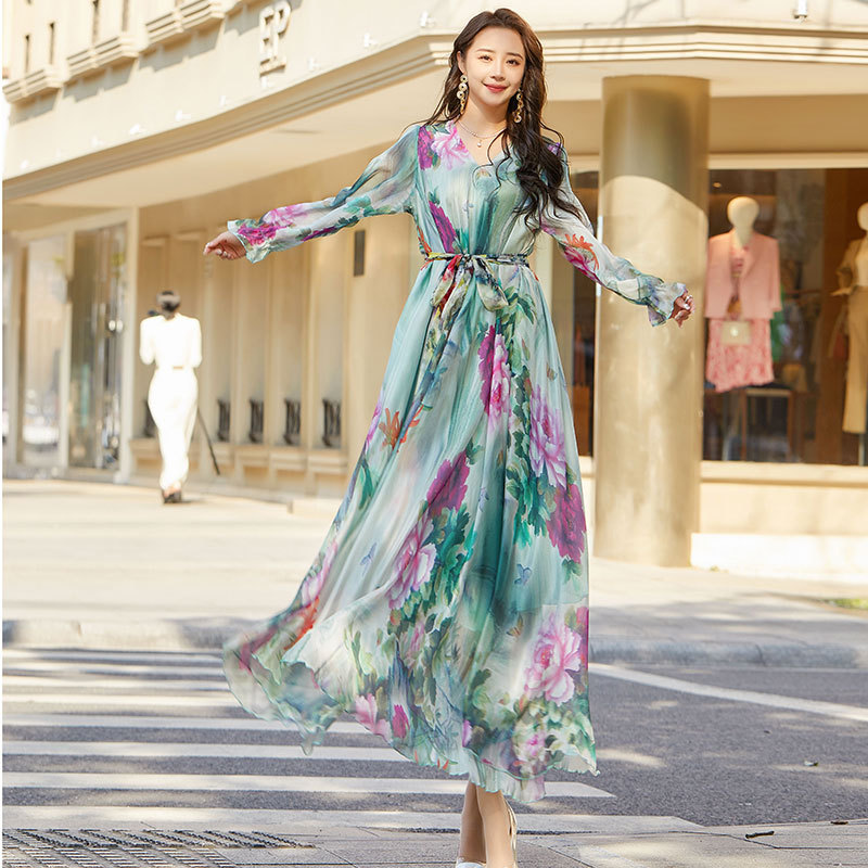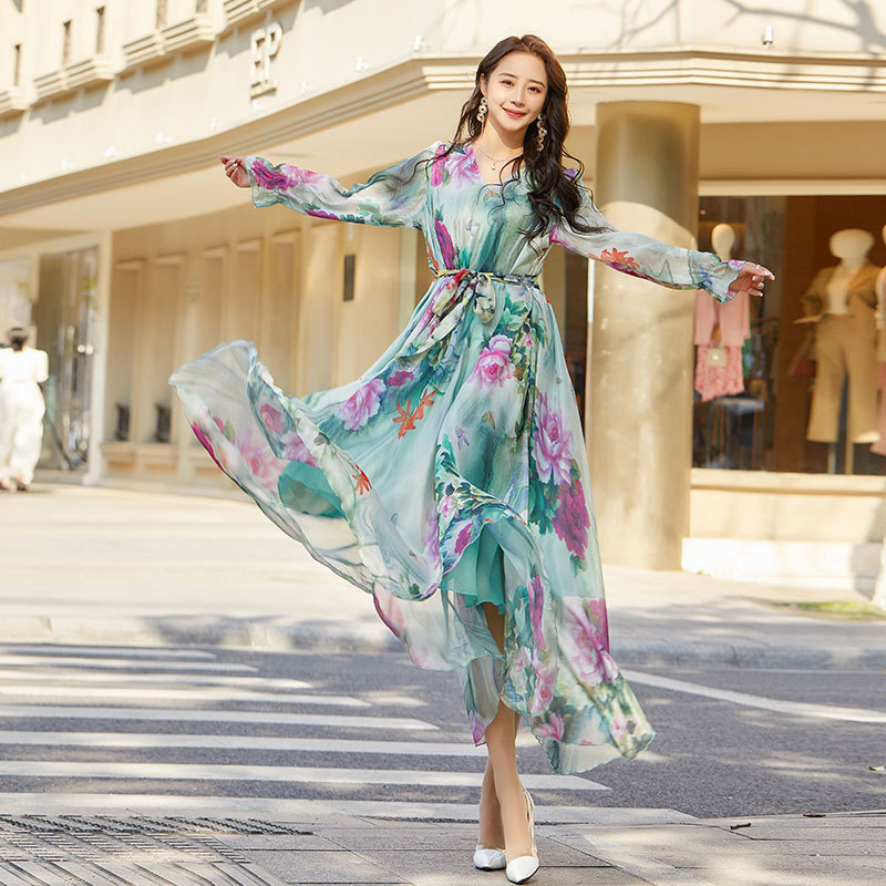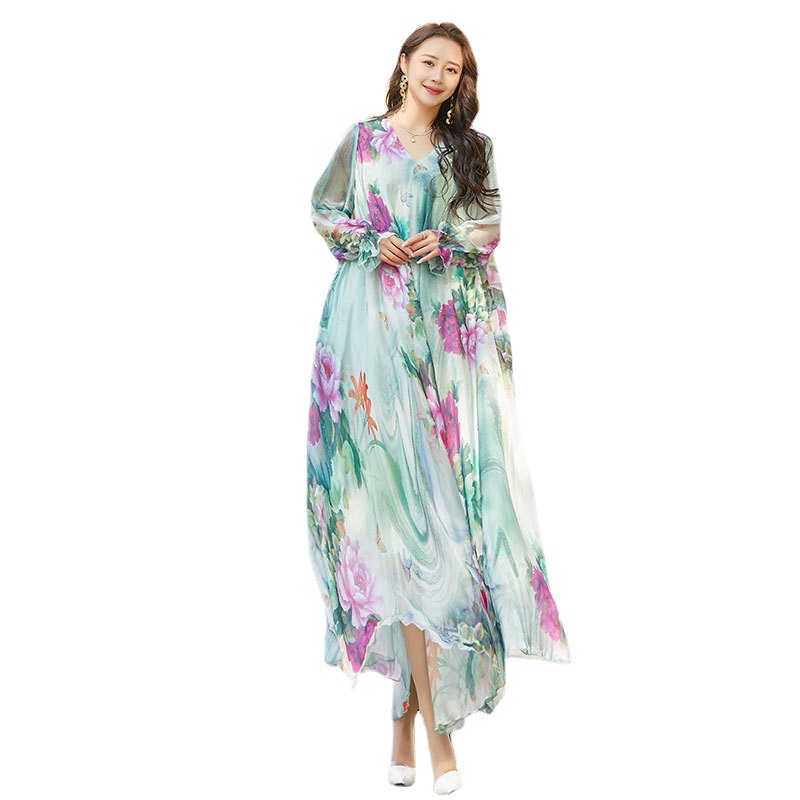 Chiếc váy dài tay dành cho những ngày hè, được may từ chất liệu voan mềm mại và thoáng mát. Kiểu dáng thướt tha, phù hợp cho các dịp dạo phố, đi chơi hoặc tận hưởng những chuyến du lịch biển. Bạn có thể mặc một mình hoặc kết hợp cùng giày sandal và mũ rộng vành để tạo nên một vẻ ngoại hình ấn tượng. | Tên sản phẩm: Váy Đầm Liền Thân Nữ Chất Liệu Vải Voan Dài Tay Hàng Mùa Hè Phong Cách Âu Mỹ Đồ Đi Biển Váy Maxi - Thời Trang Nữ | Mã sản phẩm: H5194 - Giá: 890.000đ | Mã nhà sản xuất: TARYUN-G03Hình ảnh sản phẩm