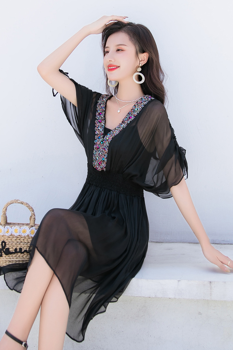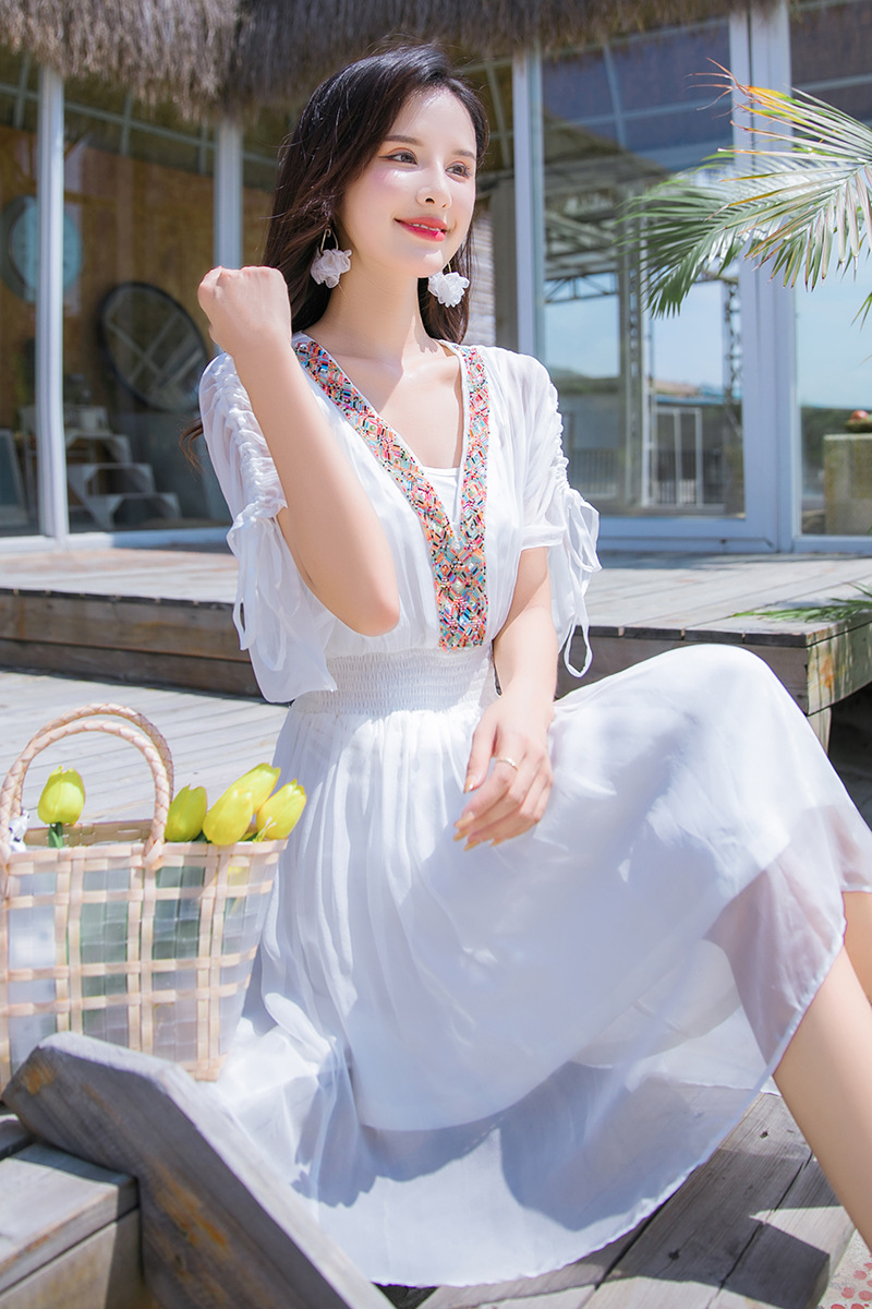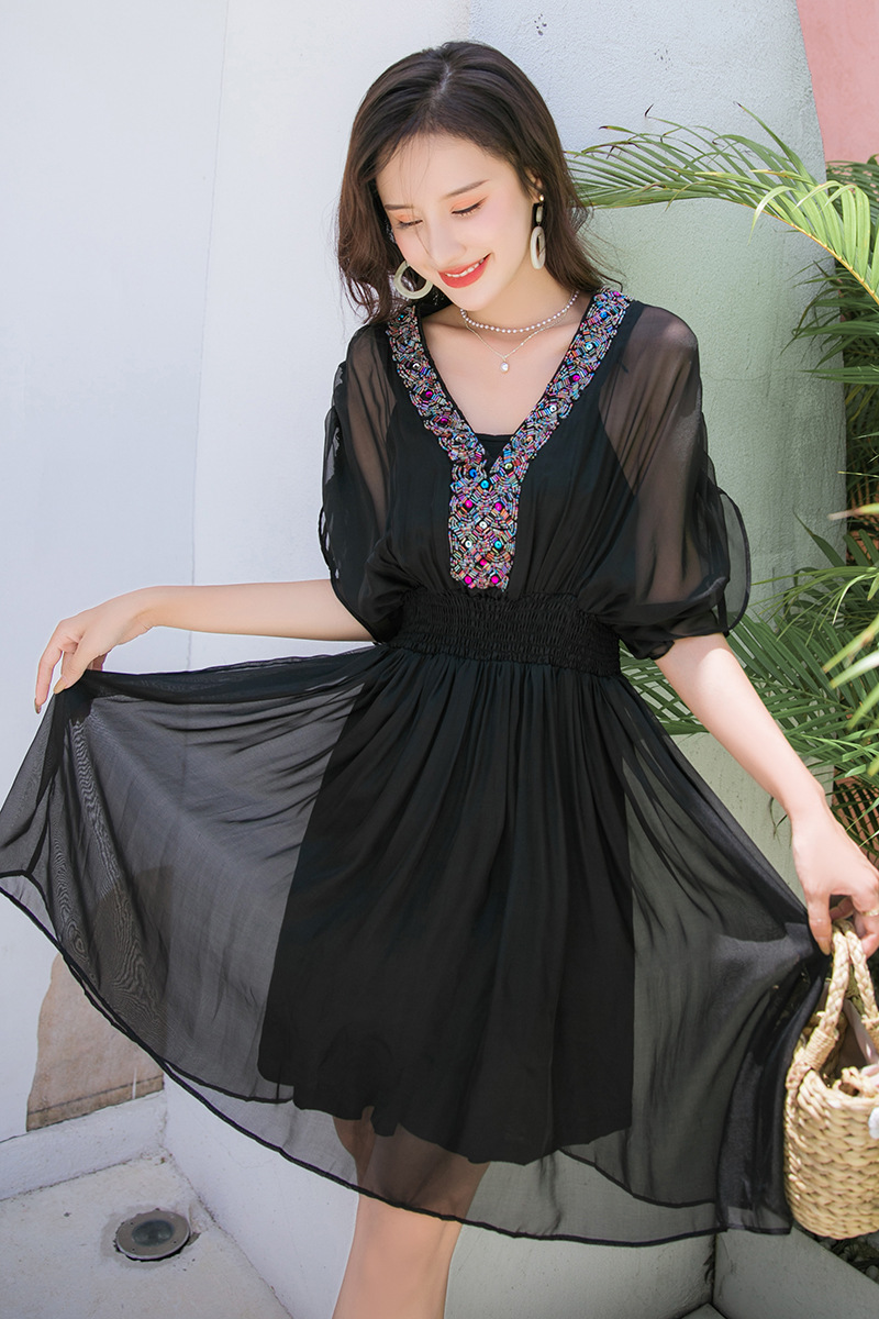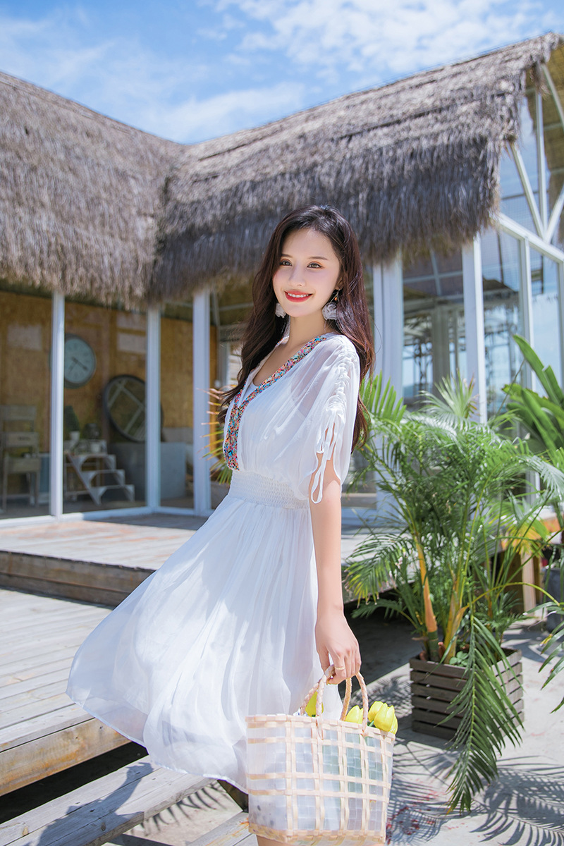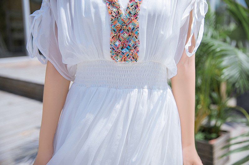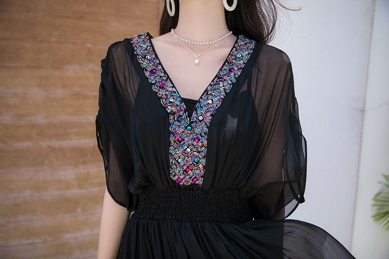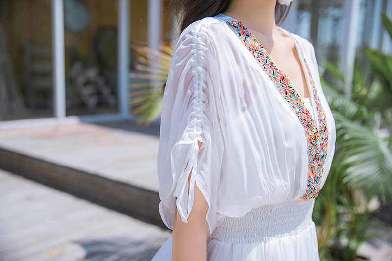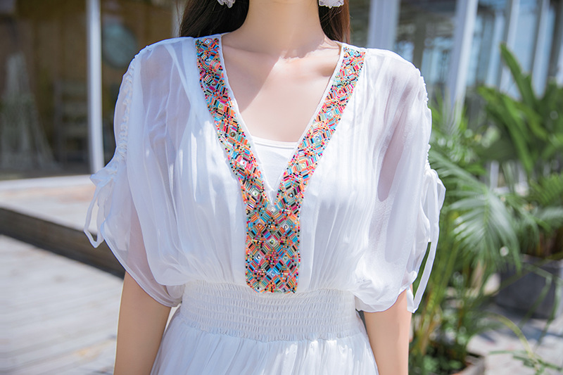 Chiếc váy mặc đi biển này được dệt hoàn toàn từ chất liệu tơ lụa mềm mại, mang đến cảm giác mát mẻ và thoải mái khi mặc. Kiểu dáng phóng khoáng với họa tiết thêu kết hạt cầu kỳ, rất phù hợp cho những chuyến du lịch nghỉ dưỡng. Bạn có thể phối cùng dép bệt và mũ rộng vành để tạo nên một hình ảnh tự nhiên và nổi bật. Sản phẩm dễ dàng giặt tay và bảo quản nơi khô ráo. | Tên sản phẩm: Váy Đầm Liền Thân Nữ Chất Liệu Lụa Tơ Tằm Đồ Đi Biển Váy Maxi - Thời Trang Nữ | Mã sản phẩm: H8316 - Giá: 1.730.000đ | Mã nhà sản xuất: SHDTR-G05Hình ảnh sản phẩm