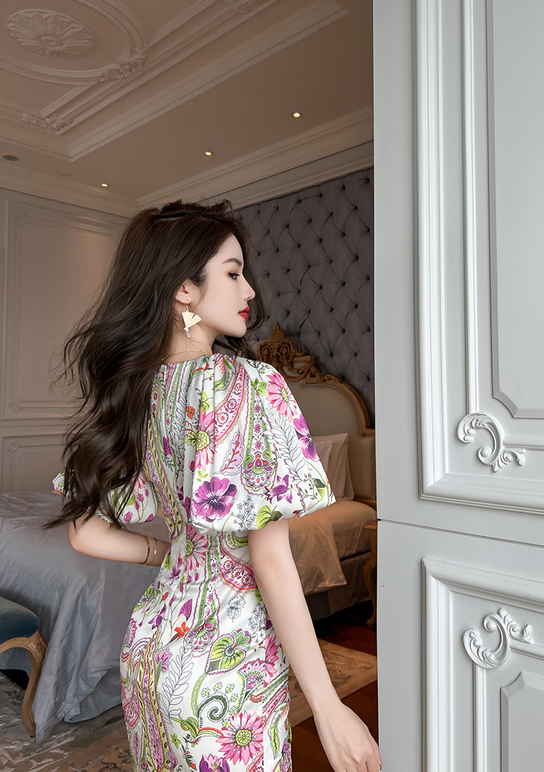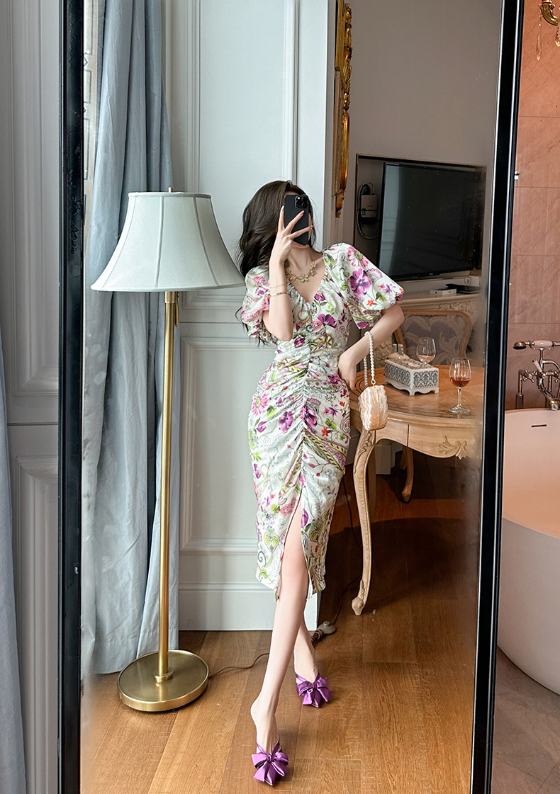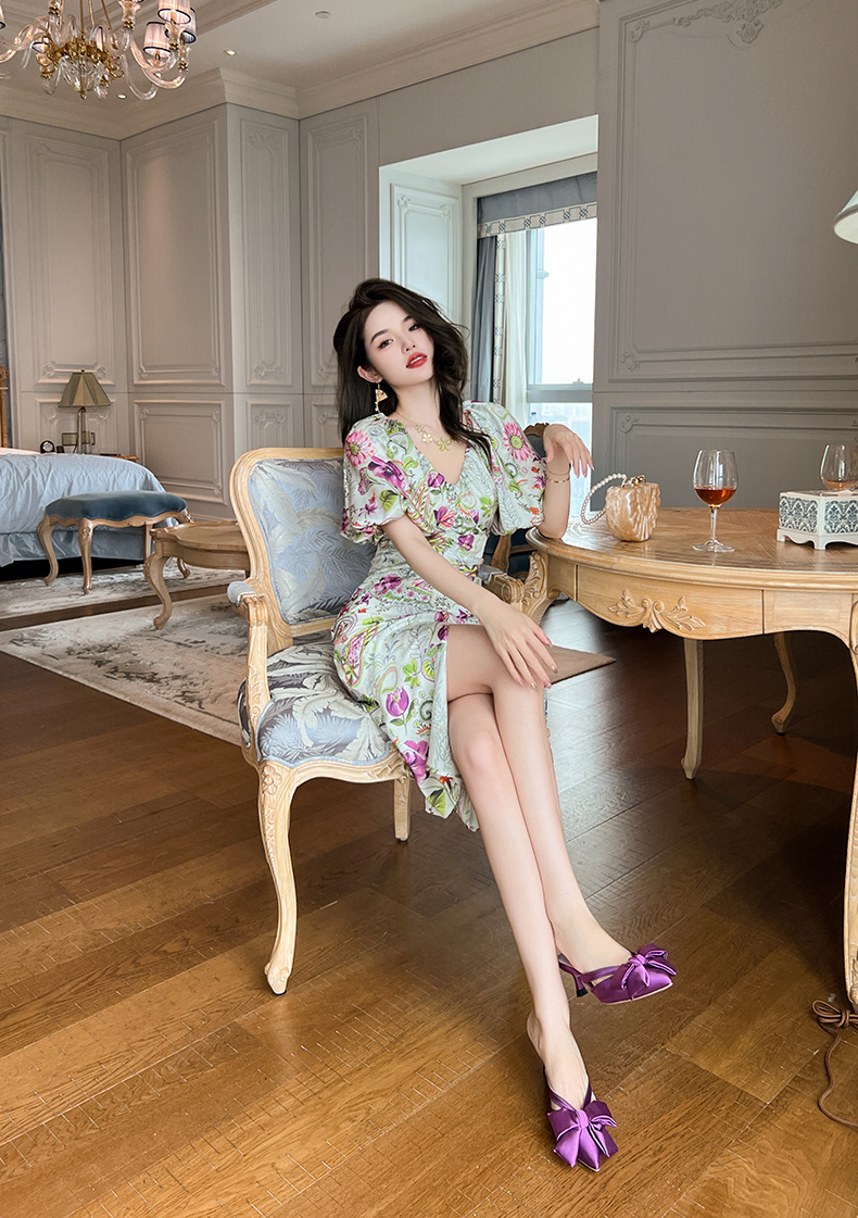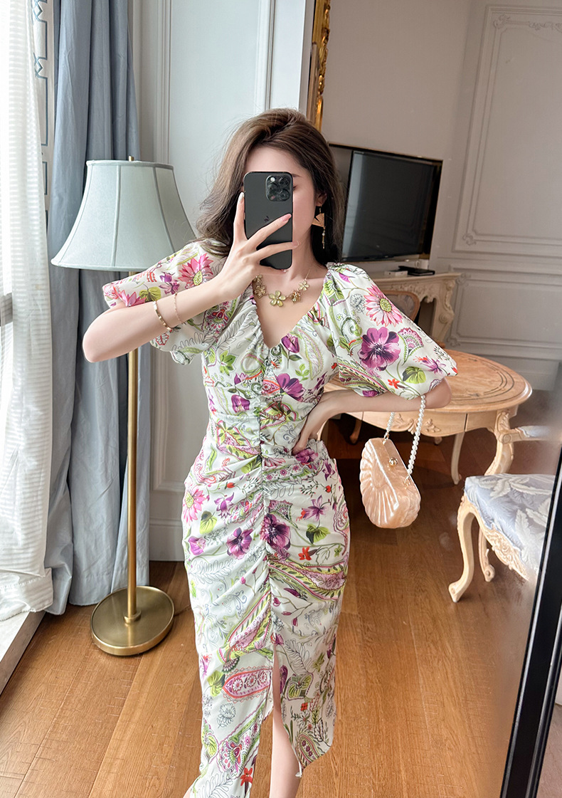 Chiếc đầm mới kiểu cách dành cho các bạn gái. Thiết kế cổ chữ V và tay phồng mang đến vẻ đẹp nữ tính, duyên dáng. Hoa văn in trên vải tạo điểm nhấn sinh động. Form đầm ôm nhẹ cơ thể, giúp tôn lên những đường nét cơ thể. Có thể mặc đi làm, dạo phố hay dự những buổi gặp mặt thân mật. Dễ dàng phối cùng giày cao gót hay giày bệt đều hợp. | Tên sản phẩm: Váy Đầm Liền Thân Nữ Dáng Ôm Tay Phồng Họa Tiết Hoa Cổ Chữ V Hàng Mùa Hè - Thời Trang Nữ | Mã sản phẩm: H9856 - Giá: 1.130.000đ | Mã nhà sản xuất: CHDG-G04Hình ảnh sản phẩm