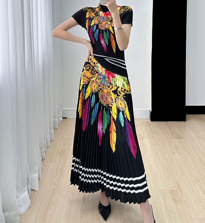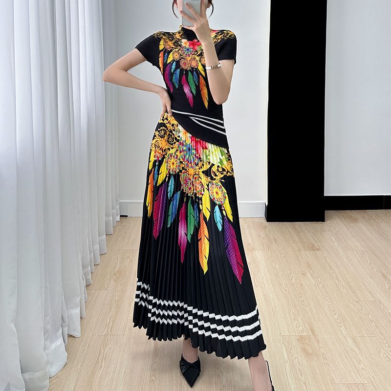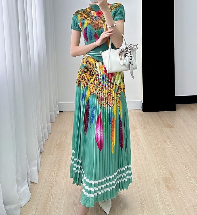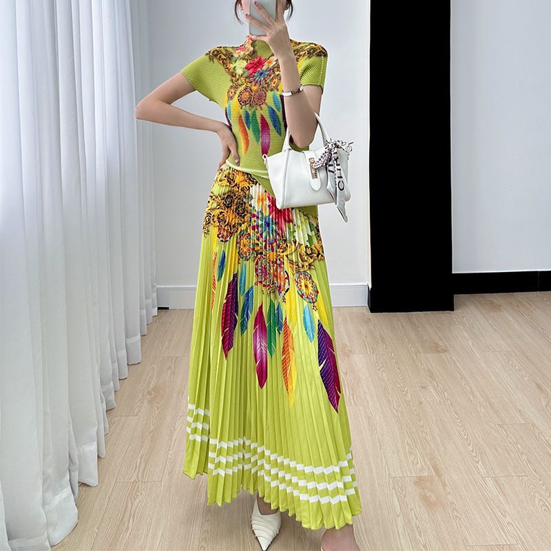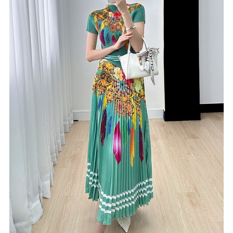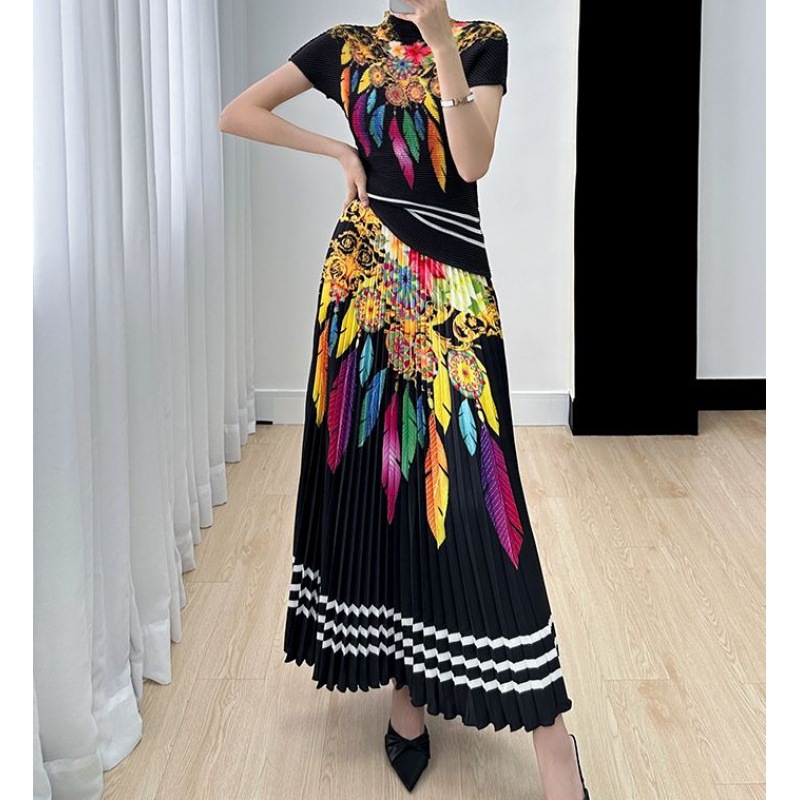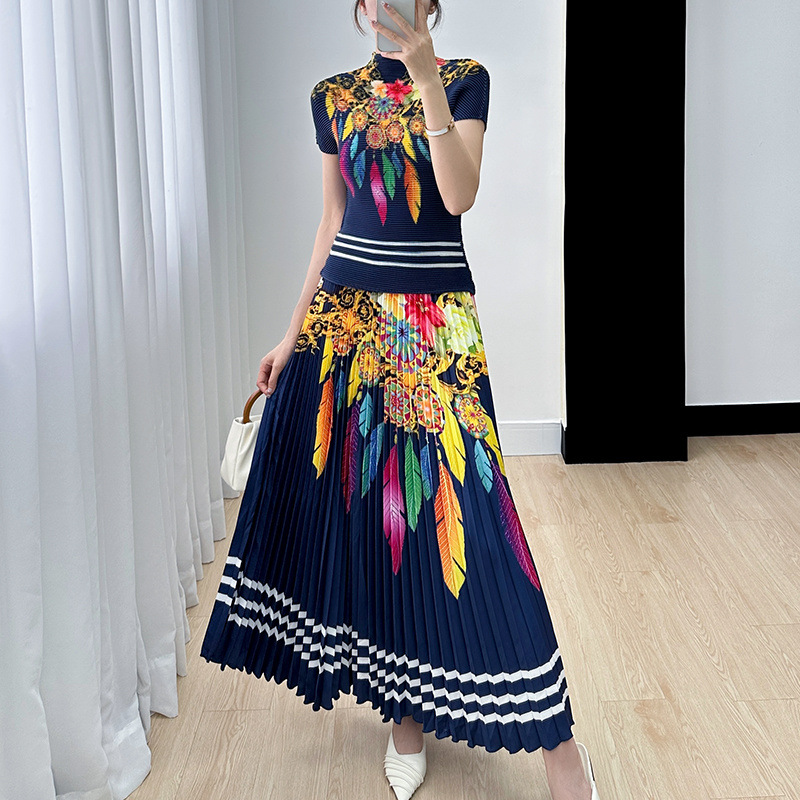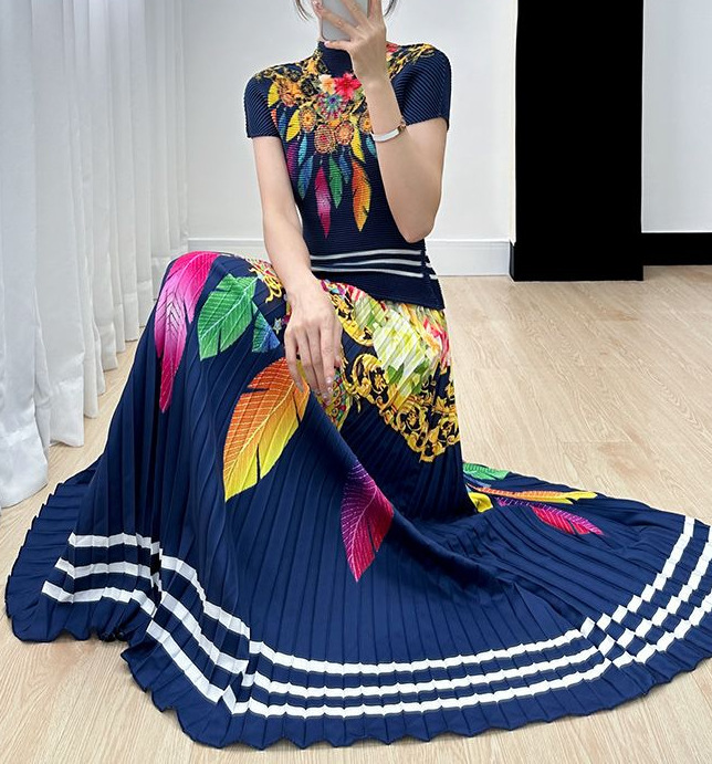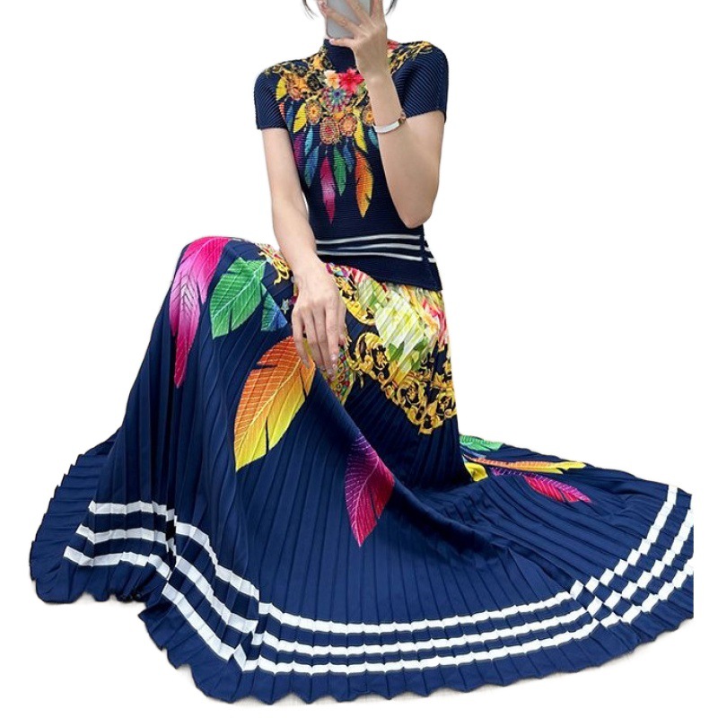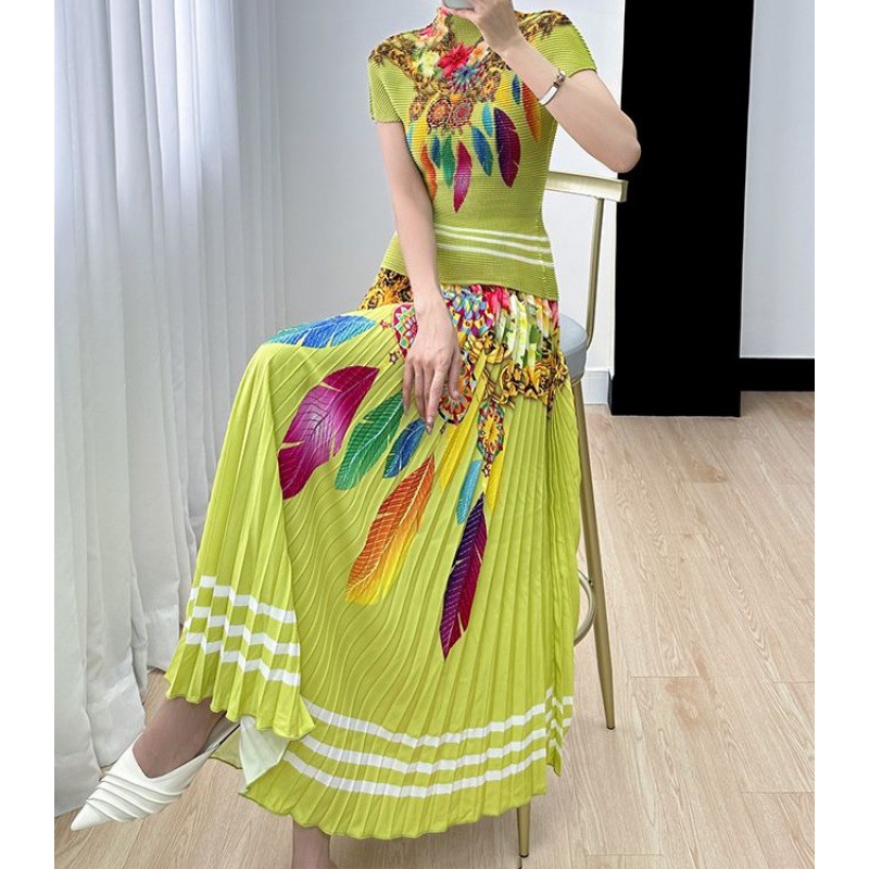 Bộ trang phục này gồm áo ngắn tay và chân váy xếp ly, mang nét đẹp hoài cổ nhẹ nhàng. Áo được dệt từ chất liệu mềm mại tạo cảm giác thoải mái như hạt ngô non. Chân váy có họa tiết in nổi bật cùng form dáng xòe duyên dáng. Bộ trang phục phù hợp cho những ngày hè, dễ dàng phối cùng giày sandal hay giày thể thao. Có thể mặc đi làm, đi chơi hoặc dự tiệc nhẹ. | Tên sản phẩm: Đồ Bộ Nữ Ngắn Tay Cả Bộ 2 Món Họa Tiết Hoa Hàng Mùa Hè Phục Cổ Cổ Điển - Thời Trang Nữ | Mã sản phẩm: k0030 - Giá: 1.230.000đ | Mã nhà sản xuất: CHTYAI-G04Hình ảnh sản phẩm