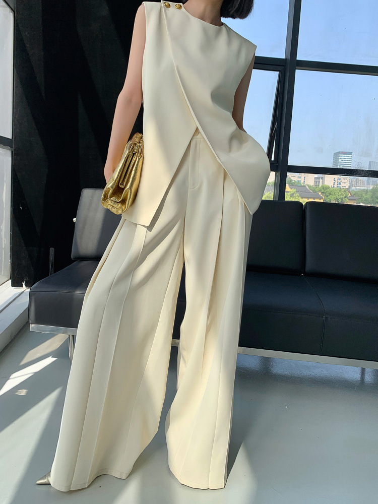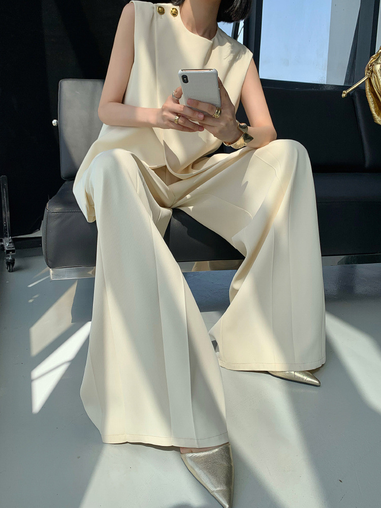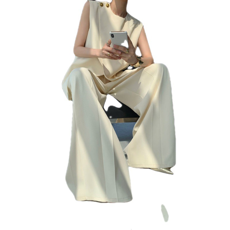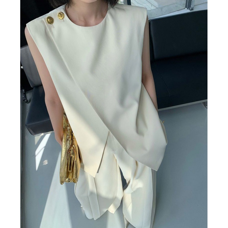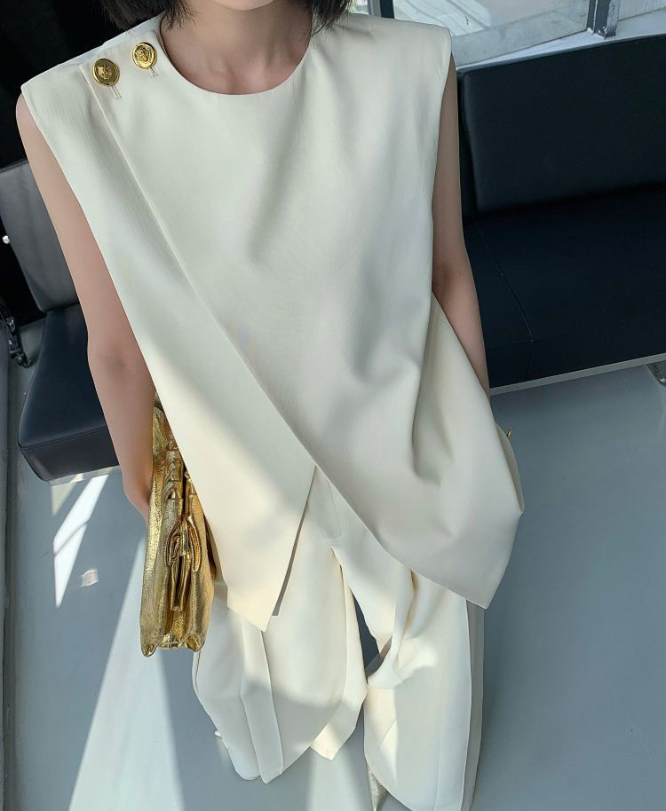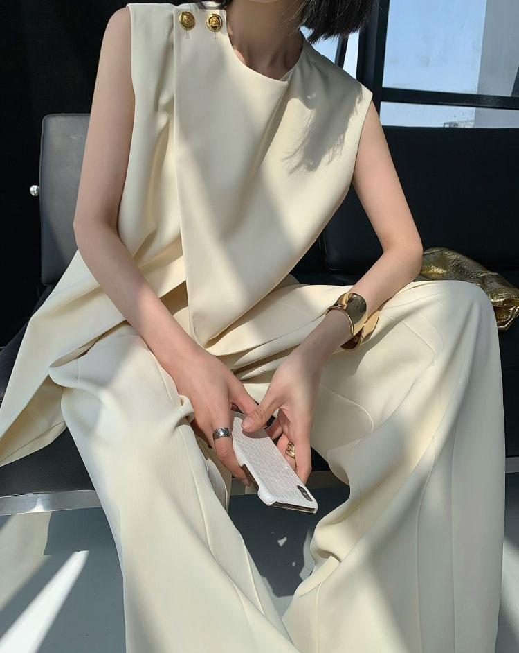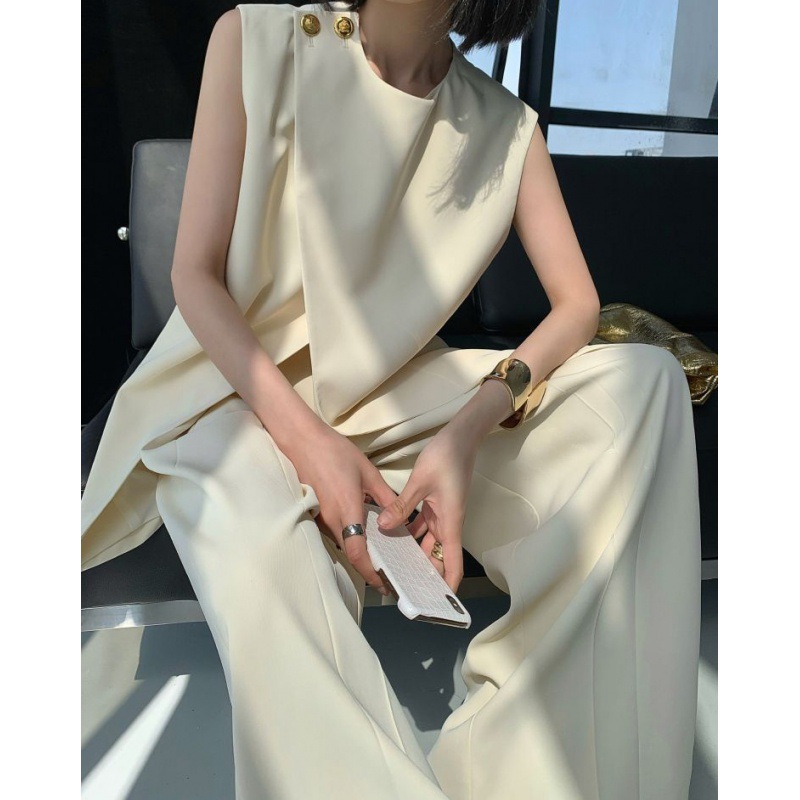 Bộ trang phục nữ tính này gồm áo khoác không tay và quần ống rộng, được thiết kế với tông màu be nhẹ nhàng, phù hợp cho mùa hè. Áo có đường cắt lệch điệu đà, phối cùng quần cạp cao tôn dáng. Chất vải mềm mại, thoáng mát giúp người mặc dễ chịu cả ngày. Có thể mặc nguyên bộ hoặc phối cùng áo thun, áo sơ mi bên trong để tạo nhiều phong cách khác nhau. | Tên sản phẩm: Đồ Bộ Nữ Cả Bộ 2 Món Hàng Mùa Hè - Thời Trang Nữ | Mã sản phẩm: k0113 - Giá: 1.630.000đ | Mã nhà sản xuất: CHTYAI-G05Hình ảnh sản phẩm