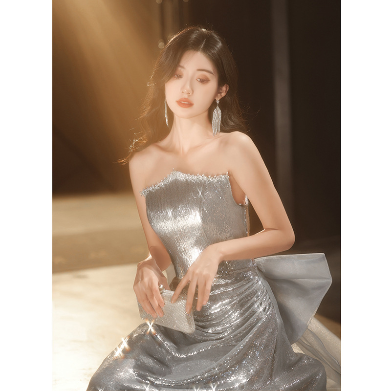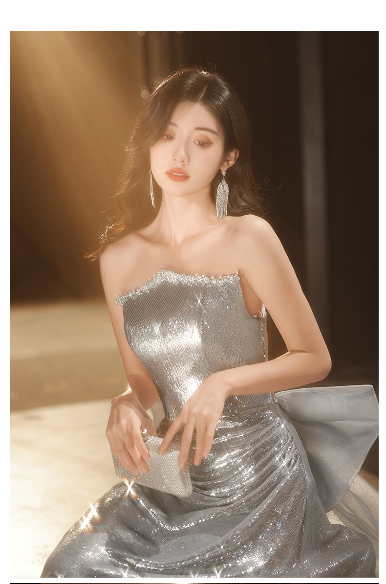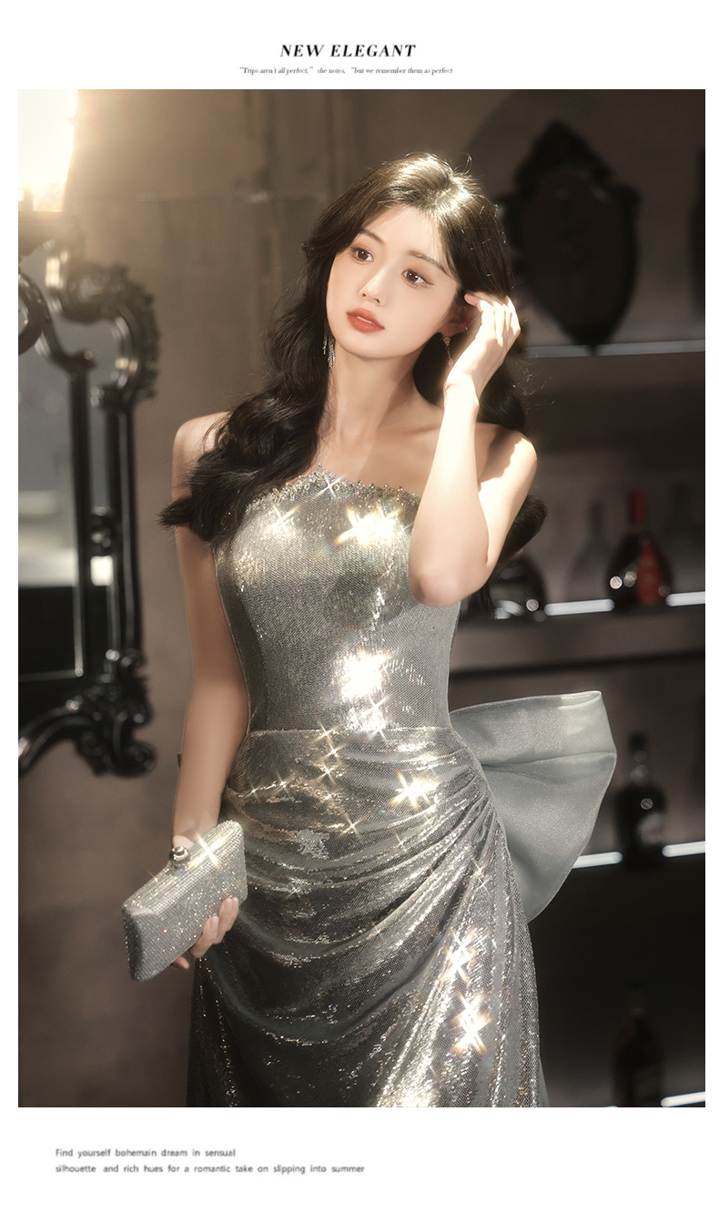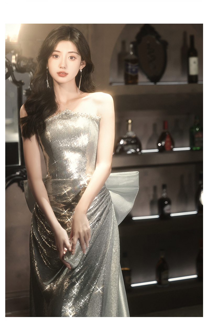 Chiếc váy dạ hội lấp lánh với hàng ngàn hạt ánh bạc tinh tế. Thiết kế ôm dáng thanh lịch, phù hợp cho các buổi tiệc tối, biểu diễn nghệ thuật hoặc làm váy cô dâu trong tiệc mừng. Chất vải nhẹ nhàng giúp bạn dễ dàng di chuyển và thoải mái suốt đêm. Mặc kèm với phụ kiện đơn giản để tôn lên vẻ rực rỡ của váy. Dễ dàng giặt tay và bảo quản nơi khô ráo. | Tên sản phẩm: Váy Đầm Liền Thân Dự Tiệc Nữ - Thời Trang Nữ | Mã sản phẩm: K0150 - Giá: 1.900.000đ | Mã nhà sản xuất: XUTYYU-G05Hình ảnh sản phẩm