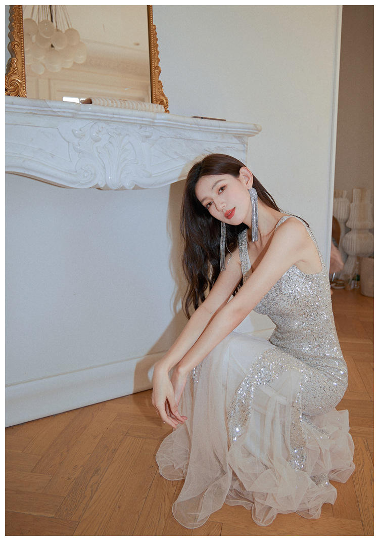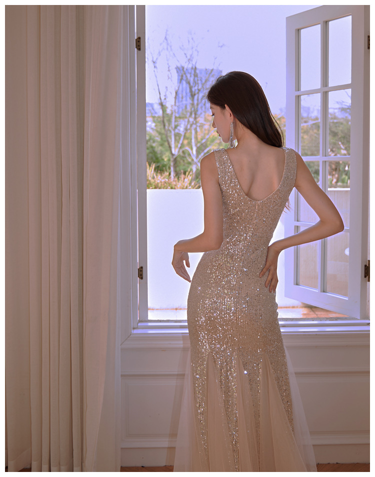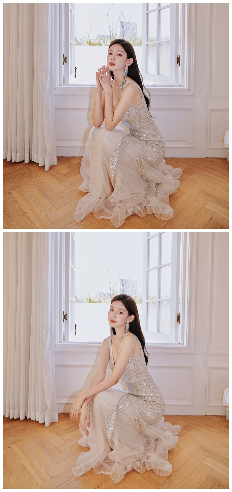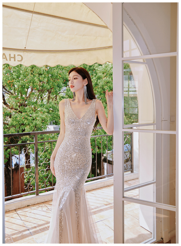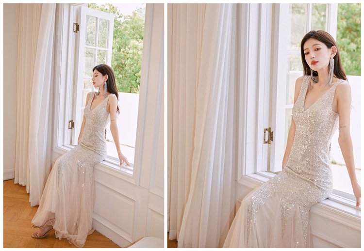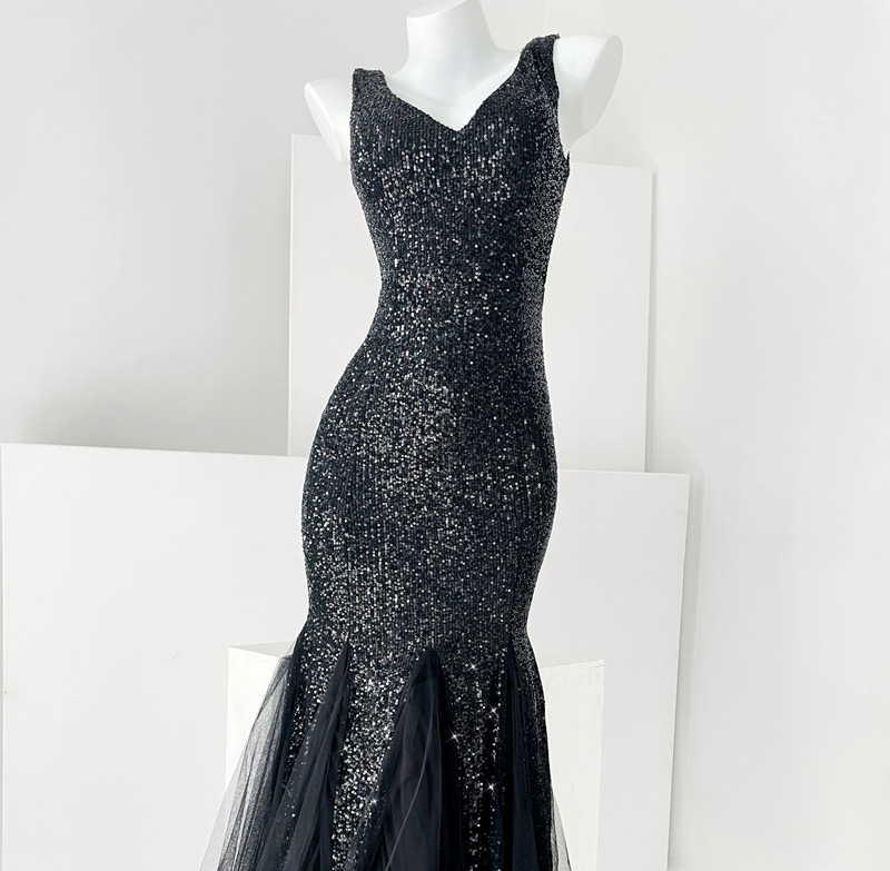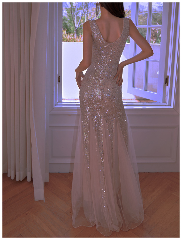 Váy dạ hội lấy cảm hứng từ nàng tiên cá, phù hợp cho các buổi tiệc tối. Thiết kế ôm dáng với phần chân váy xòe nhẹ tạo dáng đuôi cá thanh thoát. Chất liệu kết hợp vải mềm mại và lớp lưới mỏng, điểm xuyết những hạt ánh sáng lấp lánh tựa như những vì sao nhỏ. Sản phẩm mang đến vẻ đẹp dịu dàng và nữ tính. Có thể giặt tay nhẹ nhàng và phơi nơi thoáng mát để giữ dáng váy. | Tên sản phẩm: Váy Đầm Liền Thân Nữ Lưới Mỏng Kiểu Đuôi Cá - Thời Trang Nữ | Mã sản phẩm: K0334 - Giá: 1.680.000đ | Mã nhà sản xuất: XUTYYU-G05Hình ảnh sản phẩm