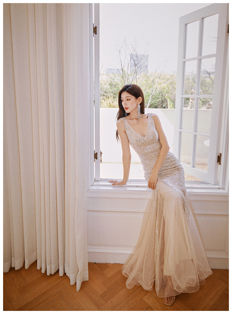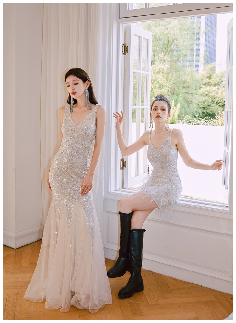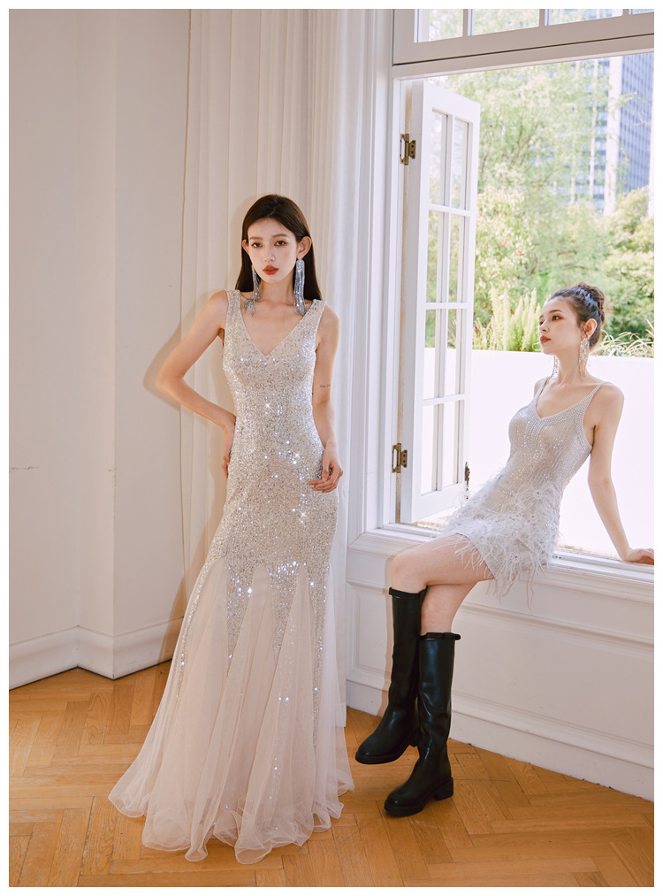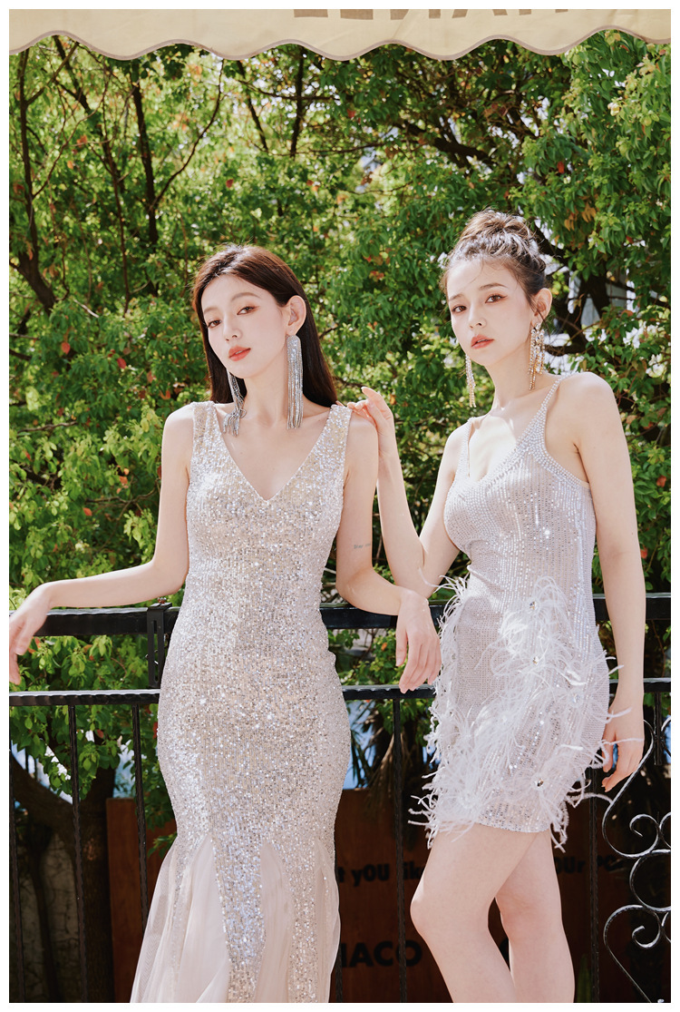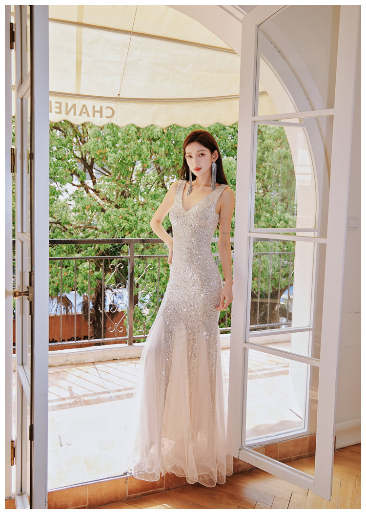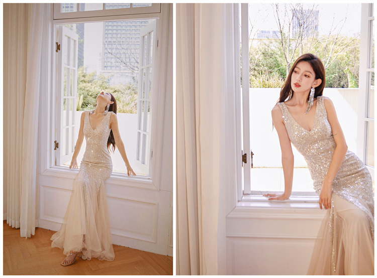 Váy dạ hội lấy cảm hứng từ nàng tiên cá, phù hợp cho các buổi tiệc tối. Thiết kế ôm dáng với phần chân váy xòe nhẹ tạo dáng đuôi cá thanh thoát. Chất liệu kết hợp vải mềm mại và lớp lưới mỏng, điểm xuyết những hạt ánh sáng lấp lánh tựa như những vì sao nhỏ. Sản phẩm mang đến vẻ đẹp dịu dàng và nữ tính. Có thể giặt tay nhẹ nhàng và phơi nơi thoáng mát để giữ dáng váy. | Tên sản phẩm: Váy Đầm Liền Thân Nữ Lưới Mỏng Kiểu Đuôi Cá - Thời Trang Nữ | Mã sản phẩm: K0334 - Giá: 1.680.000đ | Mã nhà sản xuất: XUTYYU-G05Hình ảnh sản phẩm
