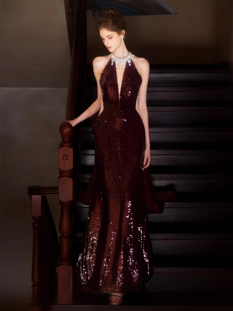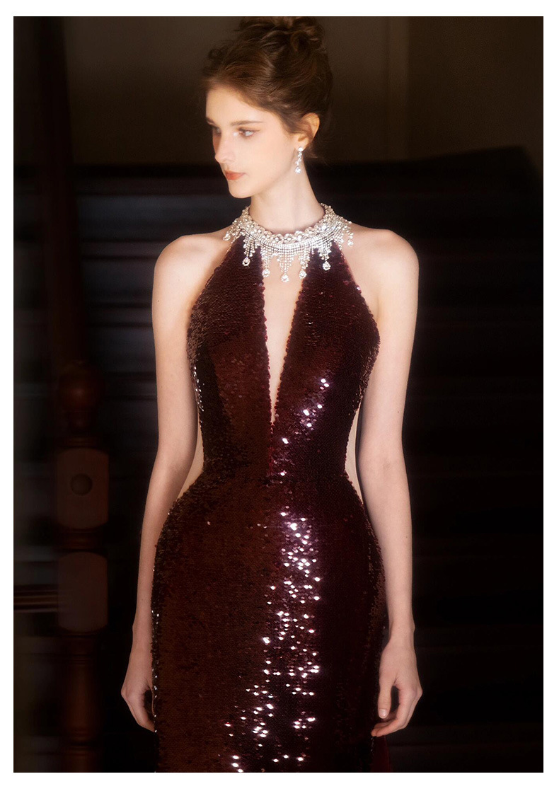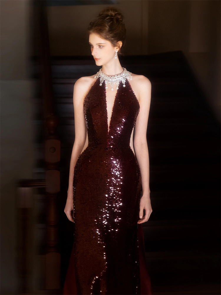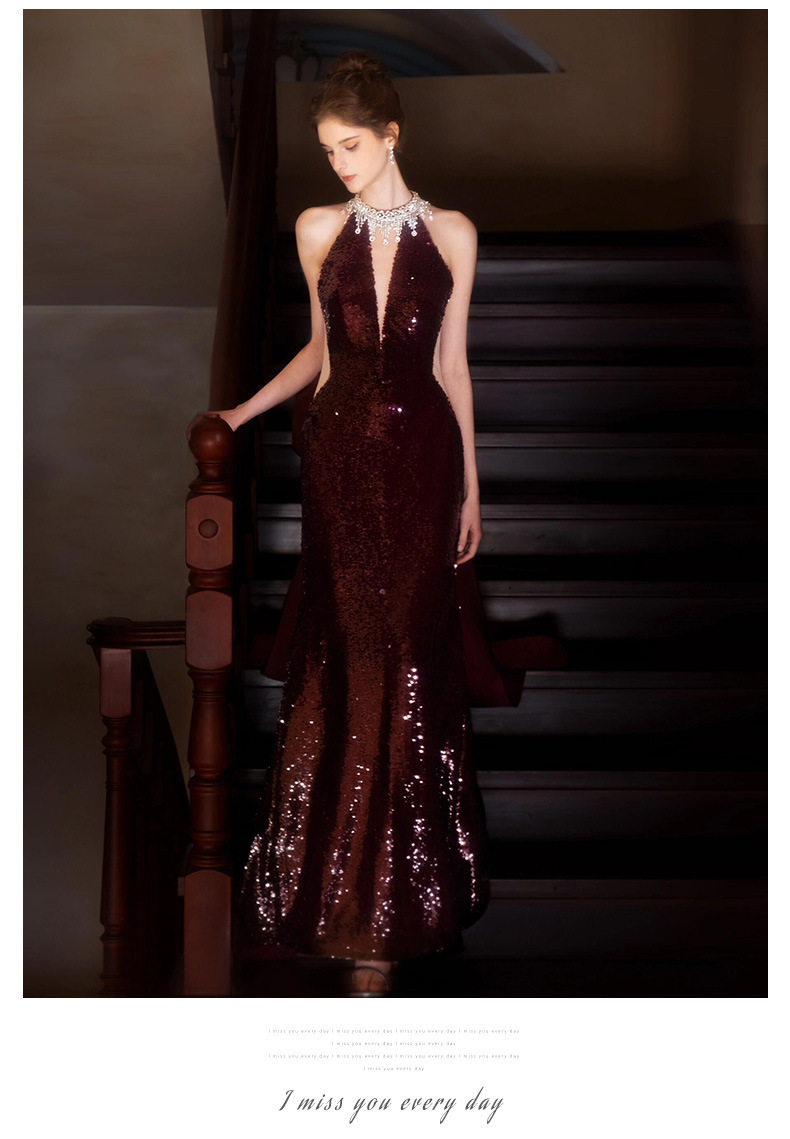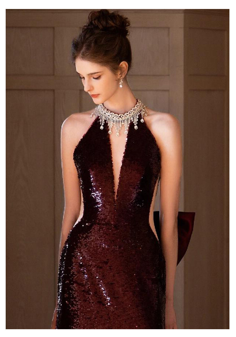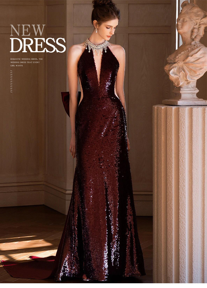 Váy dạ hội dáng đuôi cá dành cho cô dâu trong các buổi tiệc, có màu rượu vang đỏ ấn tượng. Thiết kế cổ yếm ôm sát, tôn lên vẻ duyên dáng. Toàn thân váy được đính vô số hạt ánh sáng lấp lánh tinh tế. Kiểu dáng thon dài giúp tôn lên các đường nét cơ thể. Sản phẩm phù hợp để mặc trong các bữa tiệc quan trọng như lễ đính hôn hay tiệc mừng. | Tên sản phẩm: Váy Đầm Liền Thân Dự Tiệc Nữ Kiểu Đuôi Cá Dùng Trong Lễ Cưới - Thời Trang Nữ | Mã sản phẩm: K0406 - Giá: 1.780.000đ | Mã nhà sản xuất: XUTYYU-G05Hình ảnh sản phẩm