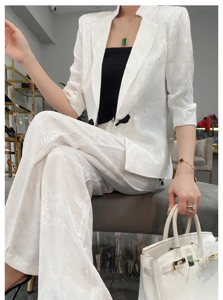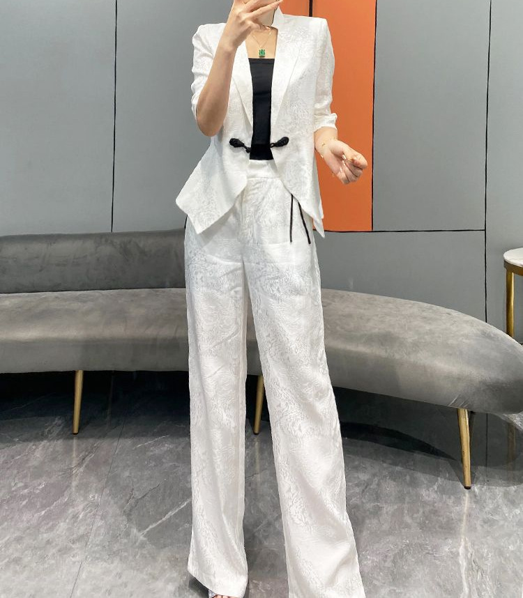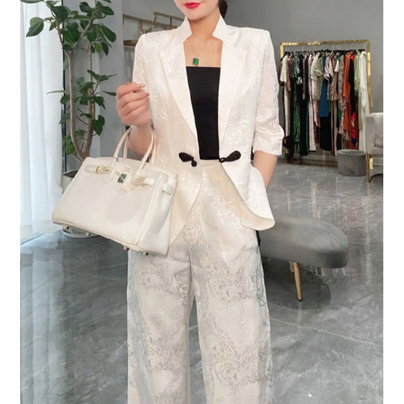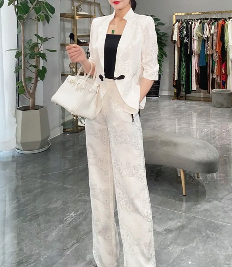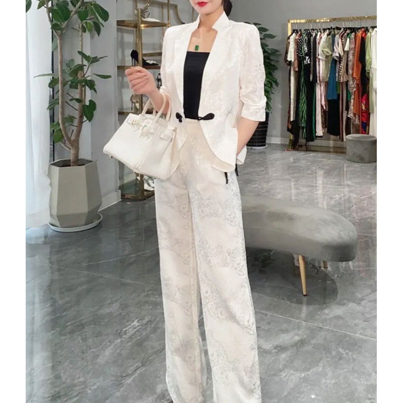 Bộ trang phục hai mảnh dành cho nữ, thiết kế dáng rộng thoải mái, phù hợp cho môi trường công sở. Chất vải mỏng nhẹ, đường nét dệt hoa văn tinh tế tạo điểm nhấn. Áo khoác dáng thẳng và quần ống rộng giúp tôn dáng, toát lên vẻ ngoài gọn gàng, tự tin. Dễ dàng phối cùng áo thun bên trong hoặc mang theo khi cần di chuyển nhiều. | Tên sản phẩm: Áo Vest Nữ Vest Cả Bộ 2 Món Họa Tiết Hoa Hàng Mùa Hè Đồ Công Sở - Thời Trang Nữ | Mã sản phẩm: k0441 - Giá: 2.490.000đ | Mã nhà sản xuất: CHTYAI-G05Hình ảnh sản phẩm