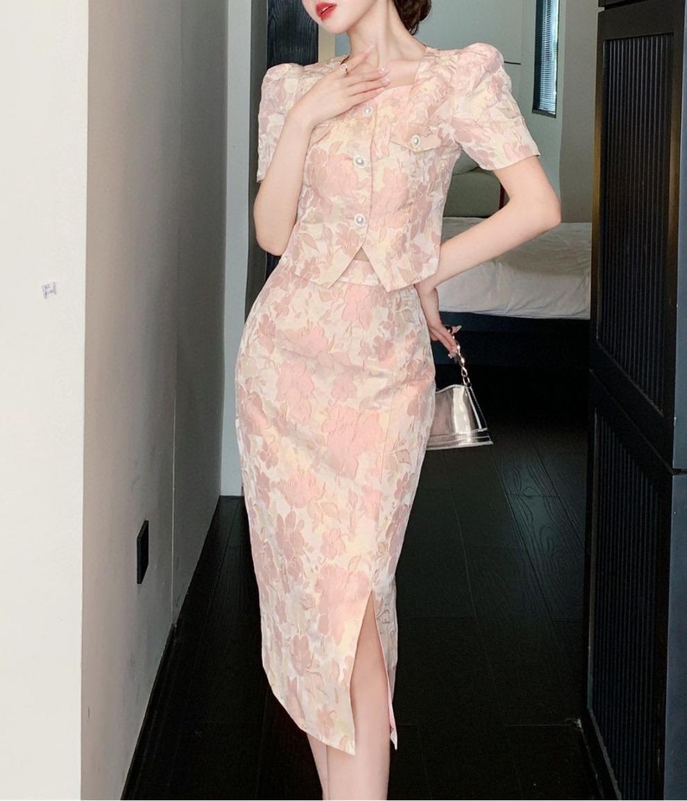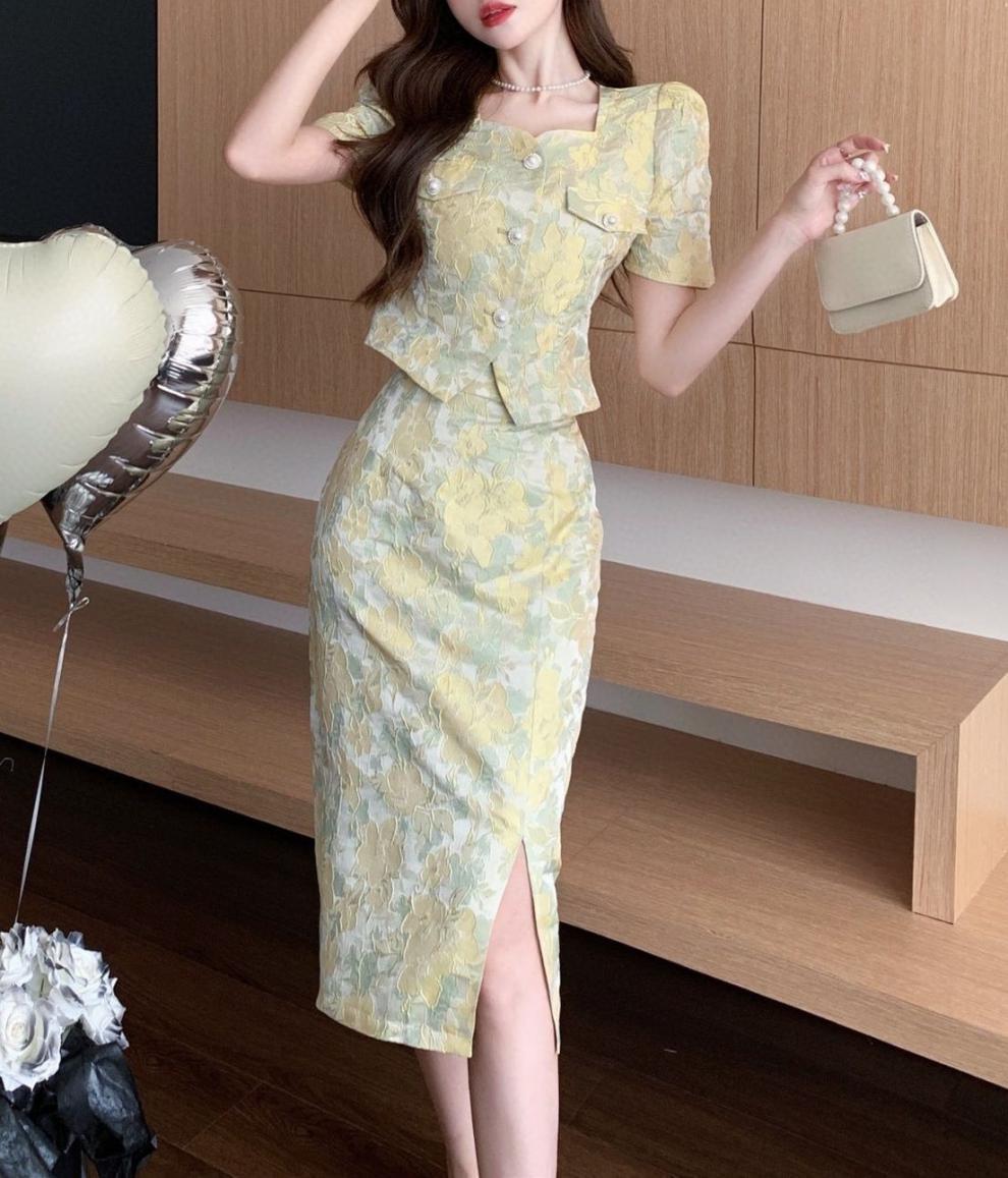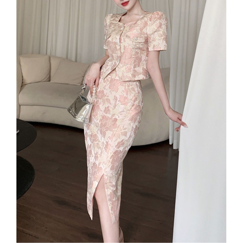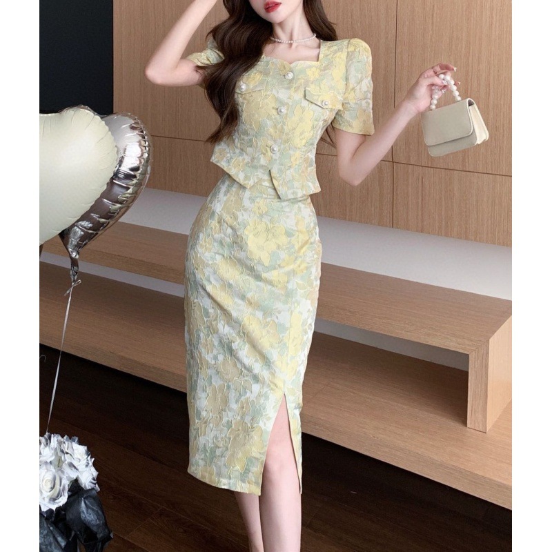 Bộ trang phục hai mảnh này gồm áo ngắn và chân váy, được thiết kế dành riêng cho mùa hè. Áo kiểu dáng ngắn tay, phối cùng chân váy dài tạo nên vẻ ngoại hình thanh lịch. Chất vải dệt hoa văn tinh tế, mang đến cảm giác mát mẻ, thoải mái khi mặc. Bạn có thể phối bộ này đi làm, dự tiệc hoặc những dịp gặp mặt thông thường. Mix đồ hoàn chỉnh cùng giày cao gót và túi xách nhỏ để có vẻ ngoài hài hòa. | Tên sản phẩm: Đồ Bộ Nữ Cả Bộ 2 Món Họa Tiết Hoa Hàng Mùa Hè - Thời Trang Nữ | Mã sản phẩm: k0791 - Giá: 1.430.000đ | Mã nhà sản xuất: CHTYAI-G04Hình ảnh sản phẩm
