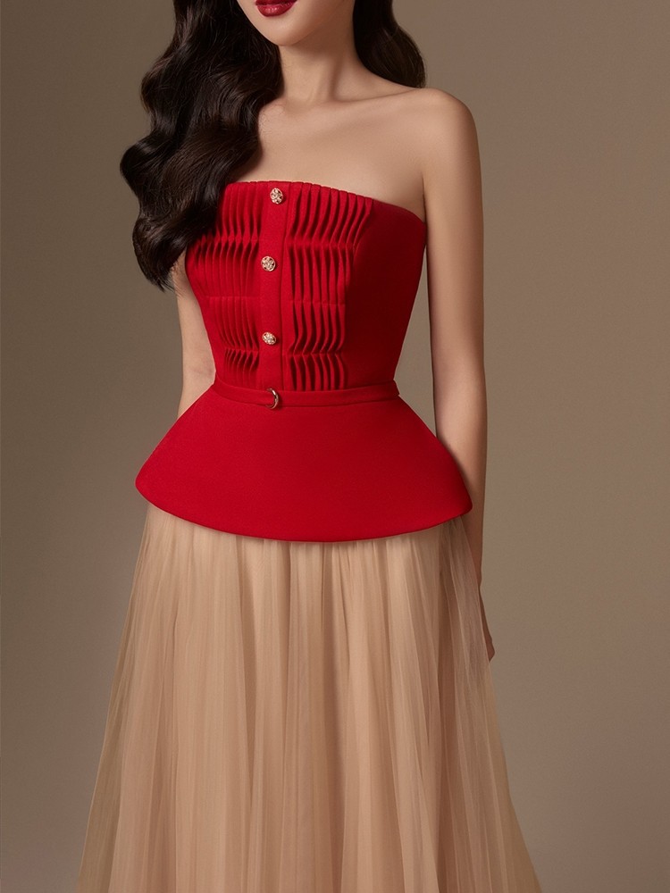 Bộ trang phục này có phần áo dạng dây đeo và chân váy xếp lớp, được làm từ chất liệu vải xếp nếp mềm mại. Thiết kế mang phong cách cổ điển với tông màu đỏ thắm nổi bật. Bạn có thể mặc bộ này để dự tiệc hoặc trong những dịp cần ăn mặc chỉn chu. Cách phối đồ rất đơn giản, chỉ cần mặc áo và váy đi cùng nhau là đã có một bộ trang phục hoàn chỉnh và hài hòa. | Tên sản phẩm: Đồ Bộ Nữ Phục Cổ Cổ Điển - Thời Trang Nữ | Mã sản phẩm: K0831 - Giá: 2.260.000đ | Mã nhà sản xuất: FORYCT-G05Hình ảnh sản phẩm