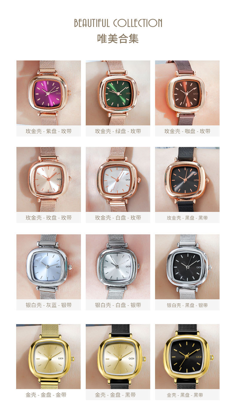 Chiếc đồng hồ nữ này mang phong cách đơn giản, hiện đại với dây đeo dạng lưới co giãn thoải mái. Mặt đồng hồ vuông nhỏ xinh kết hợp cùng bộ máy pin hoạt động chính xác. Sản phẩm có khả năng chống nước nhẹ phù hợp cho việc sử dụng hằng ngày. Bạn có thể dễ dàng điều chỉnh dây đeo và xem giờ một cách thuận tiện trong nhiều hoạt động. | Tên sản phẩm: Đồng Hồ Nữ Chống Nước Máy Pin, Máy Thạch Anh Phong Cách Hàn Quốc - Đồng Hồ Phụ Kiện Nữ | Mã sản phẩm: K1177 - Giá: 680.000đ | Mã nhà sản xuất: FODI-G02Hình ảnh sản phẩm