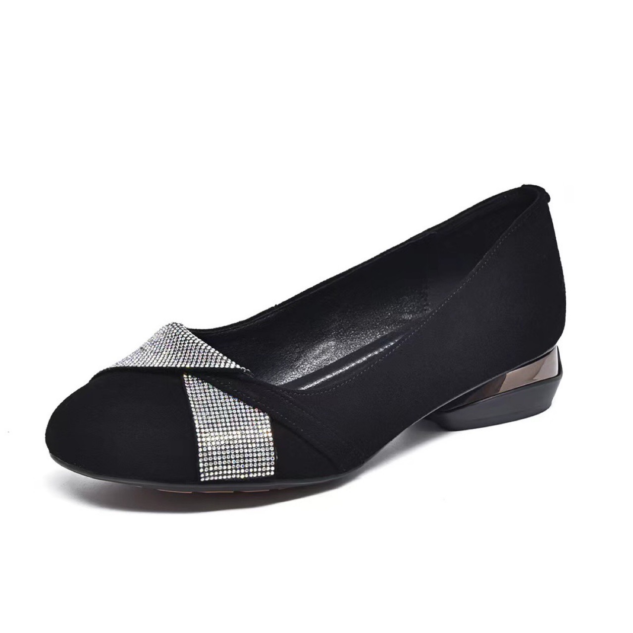 Giày sử dụng chất liệu da mềm mại kết hợp bề mặt nhám, điểm nhấn là những viên đá lấp lánh tinh tế. Kiểu dáng giày búp bê tròn trịa, đế bằng phẳng và mềm dẻo giúp mang lại cảm giác dễ chịu khi di chuyển. Thiết kế không cần buộc dây, chỉ cần xỏ chân vào là vừa vặn, rất tiện lợi cho những hoạt động thường ngày. Phù hợp để phối cùng nhiều loại trang phục khác nhau trong tiết trời mùa xuân hay mùa thu. | Tên sản phẩm: Giày Da Nữ Chất Liệu Da Bò Gắn Đá Mũi Tròn Đế Mềm Hàng Mùa Xuân Thu Đông - Giày Dép Nữ | Mã sản phẩm: K1391 - Giá: 1.350.000đ | Mã nhà sản xuất: TOREHU-G04Hình ảnh sản phẩm
