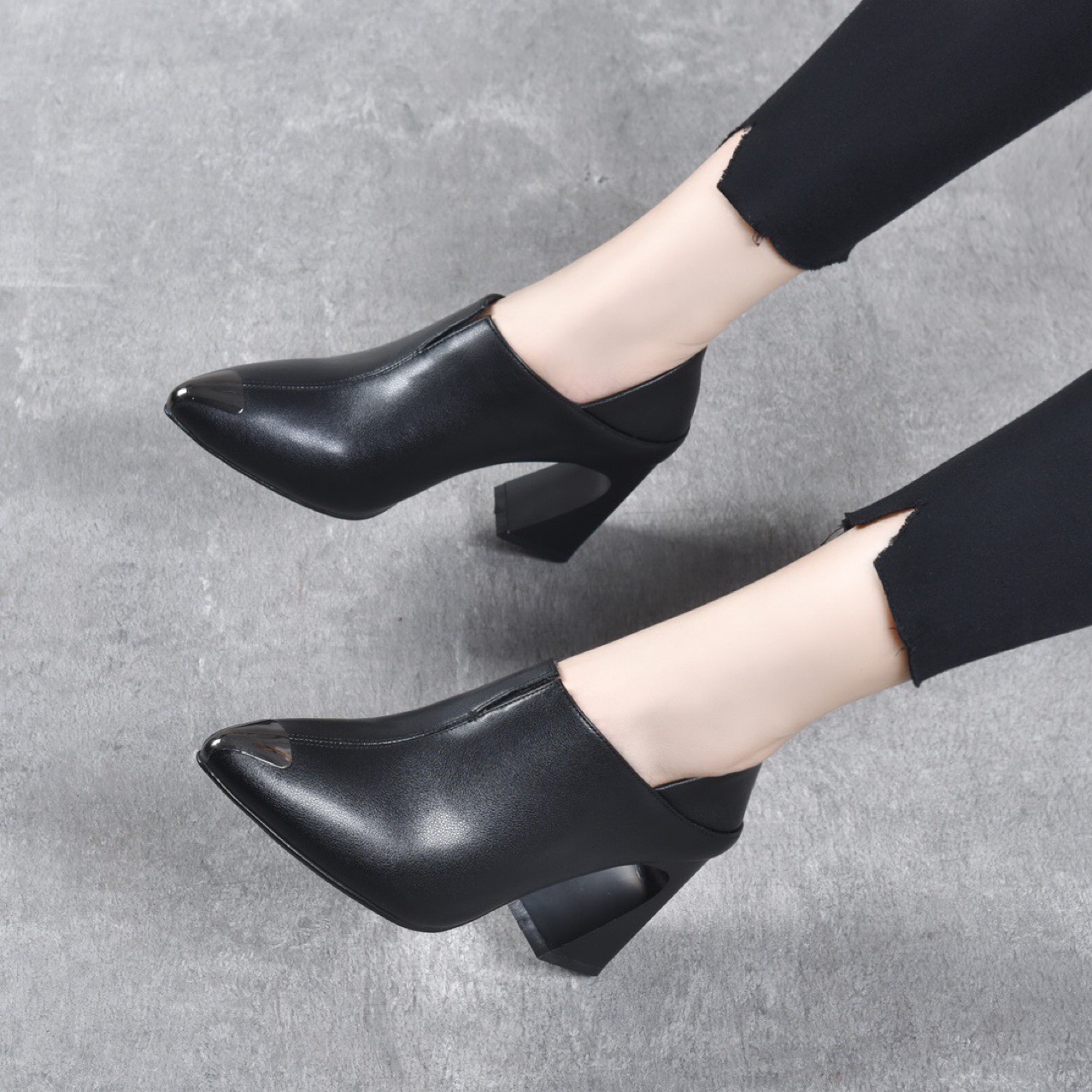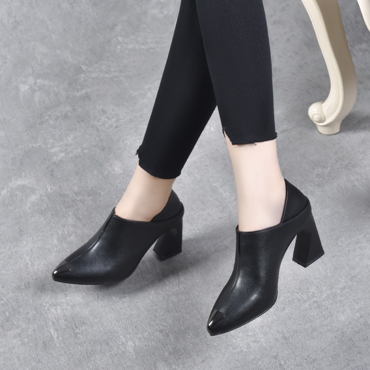 Đôi giày này có phần mũi nhọn và gót thấp chắc chắn, giúp bạn di chuyển thoải mái cả ngày. Sản phẩm được làm từ chất liệu da mềm mại, ôm vừa vặn bàn chân qua kiểu dáng cổ sâu. Mẫu mã thiết kế theo phong cách Hàn Quốc, kết hợp giữa giày bốt cổ thấp và dép qu hậu, tạo nên vẻ ngoại hình lịch sự. Màu đen dễ dàng phối hợp với nhiều trang phục khác nhau. Bạn chỉ cần xỏ chân vào và dùng qu hậu để giữ chặt giày. | Tên sản phẩm: Giày Cao Gót Nữ Chất Liệu Da Bò Mũi Nhọn Gót Vuông Phong Cách Hàn Quốc - Giày Dép Nữ | Mã sản phẩm: K1395 - Giá: 1.300.000đ | Mã nhà sản xuất: TOREHU-G04Hình ảnh sản phẩm