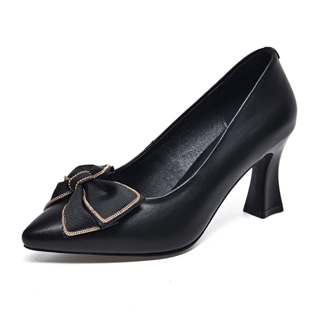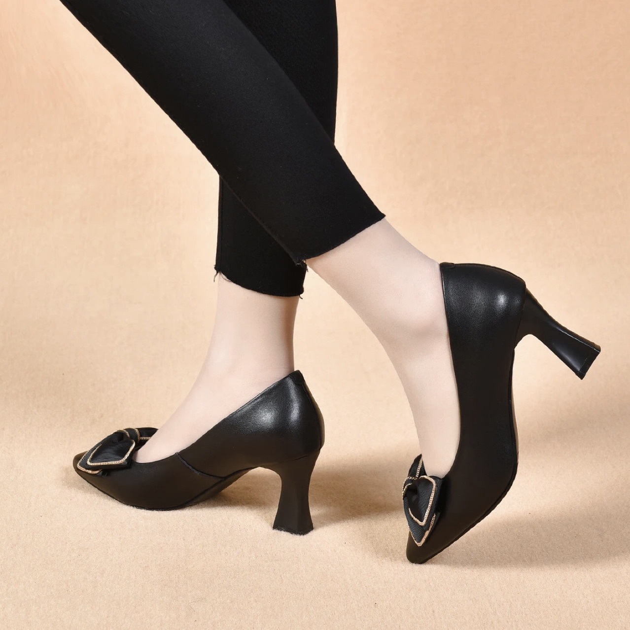 Giày dành cho nữ với phần mũi nhọn và cổ thấp, ôm gọn bàn chân. Sản phẩm được làm từ chất liệu da mềm mại, mang lại cảm giác dễ chịu khi mang trong những ngày xuân hè. Đế giày được thiết kế mềm mại, giúp bước đi nhẹ nhàng và thoải mái hơn. Điểm nhấn là chi tiết nơ trang trí ở phía trước, tạo nét duyên dáng. Bạn có thể phối hợp cùng nhiều loại trang phục khác nhau để tạo điểm nhấn. | Tên sản phẩm: Giày Cao Gót Nữ Chất Liệu Da Bò Thắt Nơ Bướm Mũi Nhọn Đế Mềm Hàng Mùa Hè Trung Niên - Giày Dép Nữ | Mã sản phẩm: K1656 - Giá: 1.350.000đ | Mã nhà sản xuất: TOREHU-G04Hình ảnh sản phẩm