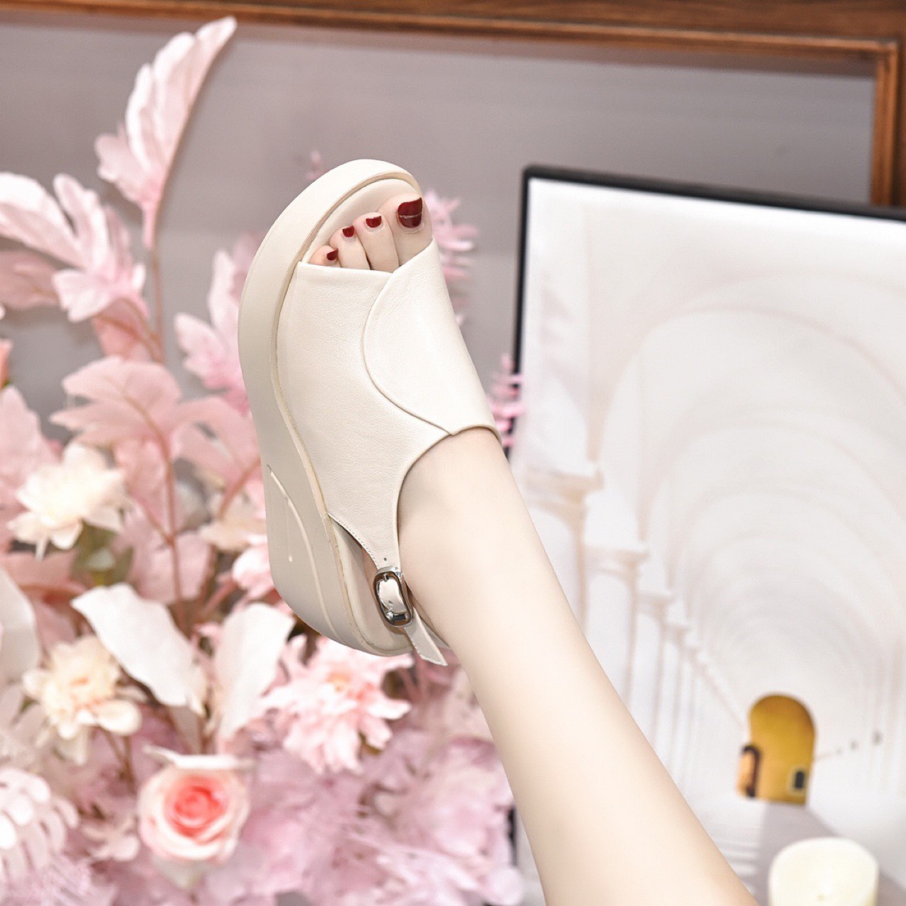 Đôi giày sandal nữ này có phần đế dày và gót chắc chắn, giúp tăng chiều cao một cách thoải mái. Kiểu dáng phía trước hở ngón tạo nên điểm nhấn riêng. Sản phẩm được làm từ chất liệu da mềm mại, ôm chân nhờ khóa dán tiện lợi. Bạn có thể dễ dàng phối cùng nhiều trang phục để đi chơi hay đi làm hằng ngày. Chỉ cần gài khóa và chỉnh độ vừa vặn là đã sẵn sàng để bước đi. | Tên sản phẩm: Giày Cao Gót Nữ Chất Liệu Da Bò Gót Vuông Tăng Chiều Cao Miệng Cá Hàng Mùa Hè - Giày Dép Nữ | Mã sản phẩm: K1680 - Giá: 1.350.000đ | Mã nhà sản xuất: TOREHU-G04Hình ảnh sản phẩm