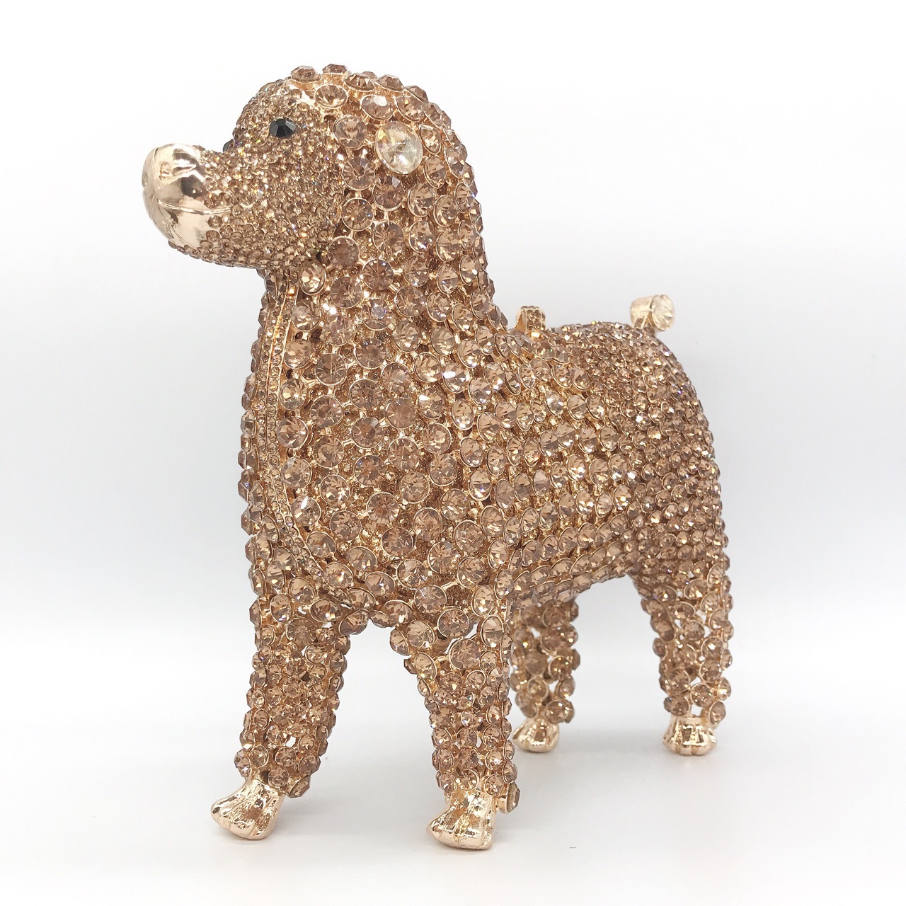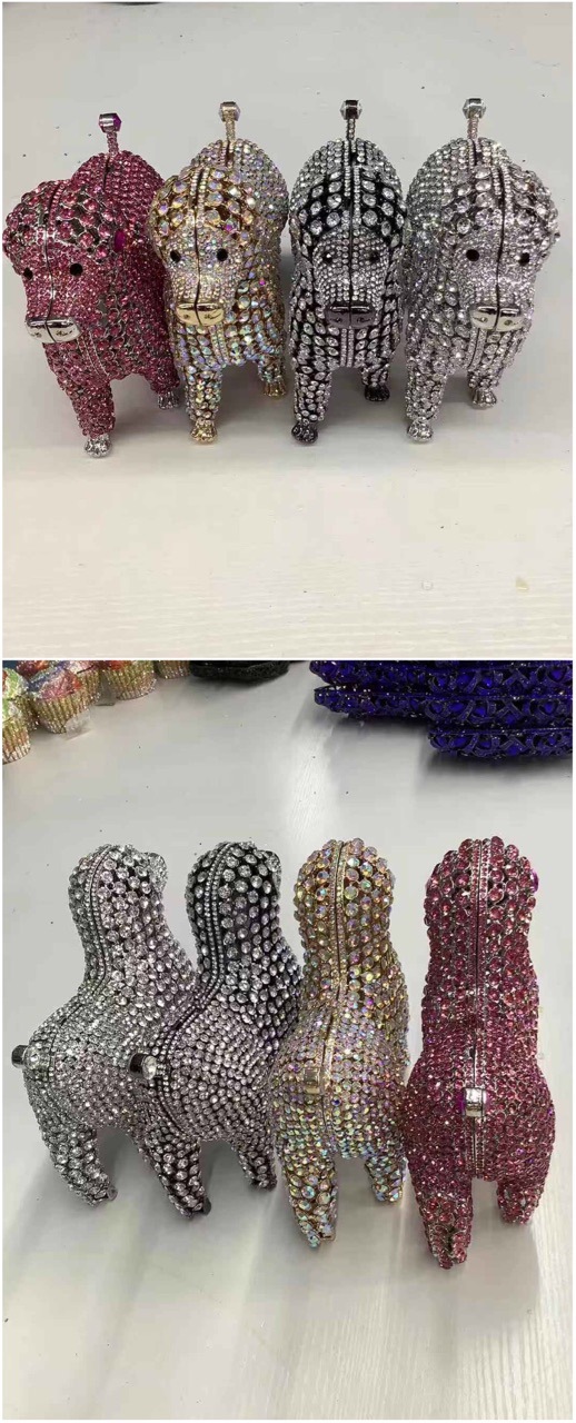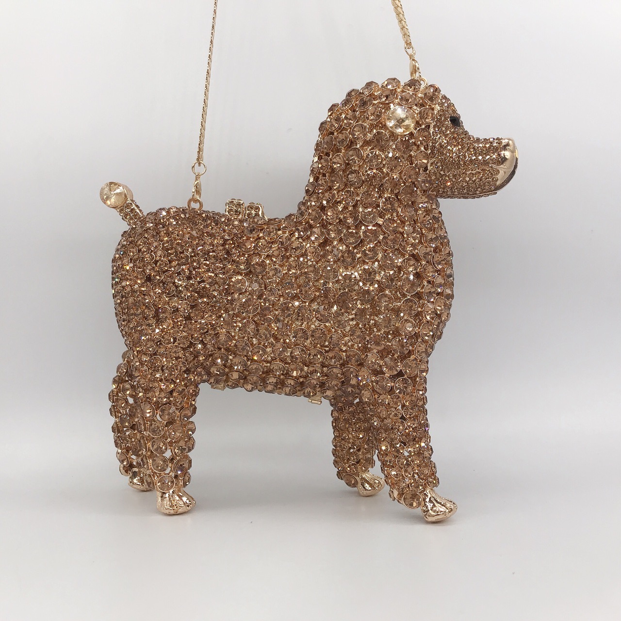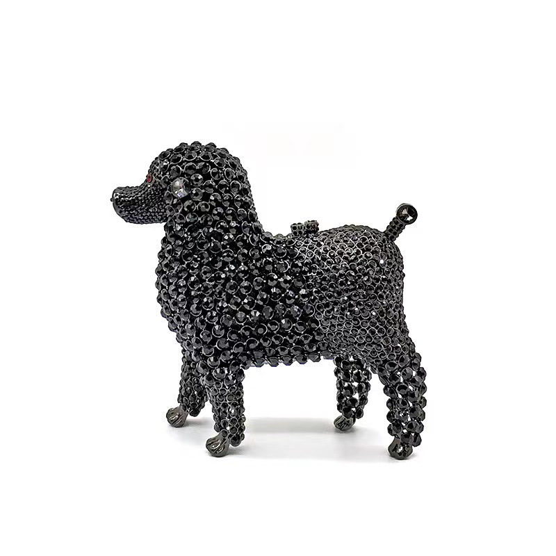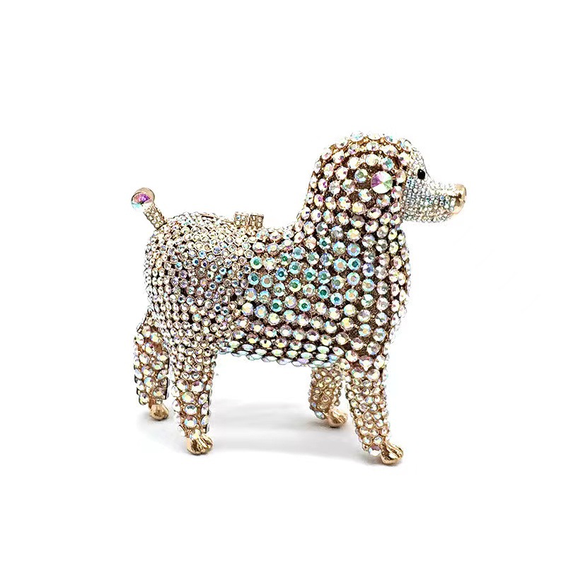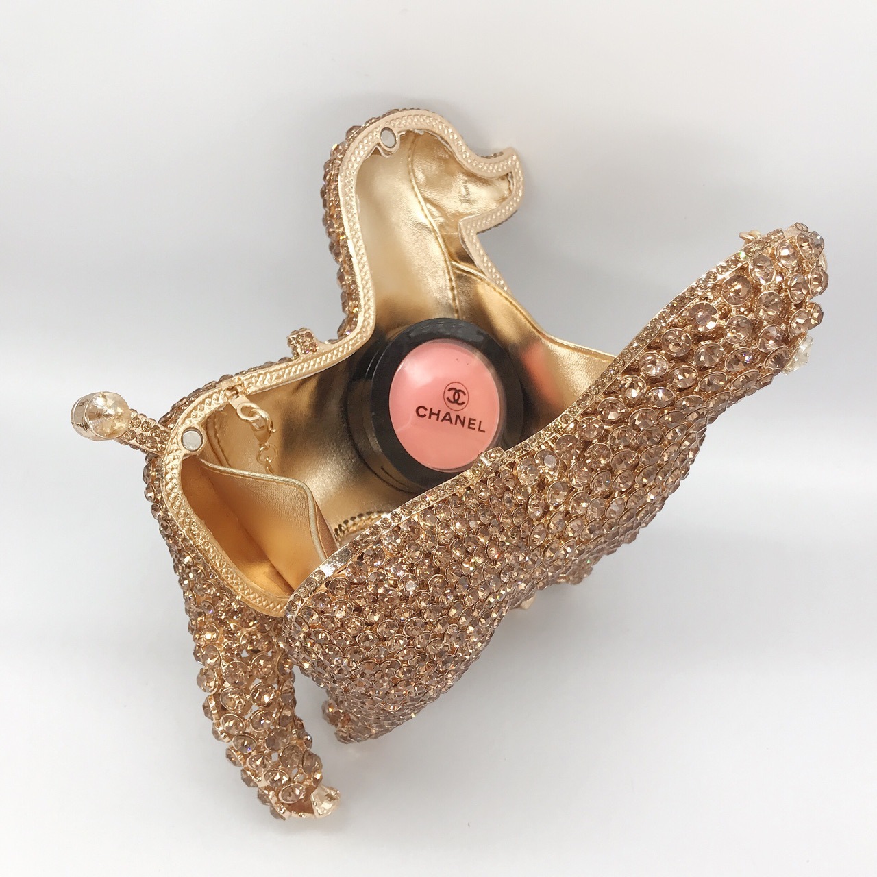 Túi cầm tay kiểu dáng chú cún con lấp lánh, điểm nhấn đáng yêu cho các buổi tiệc tối. Toàn bộ mặt túi được phủ kín các hạt đá lấp lánh tinh xảo. Khung viền bằng kim loại chắc chắn tạo hình hộp cứng cáp, kết hợp phần thiết kế rỗng tinh tế. Đây là mẫu túi thời thượng, phù hợp để cầm tay khi dự tiệc hoặc sự kiện. Dùng để đựy các vật dụng nhỏ như điện thoại, son môi và chiếc ví xinh xắn. | Tên sản phẩm: Ví Bóp Cầm Tay Nữ Phong Cách Âu Mỹ - Túi Ví Nữ | Mã sản phẩm: K1826 - Giá: 2.020.000đ | Mã nhà sản xuất: PURYRM-G05Hình ảnh sản phẩm