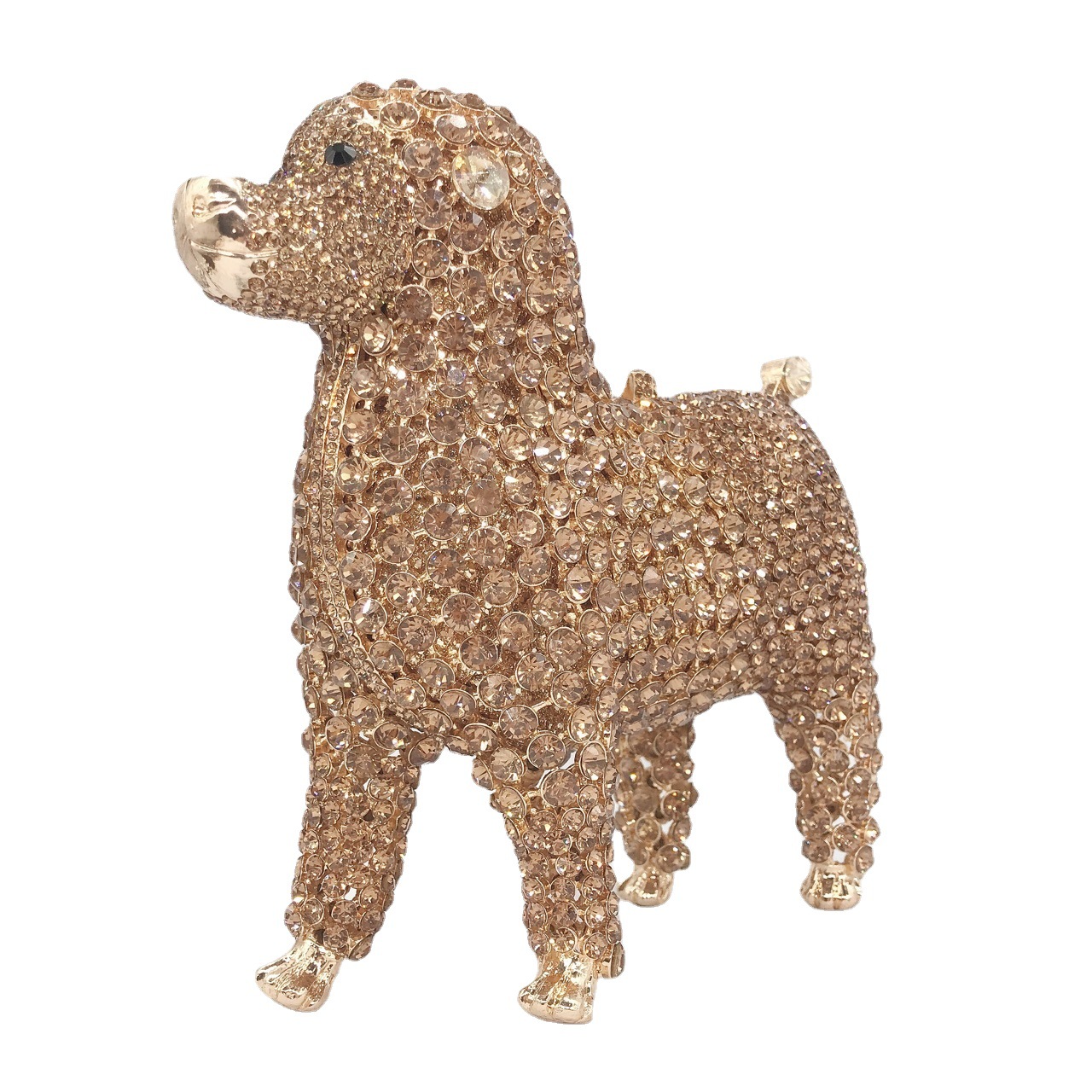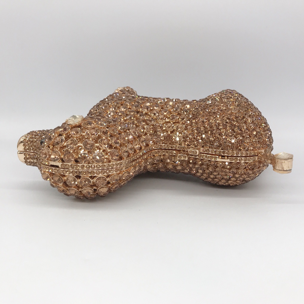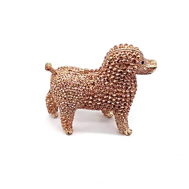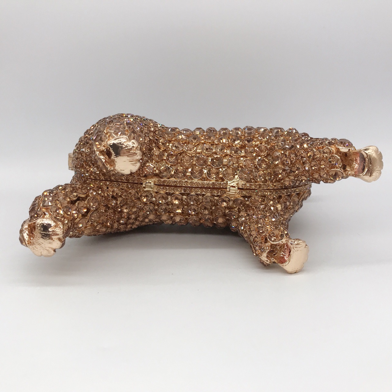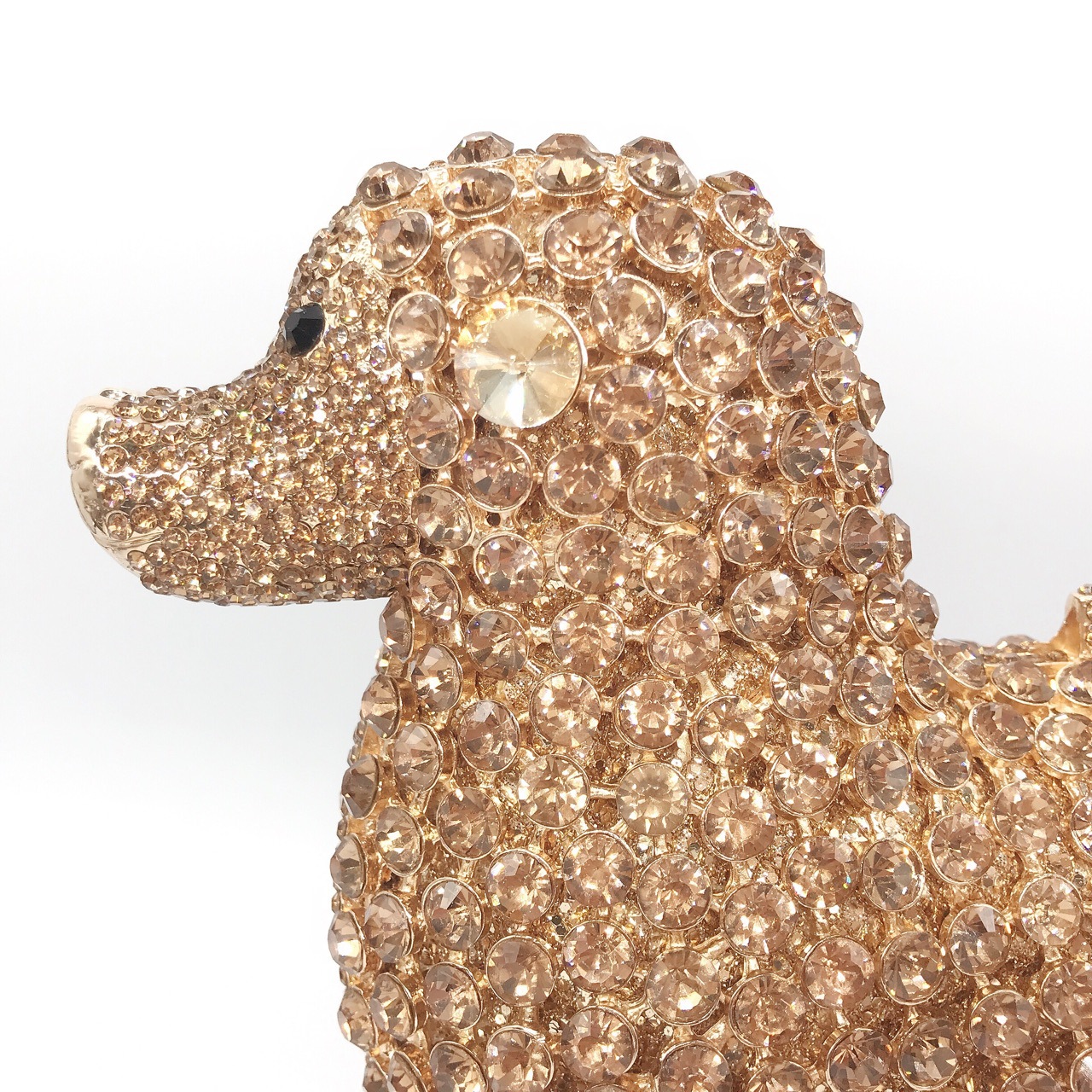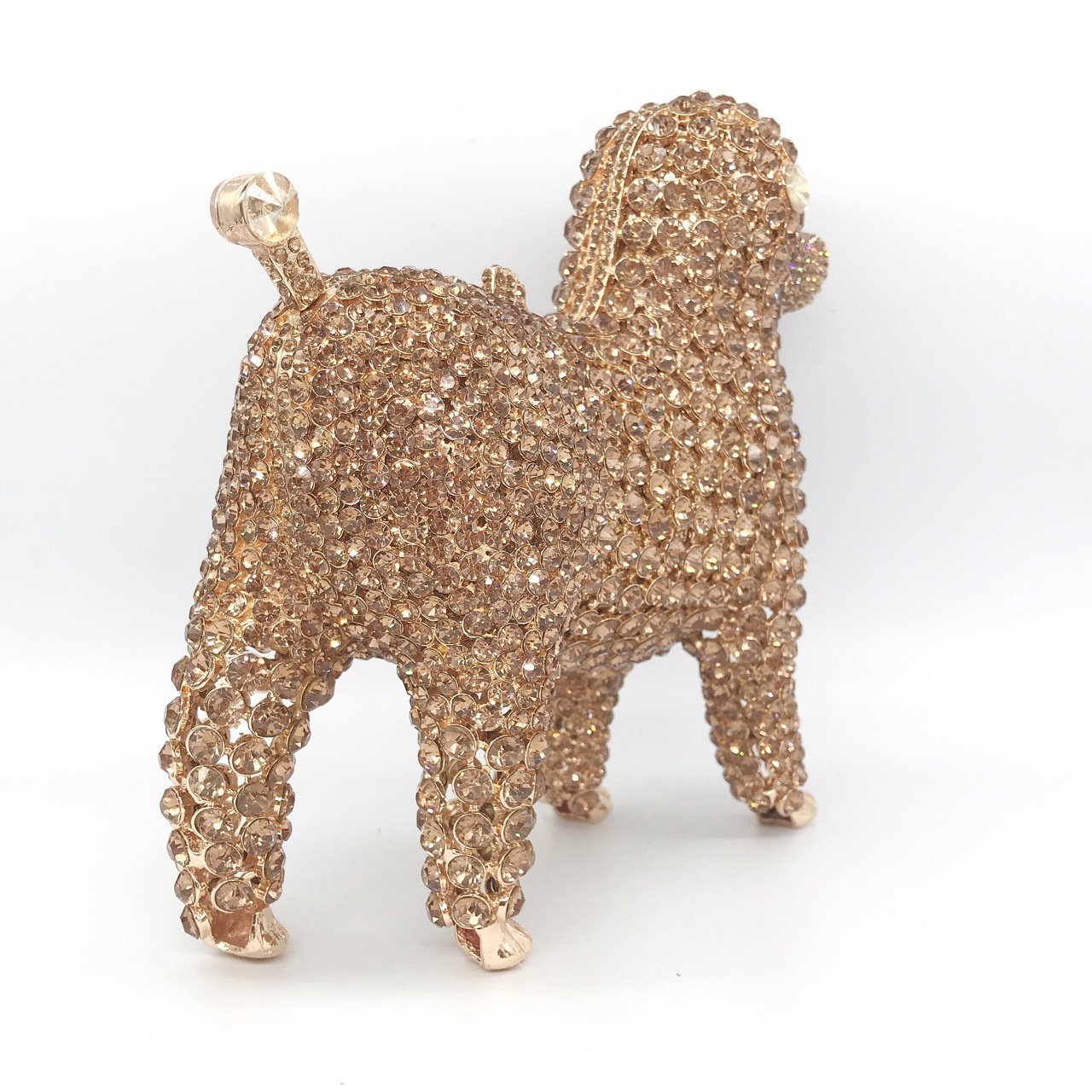 Túi cầm tay kiểu dáng chú cún con lấp lánh, điểm nhấn đáng yêu cho các buổi tiệc tối. Toàn bộ mặt túi được phủ kín các hạt đá lấp lánh tinh xảo. Khung viền bằng kim loại chắc chắn tạo hình hộp cứng cáp, kết hợp phần thiết kế rỗng tinh tế. Đây là mẫu túi thời thượng, phù hợp để cầm tay khi dự tiệc hoặc sự kiện. Dùng để đựy các vật dụng nhỏ như điện thoại, son môi và chiếc ví xinh xắn. | Tên sản phẩm: Ví Bóp Cầm Tay Nữ Phong Cách Âu Mỹ - Túi Ví Nữ | Mã sản phẩm: K1826 - Giá: 2.020.000đ | Mã nhà sản xuất: PURYRM-G05Hình ảnh sản phẩm