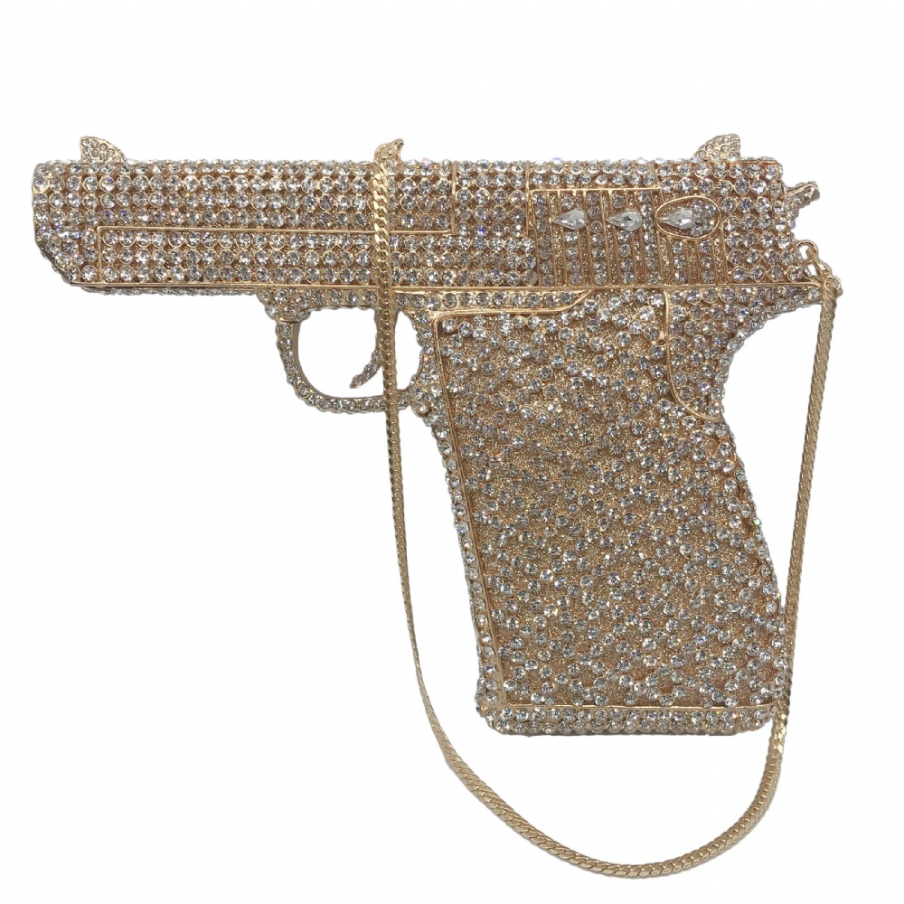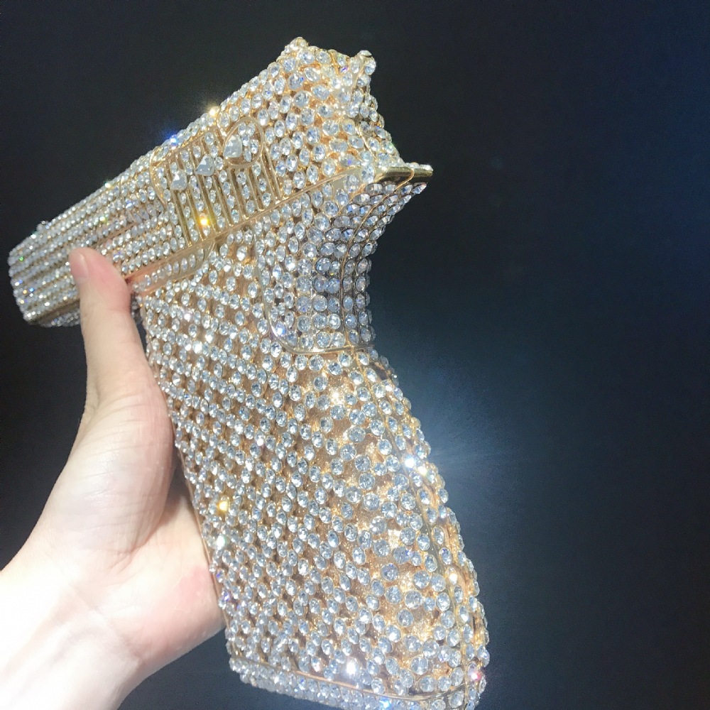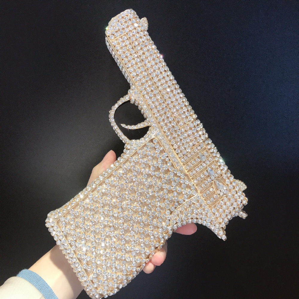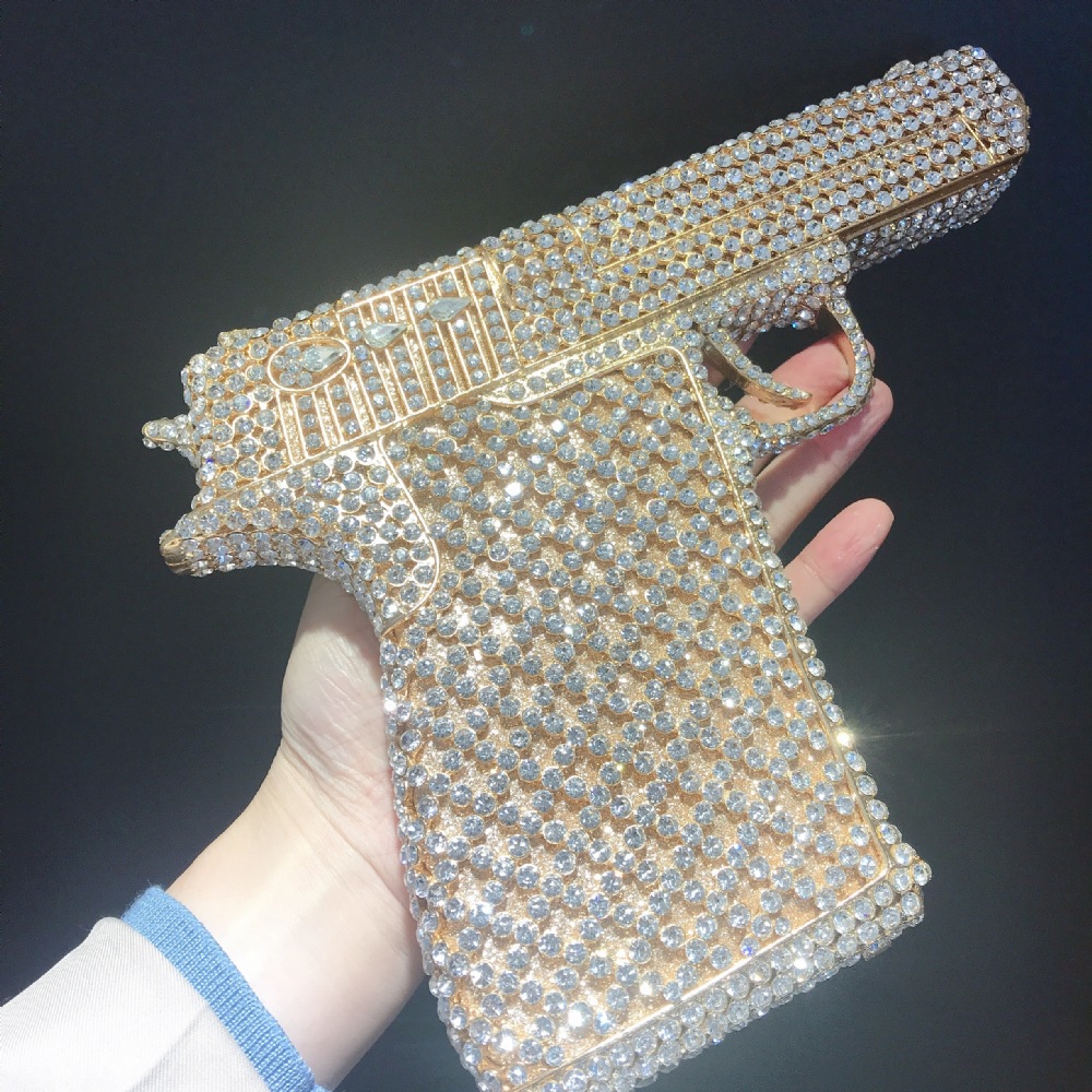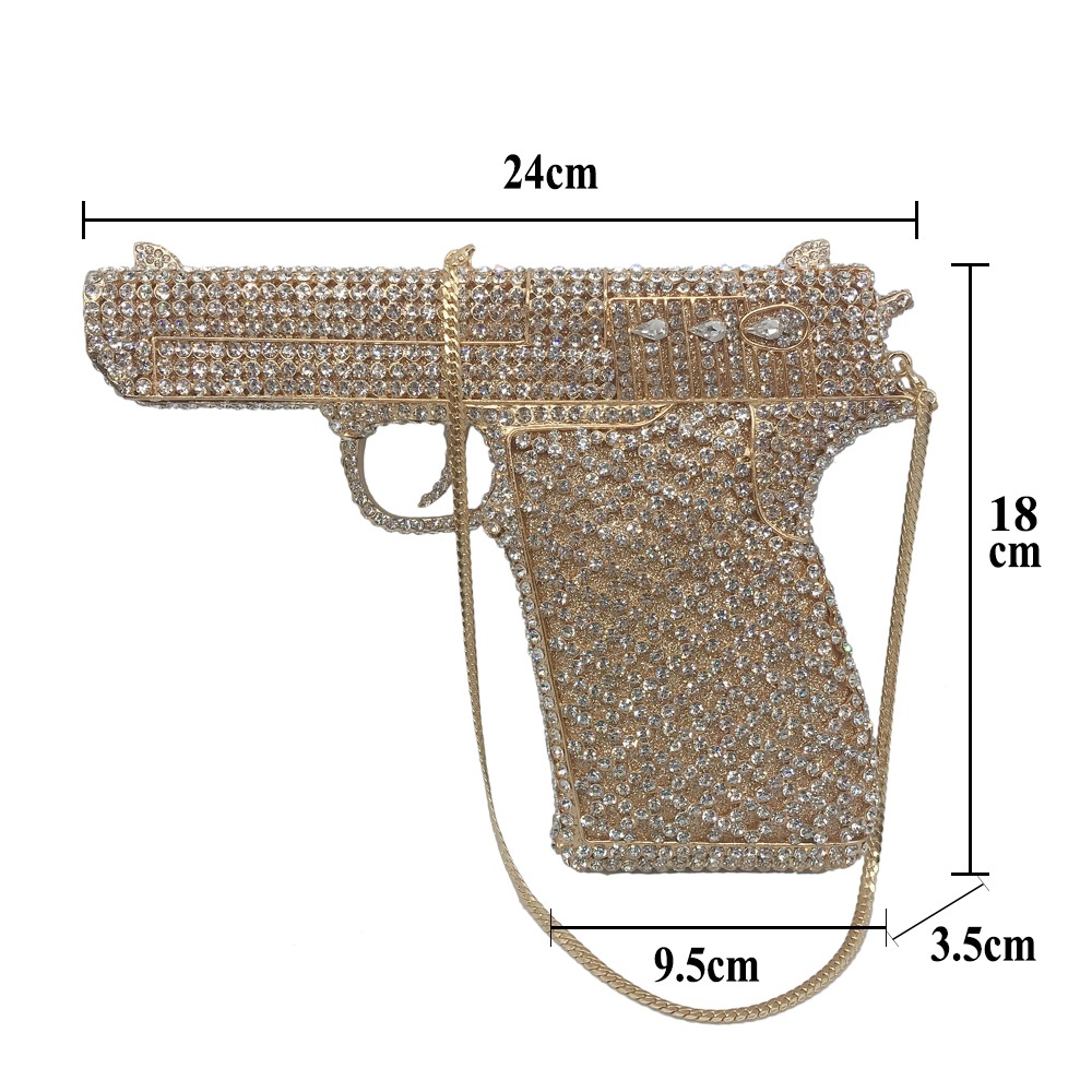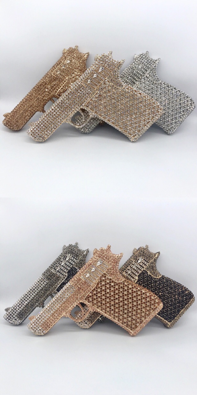 Túi cầm tay thiết kế kiểu súng lục độc đáo, phù hợp cho các buổi tiệc tối. Bề mặt túi được đính kín những hạt pha lê lấp lánh tạo điểm nhấn nổi bật. Kiểu dáng mang phong cách châu Âu hiện đại, giúp người dùng thêm phần tự tin. Khi sử dụng, bạn chỉ cần cầm phần thân túi hoặc kẹp nhẹ dưới cánh tay. Túi vừa vặn đựng được các vật dụng cần thiết như điện thoại, son môi và thẻ tiền. | Tên sản phẩm: Ví Bóp Cầm Tay Nữ Phong Cách Âu Mỹ - Túi Ví Nữ | Mã sản phẩm: K1827 - Giá: 2.210.000đ | Mã nhà sản xuất: PURYRM-G05Hình ảnh sản phẩm