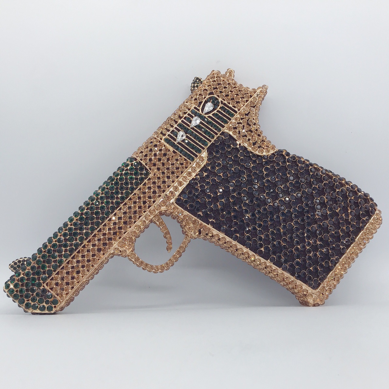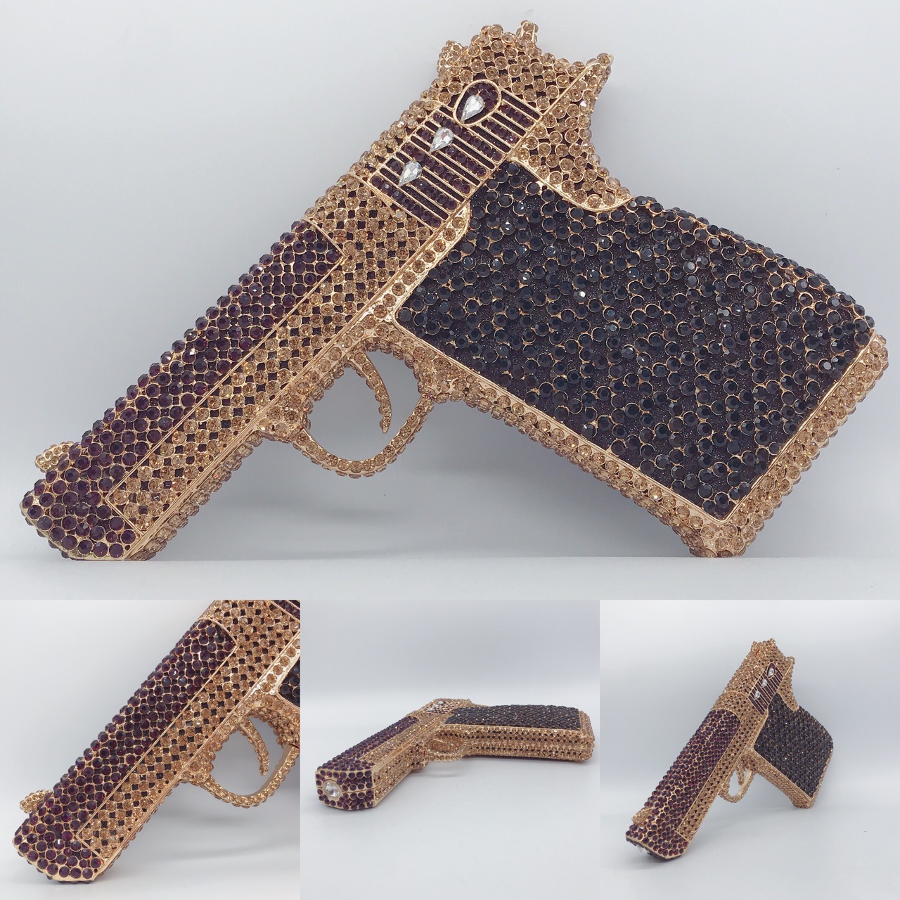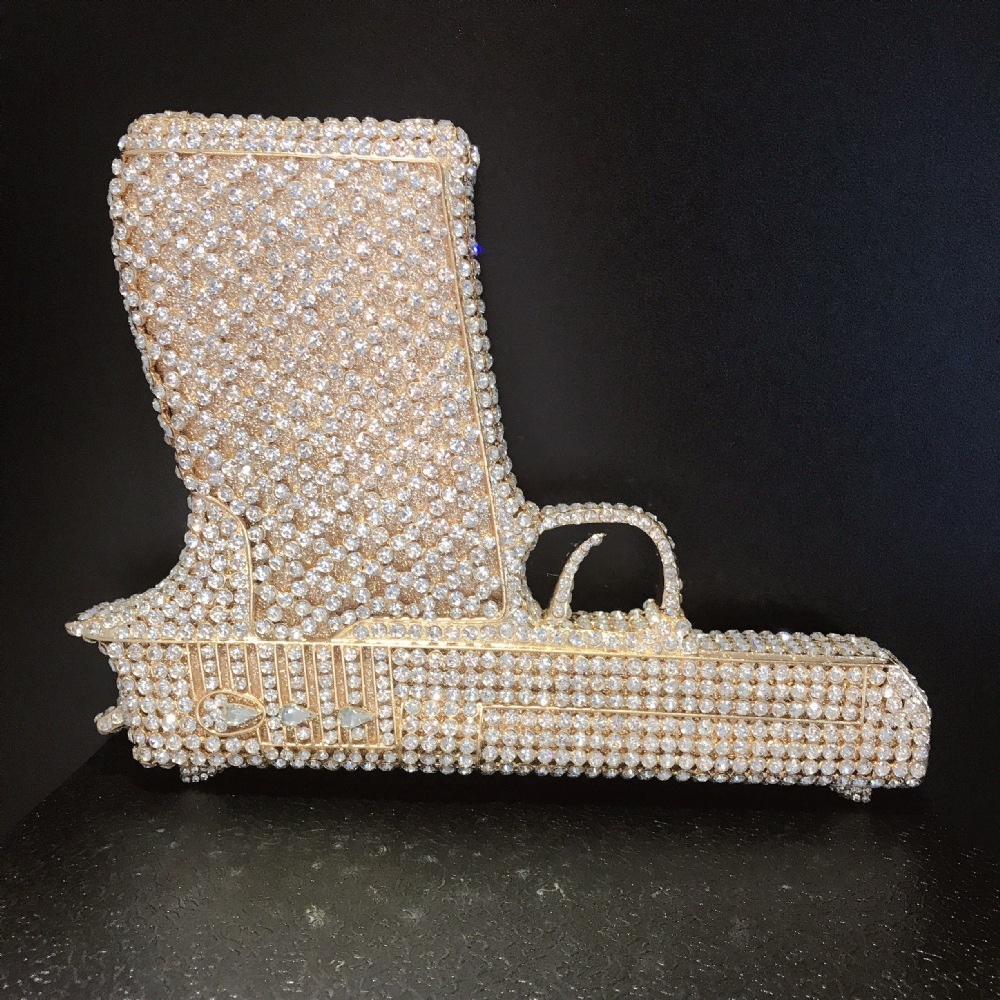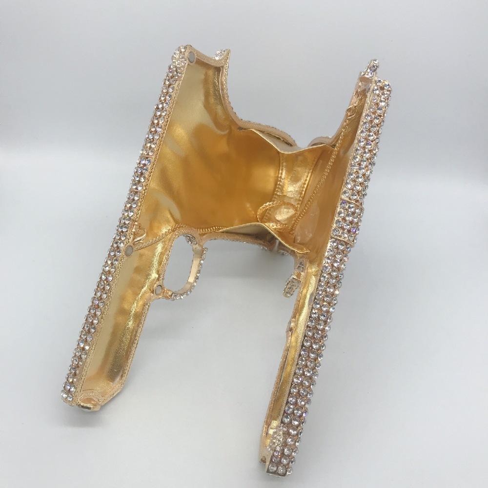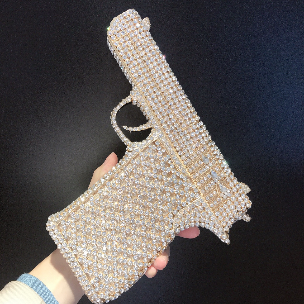 Túi cầm tay thiết kế kiểu súng lục độc đáo, phù hợp cho các buổi tiệc tối. Bề mặt túi được đính kín những hạt pha lê lấp lánh tạo điểm nhấn nổi bật. Kiểu dáng mang phong cách châu Âu hiện đại, giúp người dùng thêm phần tự tin. Khi sử dụng, bạn chỉ cần cầm phần thân túi hoặc kẹp nhẹ dưới cánh tay. Túi vừa vặn đựng được các vật dụng cần thiết như điện thoại, son môi và thẻ tiền. | Tên sản phẩm: Ví Bóp Cầm Tay Nữ Phong Cách Âu Mỹ - Túi Ví Nữ | Mã sản phẩm: K1827 - Giá: 2.210.000đ | Mã nhà sản xuất: PURYRM-G05Hình ảnh sản phẩm