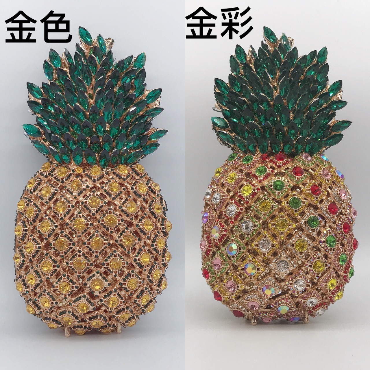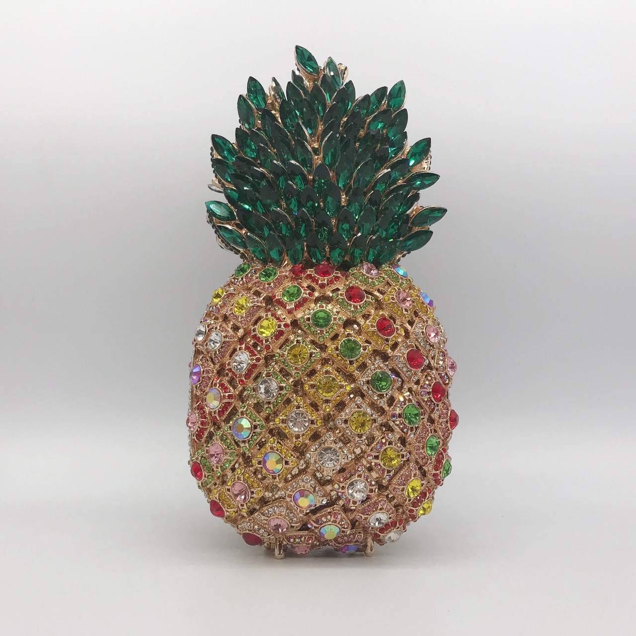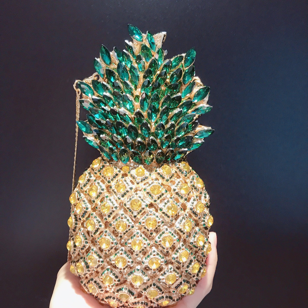 Chiếc túi cầm tay này có kiểu dáng quả dứa ngộ nghĩnh, được đính kín những hạt đá lấp lánh tinh xảo. Dáng túi nhỏ gọn, thích hợp mang trong những buổi tiệc tối hay sự kiện vui chơi. Bạn chỉ cần cầm tay hoặc kẹp nhẹ vào nách để kết hợp cùng các trang phục đi tiệc. Chất liệu cứng cáp giúp túi giữ được hình dáng ban đầu, bên trong vừa đủ để đựng các món đồ cá nhân cần thiết. | Tên sản phẩm: Ví Bóp Cầm Tay Nữ Gắn Đá - Túi Ví Nữ | Mã sản phẩm: K1845 - Giá: 1.920.000đ | Mã nhà sản xuất: PURYRM-G05Hình ảnh sản phẩm