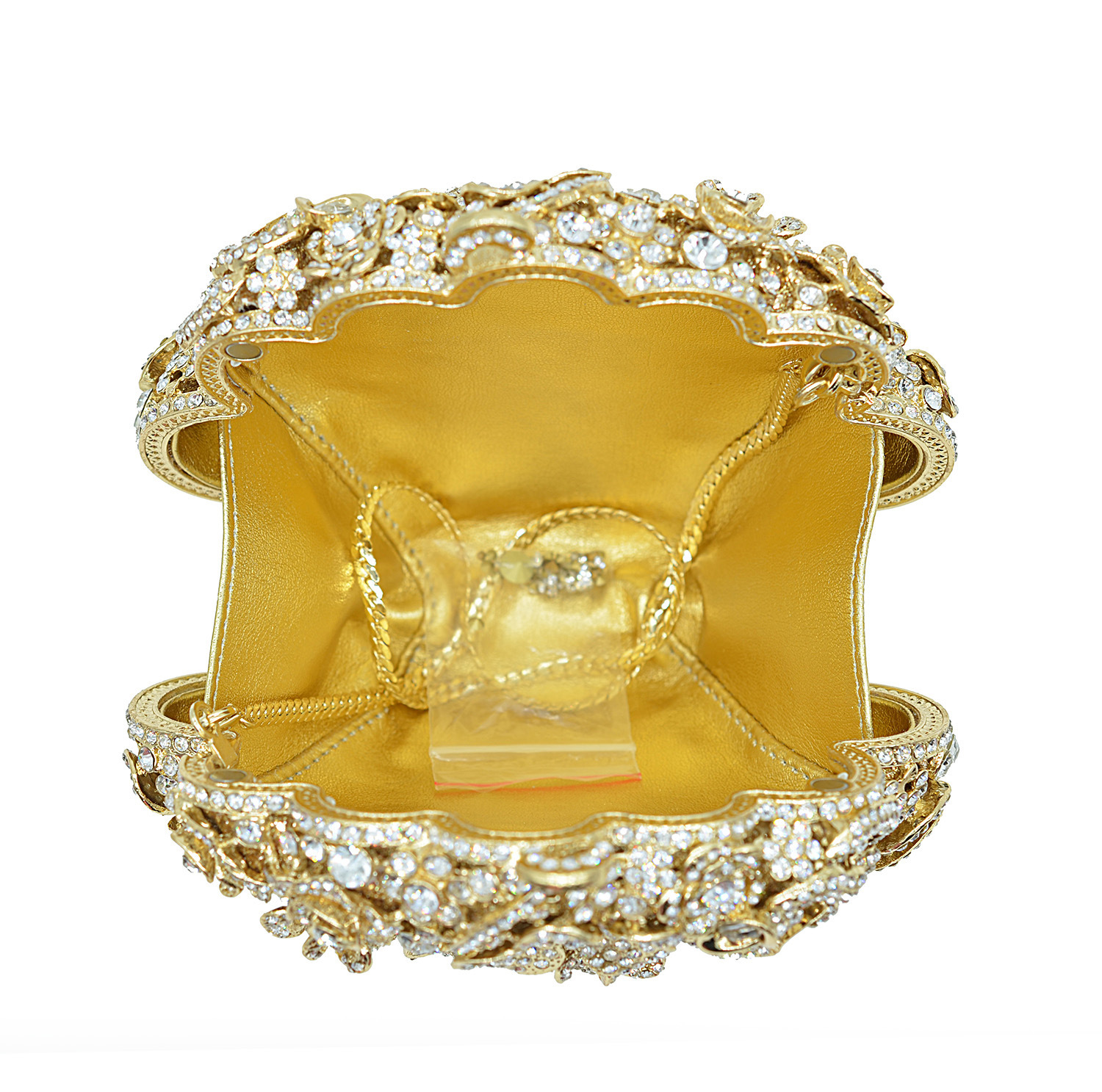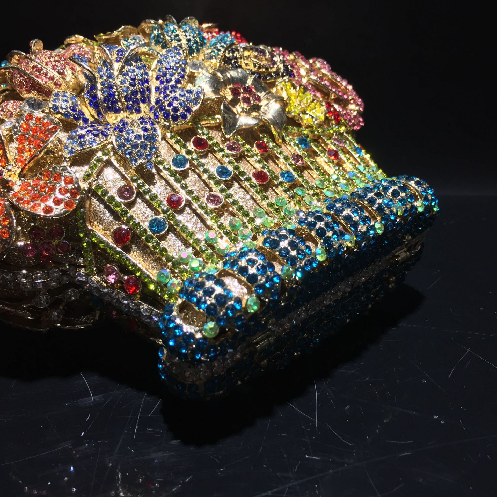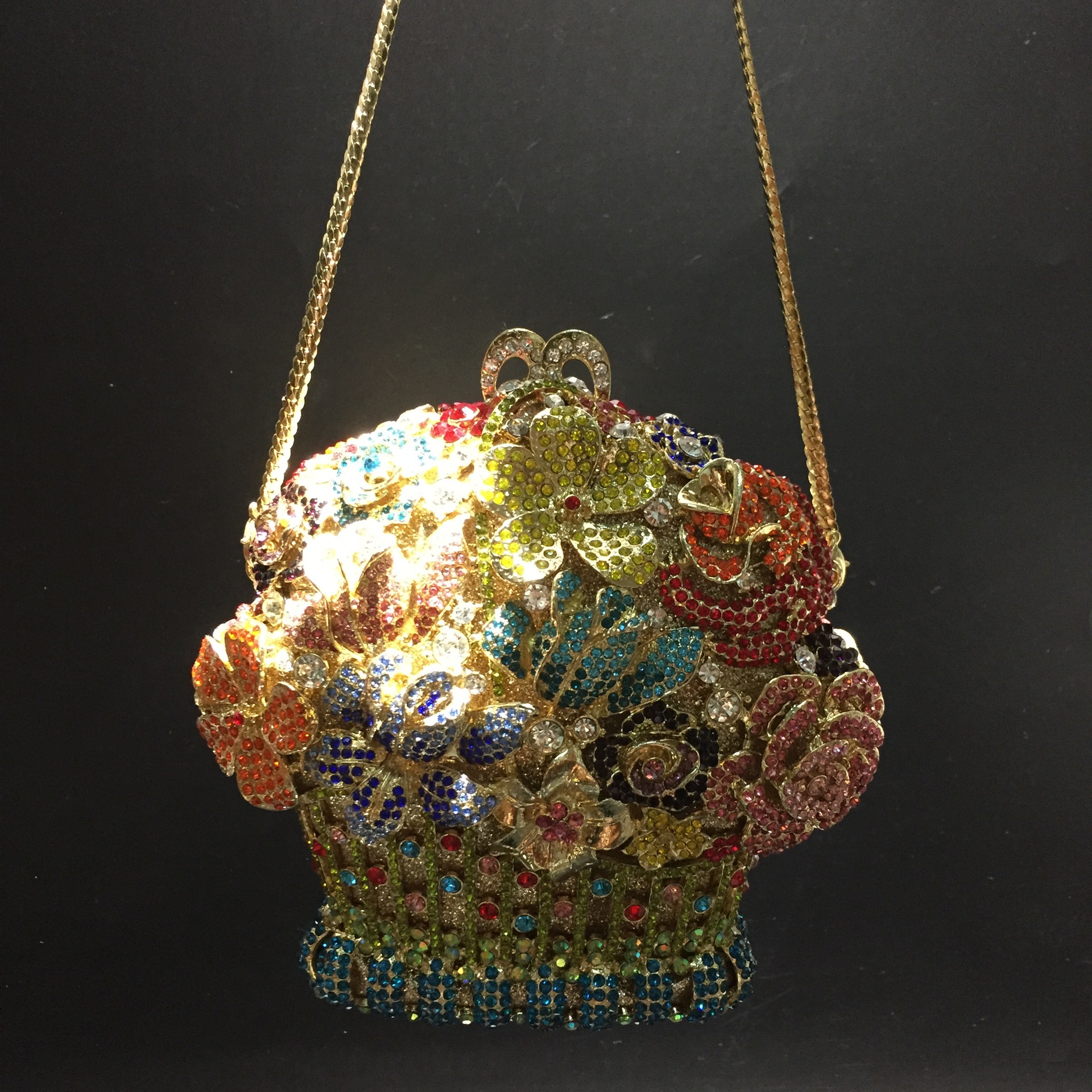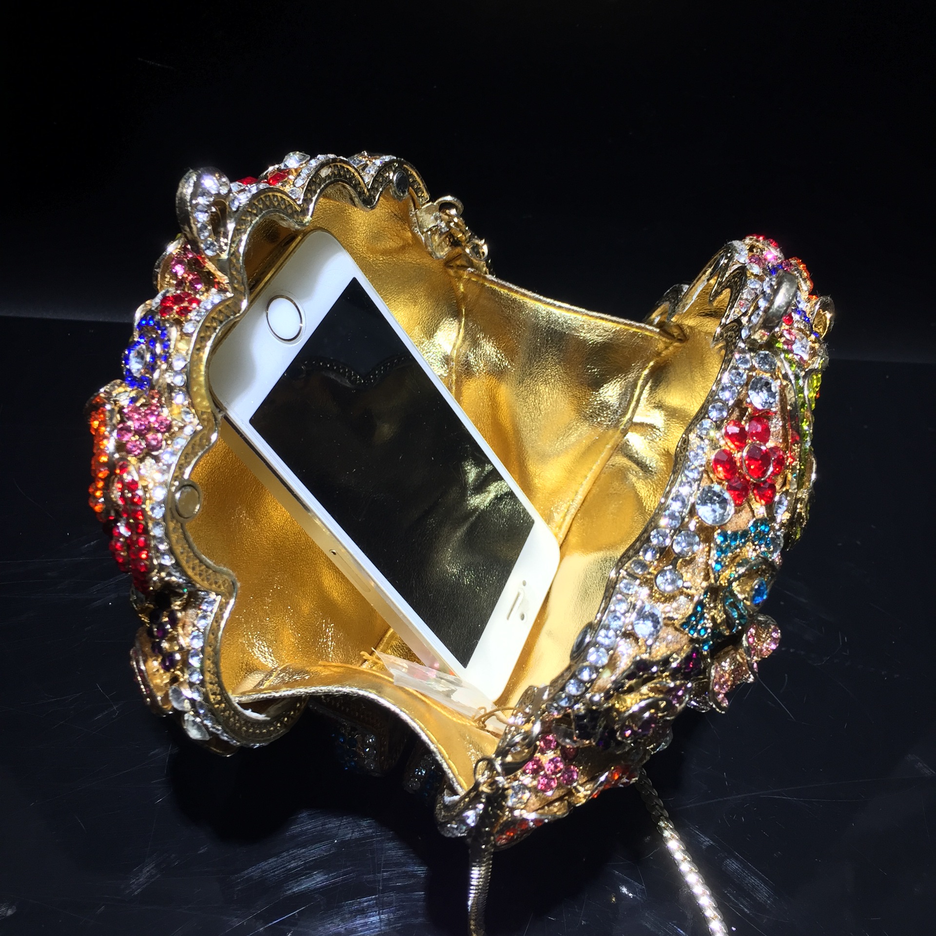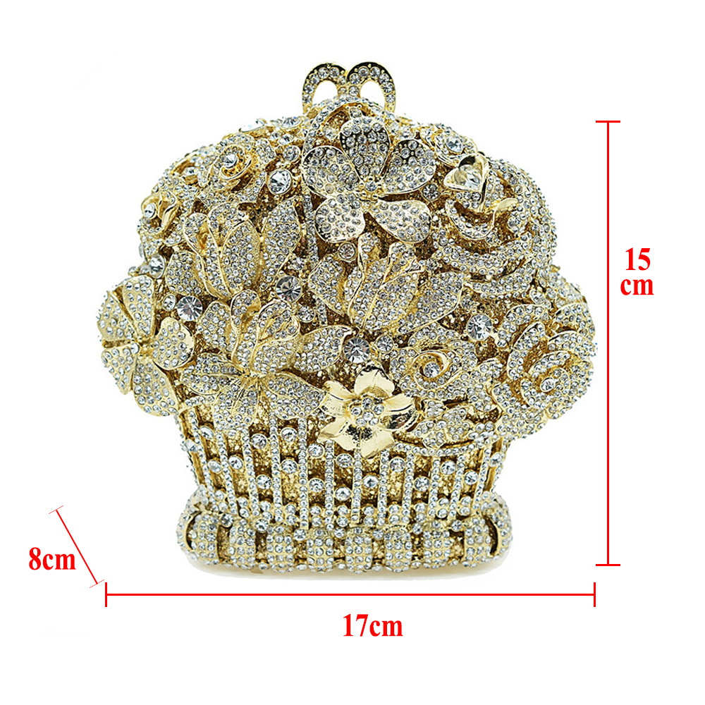 Chiếc túi cầm tay này có phần thân được làm từ kim loại tạo hình hoa văn thủ công tinh xảo. Các viên đá lấp lánh được gắn tỉ mỉ, kết hợp cùng phụ kiện pha lê trong suốt, tạo nên vẻ đẹp lung linh dưới ánh đèn. Kiểu dáng như một chiếc giỏ xách nhỏ, phù hợp để cầm tay hoặc khoác trên cánh tay trong các buổi tiệc. Sử dụng bằng cách mở khóa kéo để đựng các vật dụng cá nhân nhỏ gọn bên trong. | Tên sản phẩm: Ví Bóp Cầm Tay Nữ Họa Tiết Hoa - Túi Ví Nữ | Mã sản phẩm: K1880 - Giá: 2.120.000đ | Mã nhà sản xuất: PURYRM-G05Hình ảnh sản phẩm