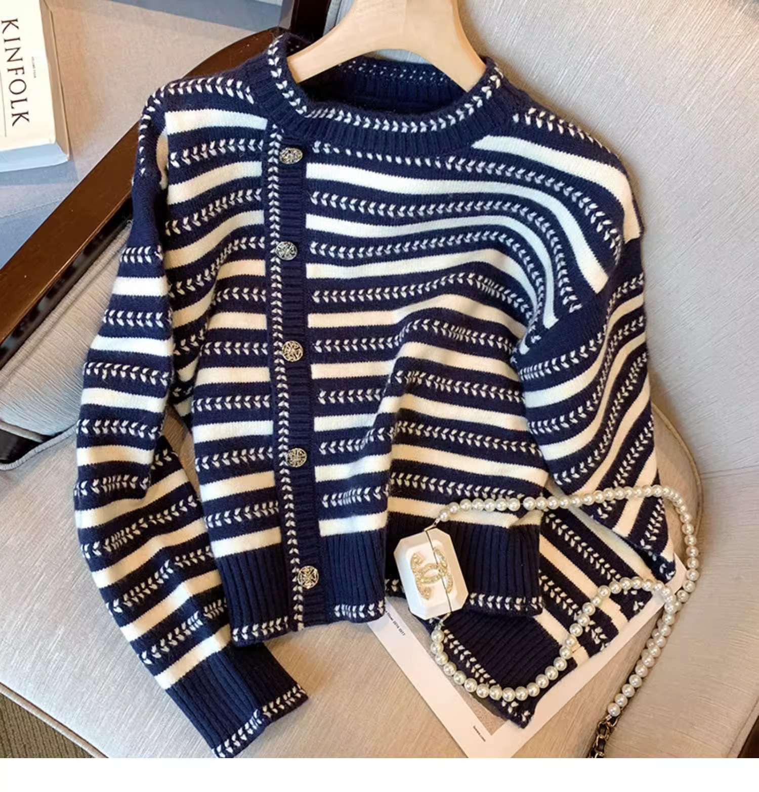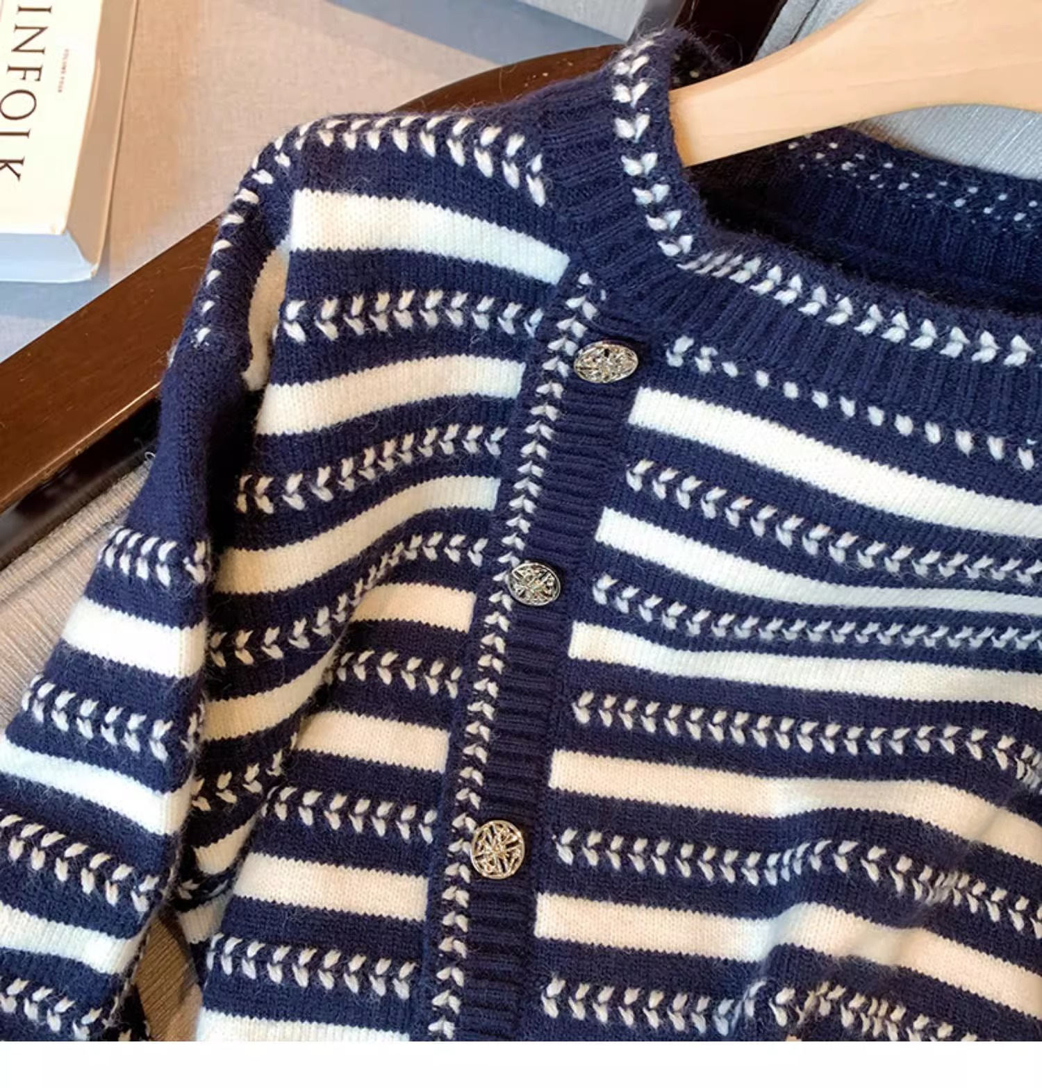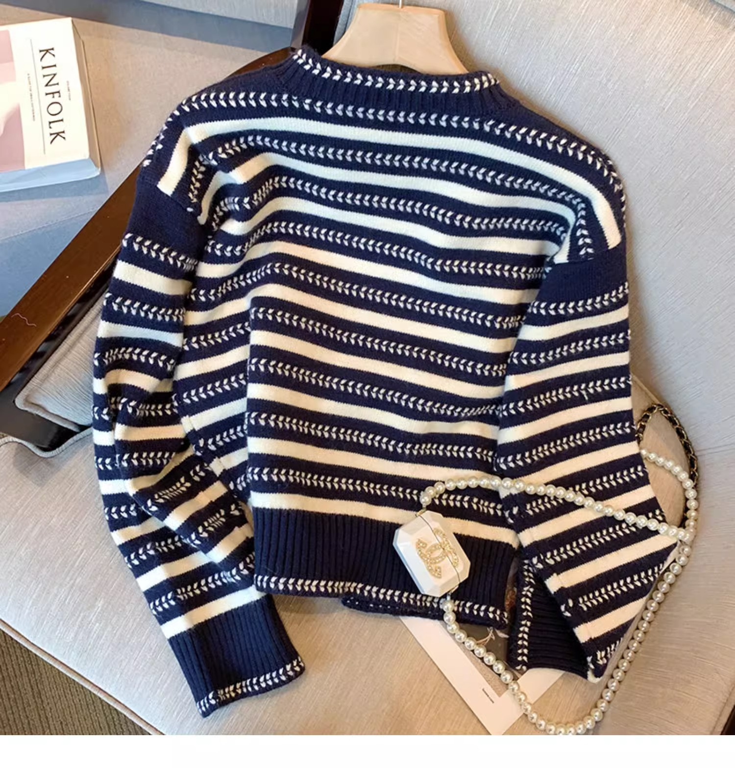 Áo len dệt kim kẻ sọc, kiểu dáng ngắn, mang phong cách Pháp cổ điển dành cho mùa thu đông. Chất liệu len mềm mại, ấm áp, tạo cảm giác dễ chịu khi mặc. Các đường kẻ sọc tinh tế giúp tôn dáng người mặc. Dễ dàng phối cùng quần jeans hoặc chân váy để tạo nên vẻ ngoại hình ưa nhìn. Phù hợp cho nhiều dịp khác nhau, từ đi làm đến gặp gỡ bạn bè. | Tên sản phẩm: Áo Len Nữ Áo Len Hàng Mùa Xuân Thu Đông Phục Cổ Cổ Điển - Thời Trang Nữ | Mã sản phẩm: K2696 - Giá: 560.000đ | Mã nhà sản xuất: SHREIA-G01Hình ảnh sản phẩm