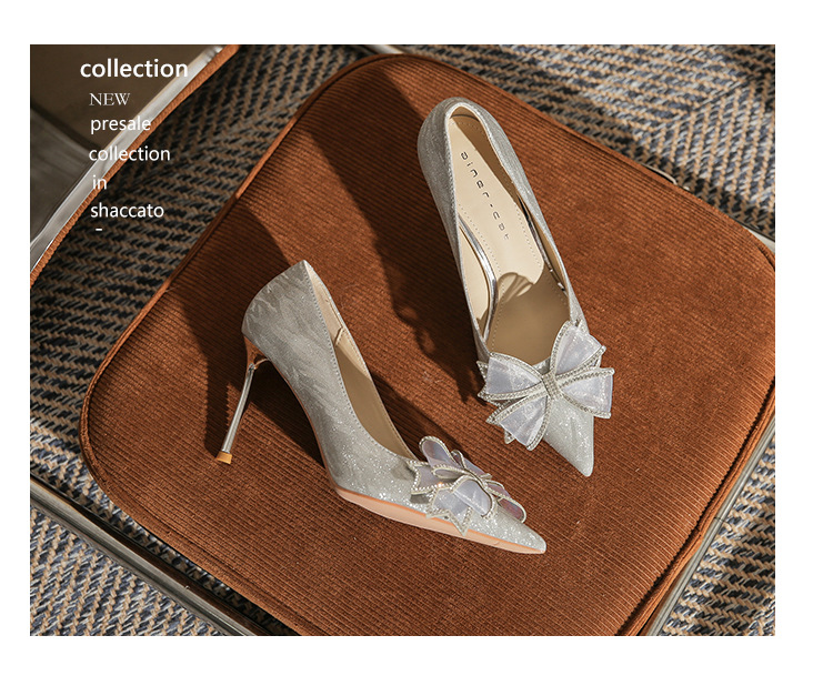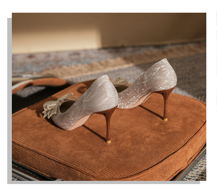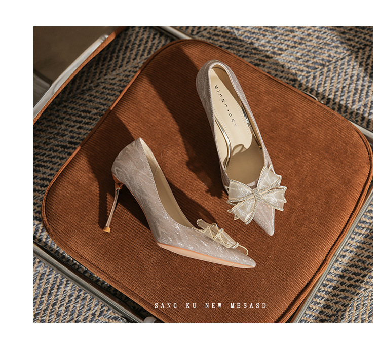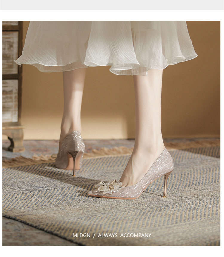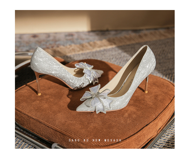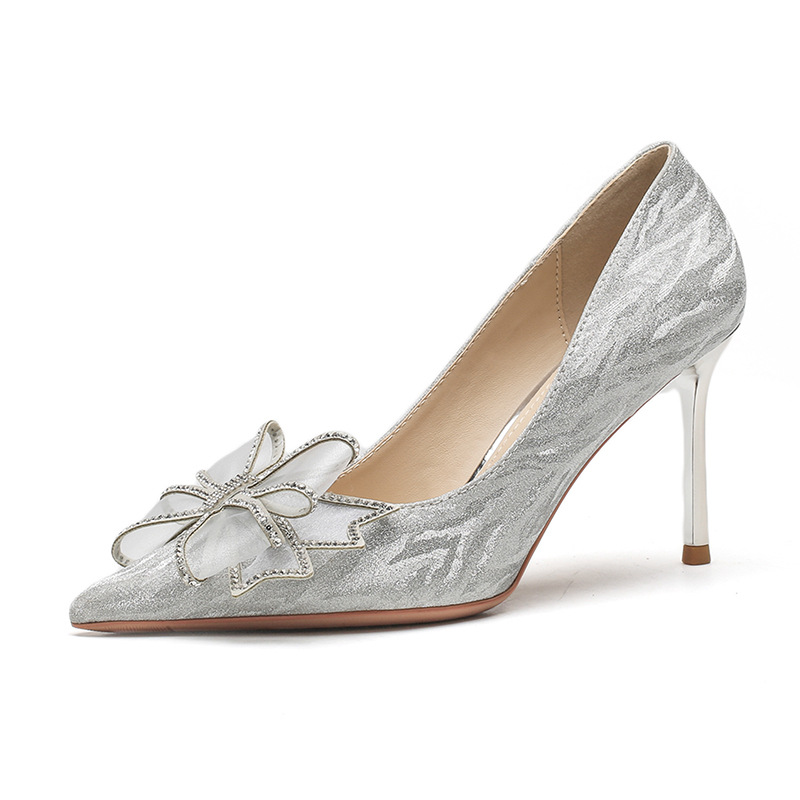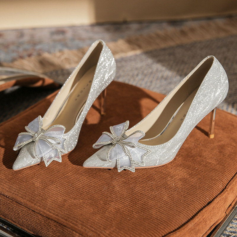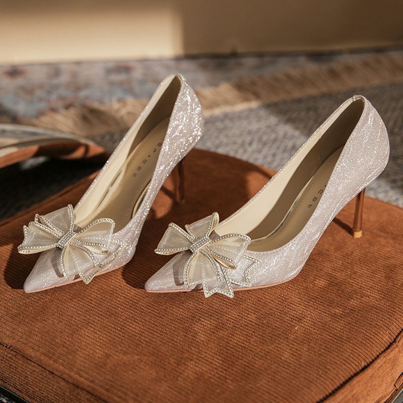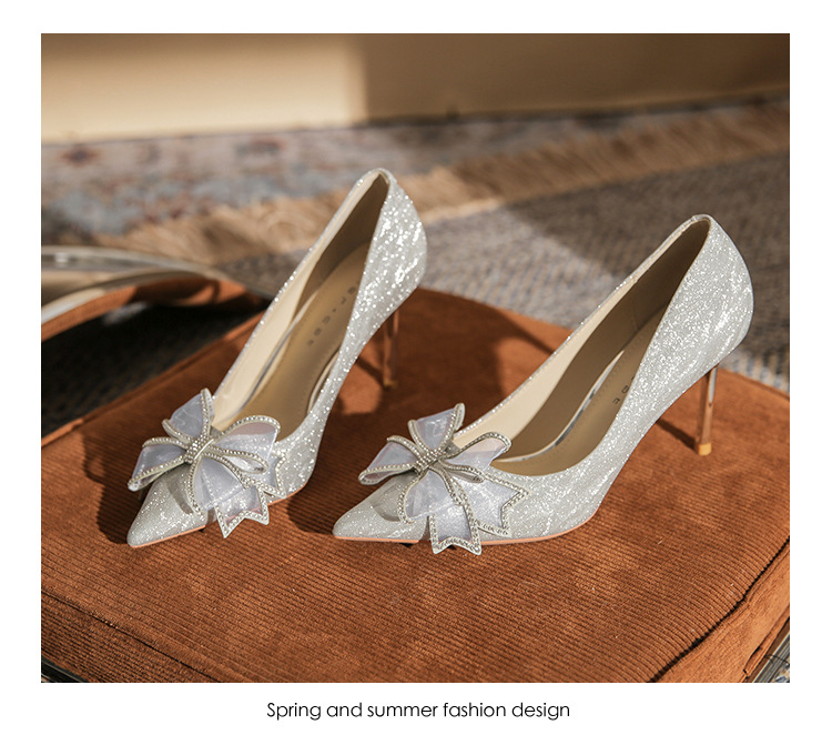 Đôi giày này có phần mũi nhọn thanh lịch, được điểm xuyết nơ thắt cùng những chi tiết lấp lánh như pha lê. Chất liệu mềm mại ôm chân, mang lại cảm giác dễ chịu. Kiểu dáng gót thanh, phù hợp cho các dịp như làm cô dâu, phụ dâu hay dự tiệc. Khi sử dụng, bạn nên chọn cỡ vừa vặn và đi những bước nhẹ nhàng lúc đầu để làm quen. | Tên sản phẩm: Giày Cao Gót Nữ Thắt Nơ Bướm Gắn Đá Mũi Nhọn Gót Nhọn Dùng Trong Lễ Cưới - Giày Dép Nữ | Mã sản phẩm: K2993 - Giá: 870.000đ | Mã nhà sản xuất: HUDS-G03Hình ảnh sản phẩm