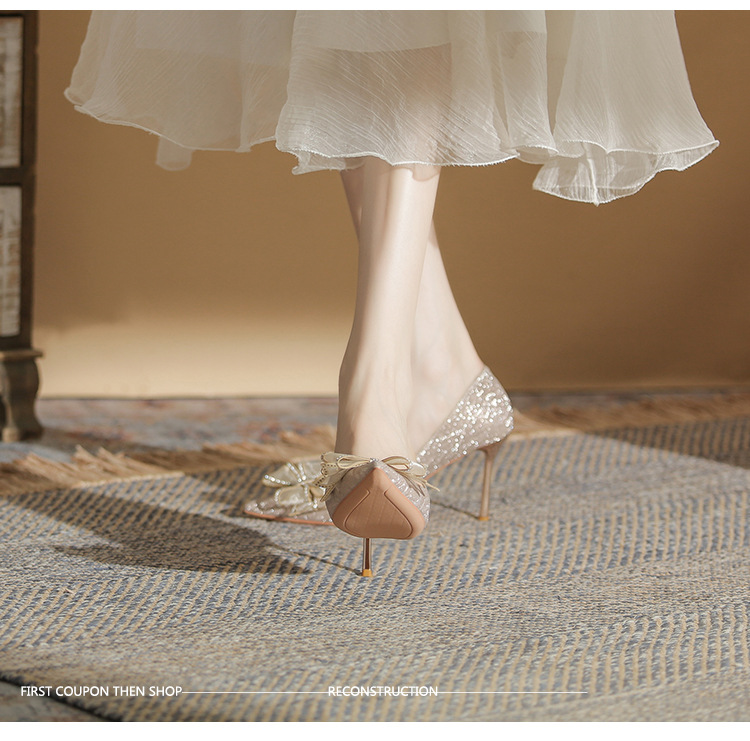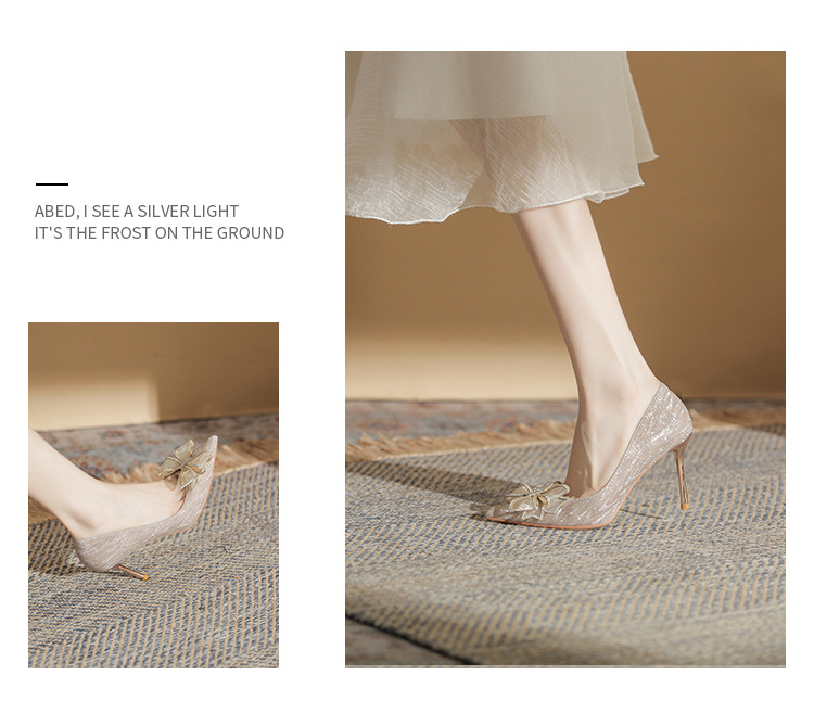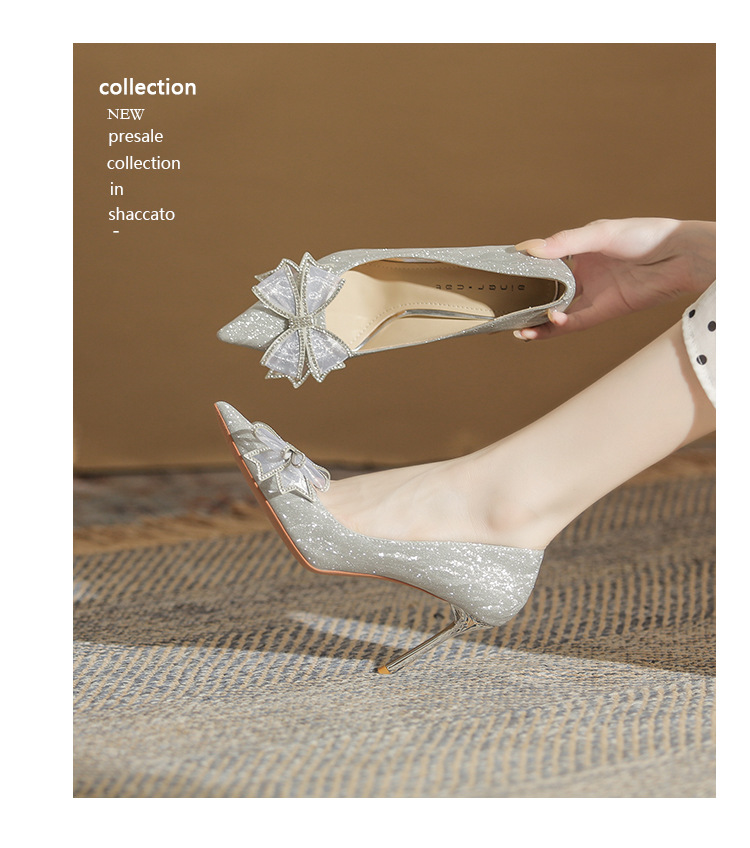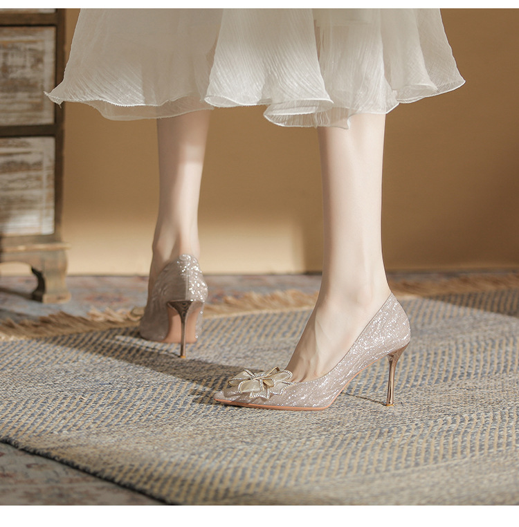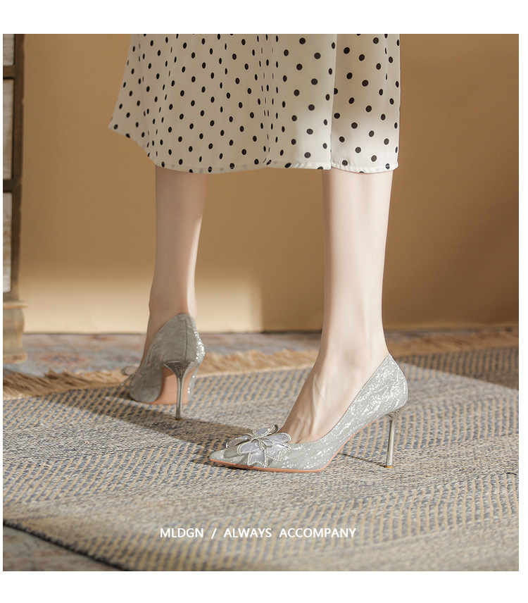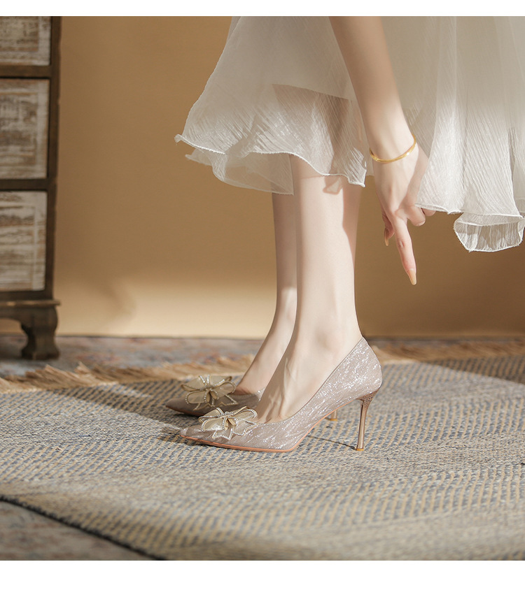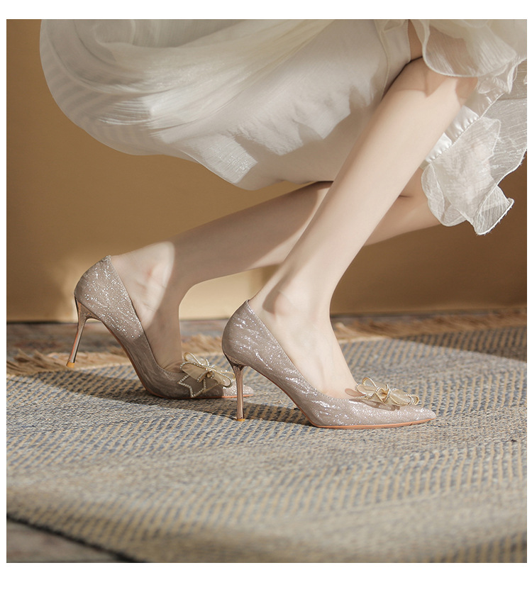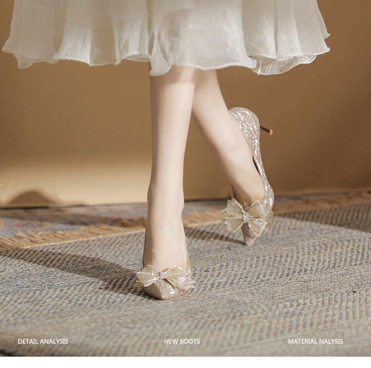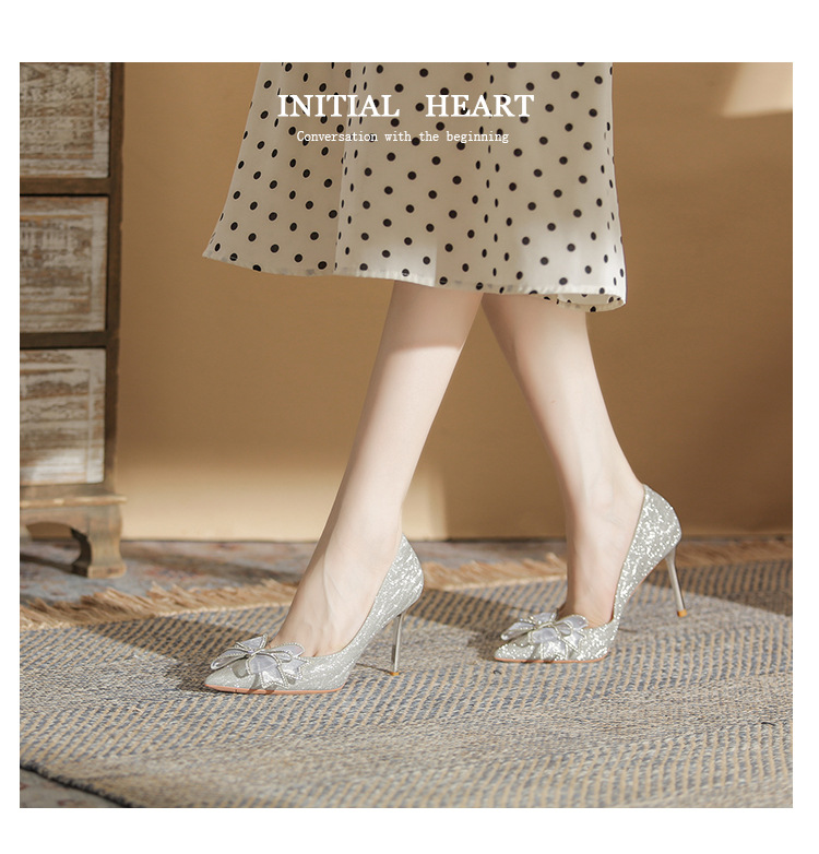 Đôi giày này có phần mũi nhọn thanh lịch, được điểm xuyết nơ thắt cùng những chi tiết lấp lánh như pha lê. Chất liệu mềm mại ôm chân, mang lại cảm giác dễ chịu. Kiểu dáng gót thanh, phù hợp cho các dịp như làm cô dâu, phụ dâu hay dự tiệc. Khi sử dụng, bạn nên chọn cỡ vừa vặn và đi những bước nhẹ nhàng lúc đầu để làm quen. | Tên sản phẩm: Giày Cao Gót Nữ Thắt Nơ Bướm Gắn Đá Mũi Nhọn Gót Nhọn Dùng Trong Lễ Cưới - Giày Dép Nữ | Mã sản phẩm: K2993 - Giá: 870.000đ | Mã nhà sản xuất: HUDS-G03Hình ảnh sản phẩm