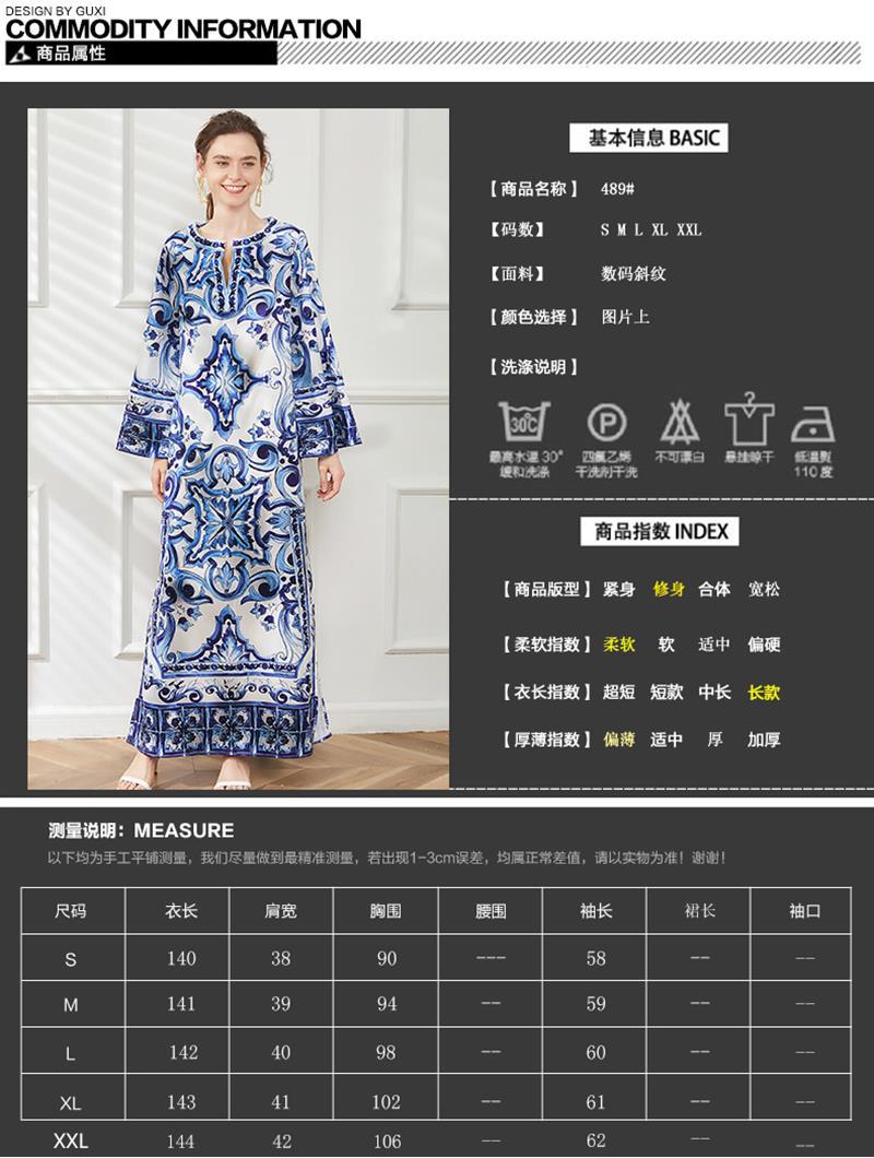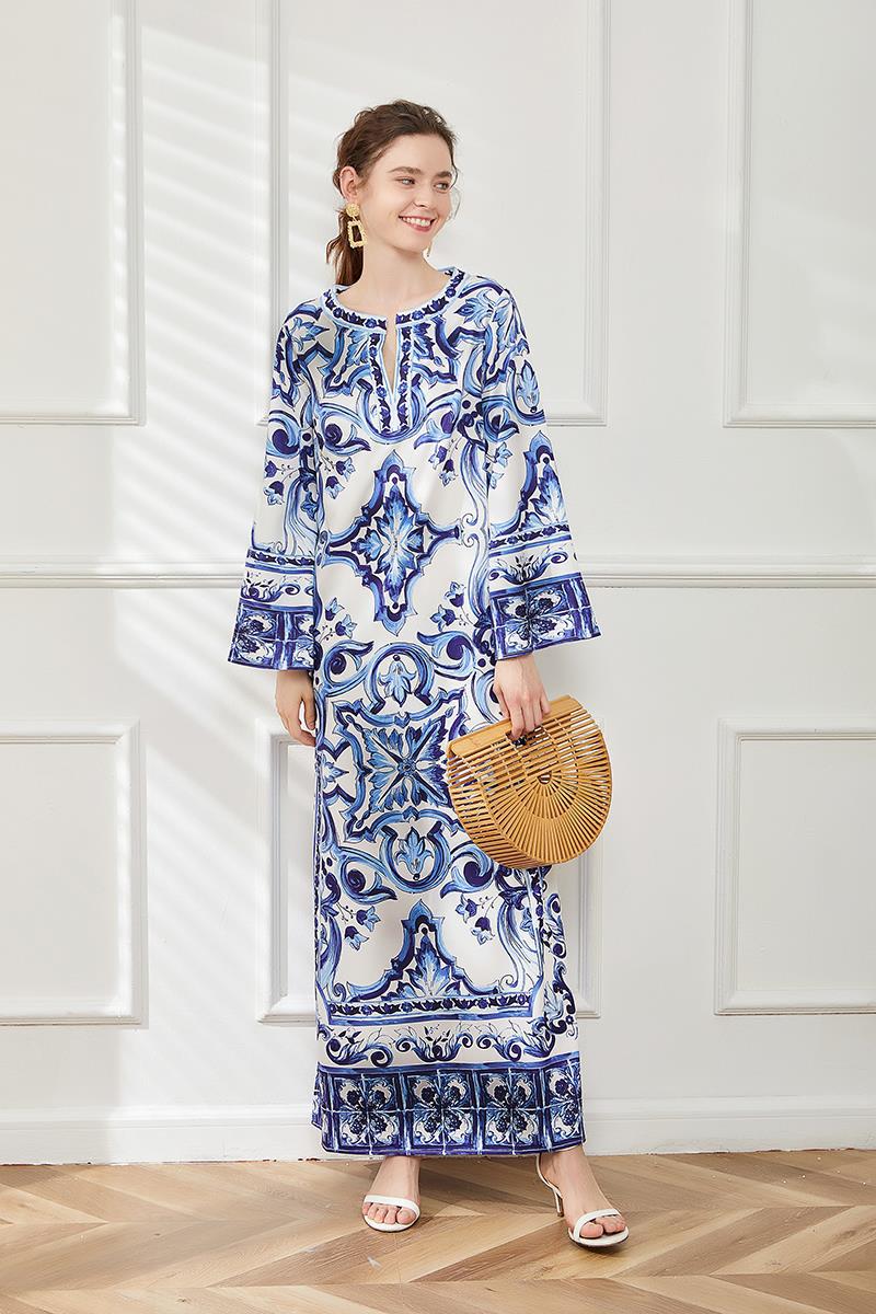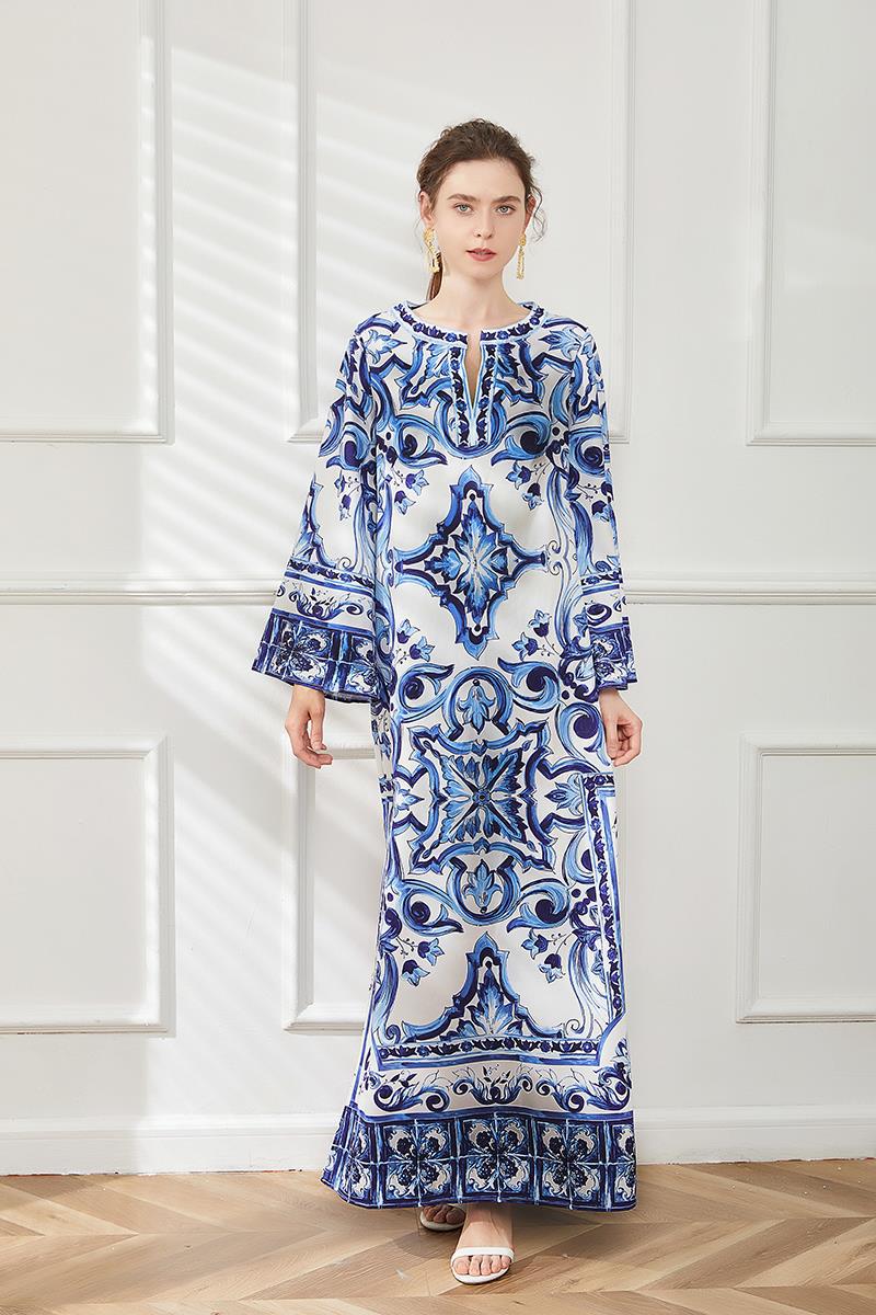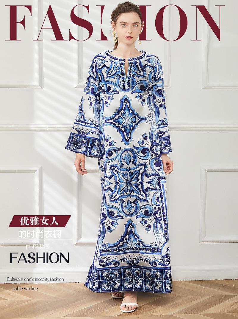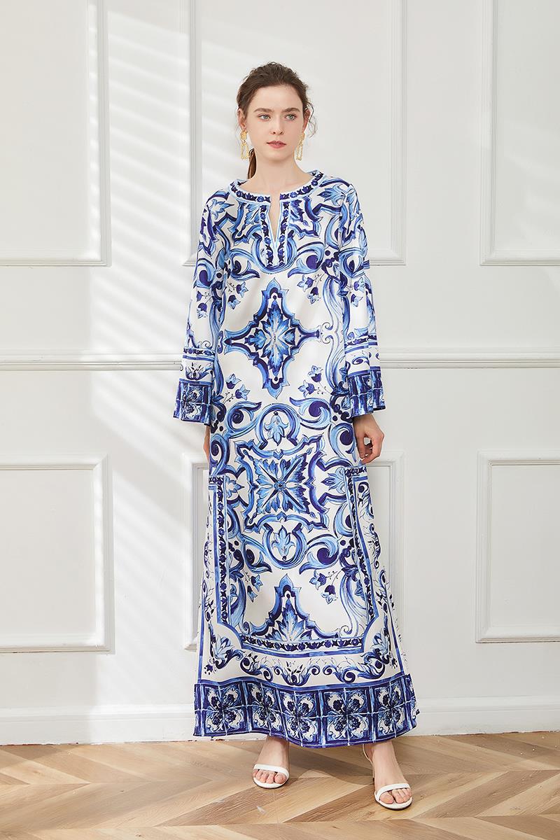 Chiếc váy dài mang phong cách cổ điển với họa tiết hoa lam in nổi, tạo điểm nhấn thanh lịch. Thiết kế rộng rãi, thoáng mát giúp che bớt khuyết điểm cơ thể và bảo vệ da dưới nắng. Đường xẻ nhẹ ở vạt váy mang lại sự thoải mái, dễ dàng di chuyển. Sản phẩm thích hợp mặc đi biển, dạo phố hay trong những kỳ nghỉ dưỡng. Bạn có thể phối cùng dép bệt và mũ rộng vành để hoàn thiện bộ trang phục. | Tên sản phẩm: Váy Đầm Liền Thân Dáng Dài Nữ Họa Tiết Hoa Hàng Mùa Hè Phục Cổ Cổ Điển Đồ Đi Biển Váy Maxi - Thời Trang Nữ | Mã sản phẩm: K3275 - Giá: 750.000đ | Mã nhà sản xuất: GUDG-G02Hình ảnh sản phẩm