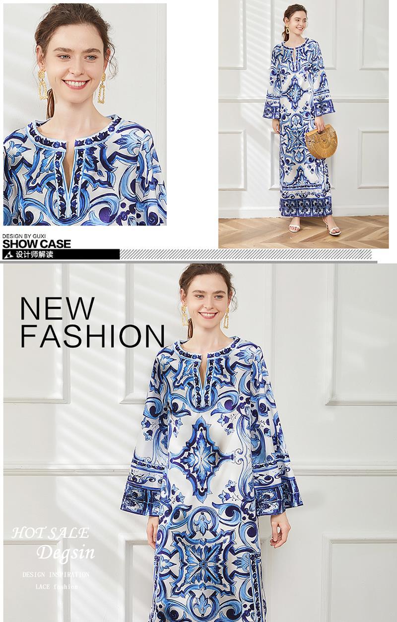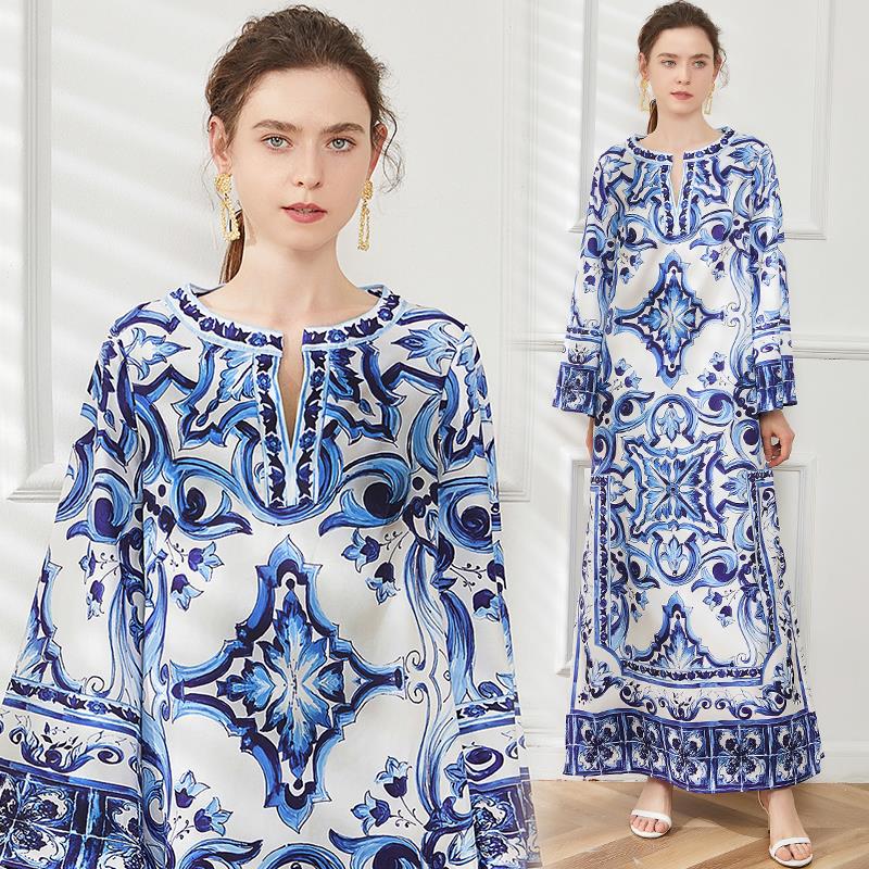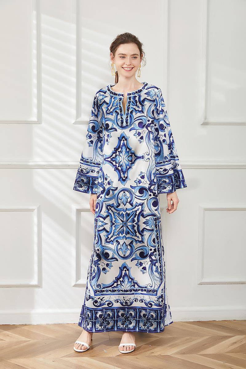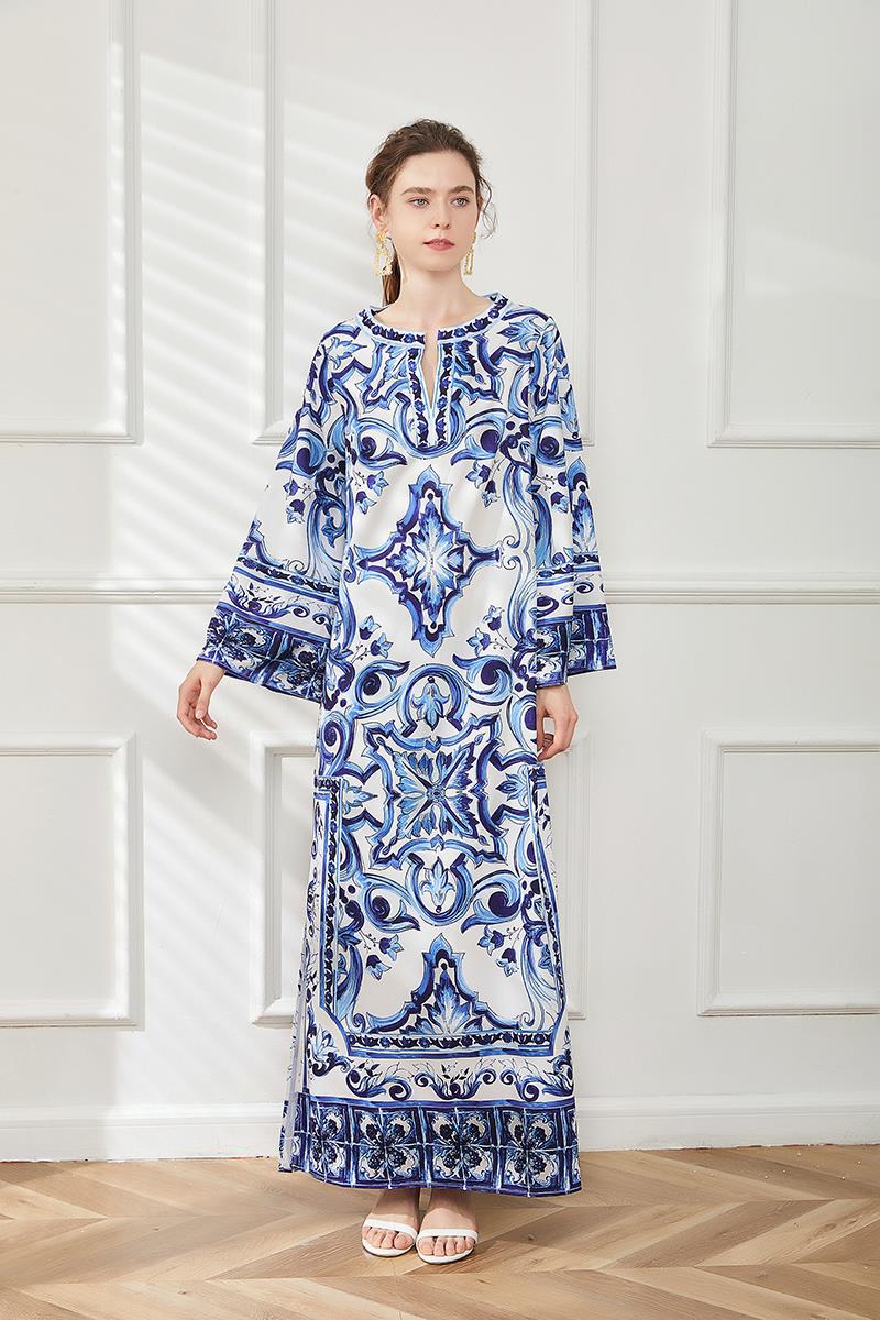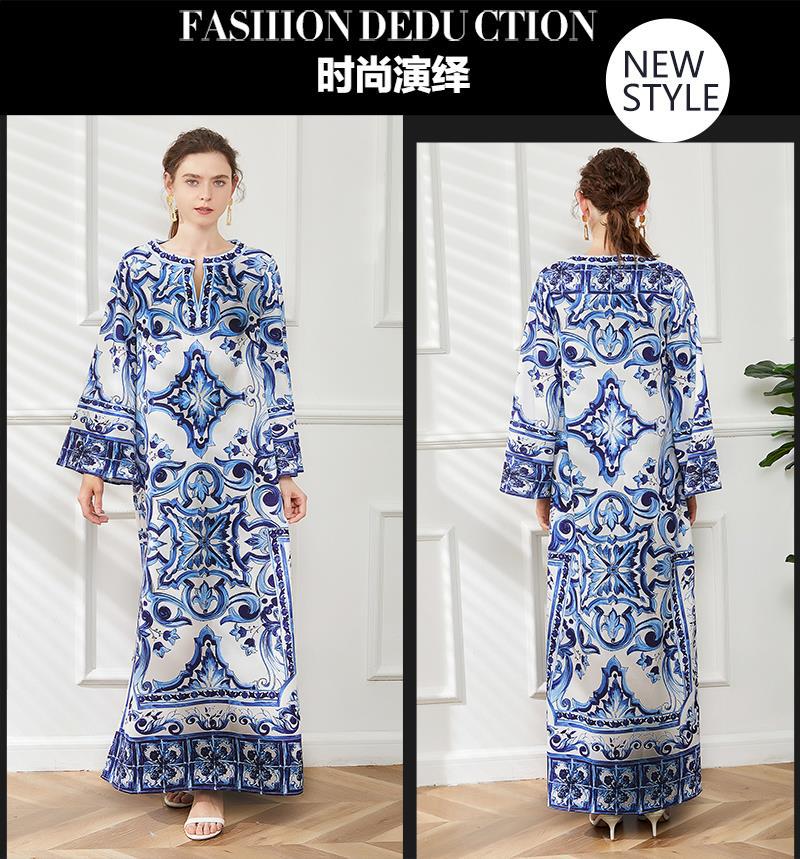 Chiếc váy dài mang phong cách cổ điển với họa tiết hoa lam in nổi, tạo điểm nhấn thanh lịch. Thiết kế rộng rãi, thoáng mát giúp che bớt khuyết điểm cơ thể và bảo vệ da dưới nắng. Đường xẻ nhẹ ở vạt váy mang lại sự thoải mái, dễ dàng di chuyển. Sản phẩm thích hợp mặc đi biển, dạo phố hay trong những kỳ nghỉ dưỡng. Bạn có thể phối cùng dép bệt và mũ rộng vành để hoàn thiện bộ trang phục. | Tên sản phẩm: Váy Đầm Liền Thân Dáng Dài Nữ Họa Tiết Hoa Hàng Mùa Hè Phục Cổ Cổ Điển Đồ Đi Biển Váy Maxi - Thời Trang Nữ | Mã sản phẩm: K3275 - Giá: 750.000đ | Mã nhà sản xuất: GUDG-G02Hình ảnh sản phẩm