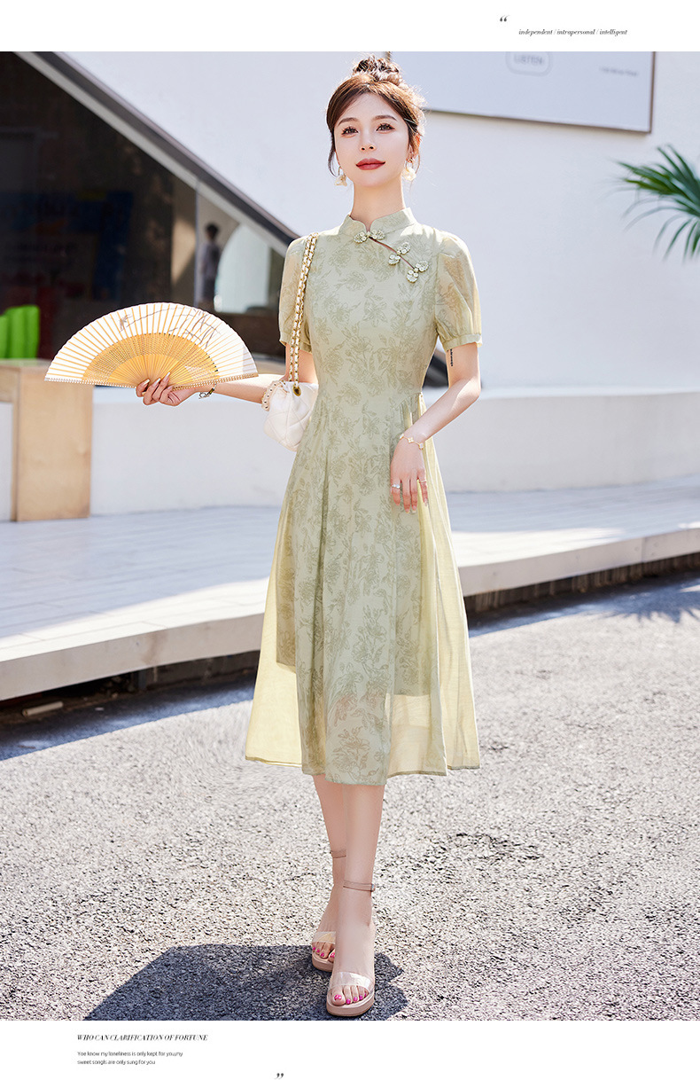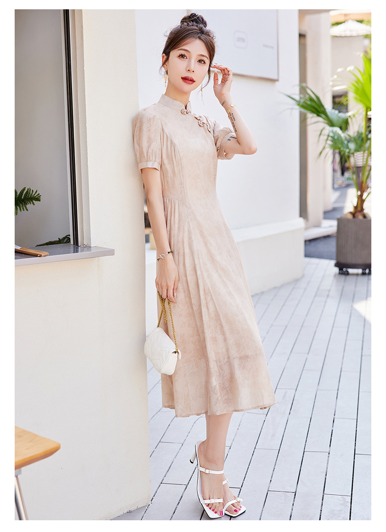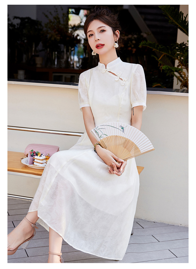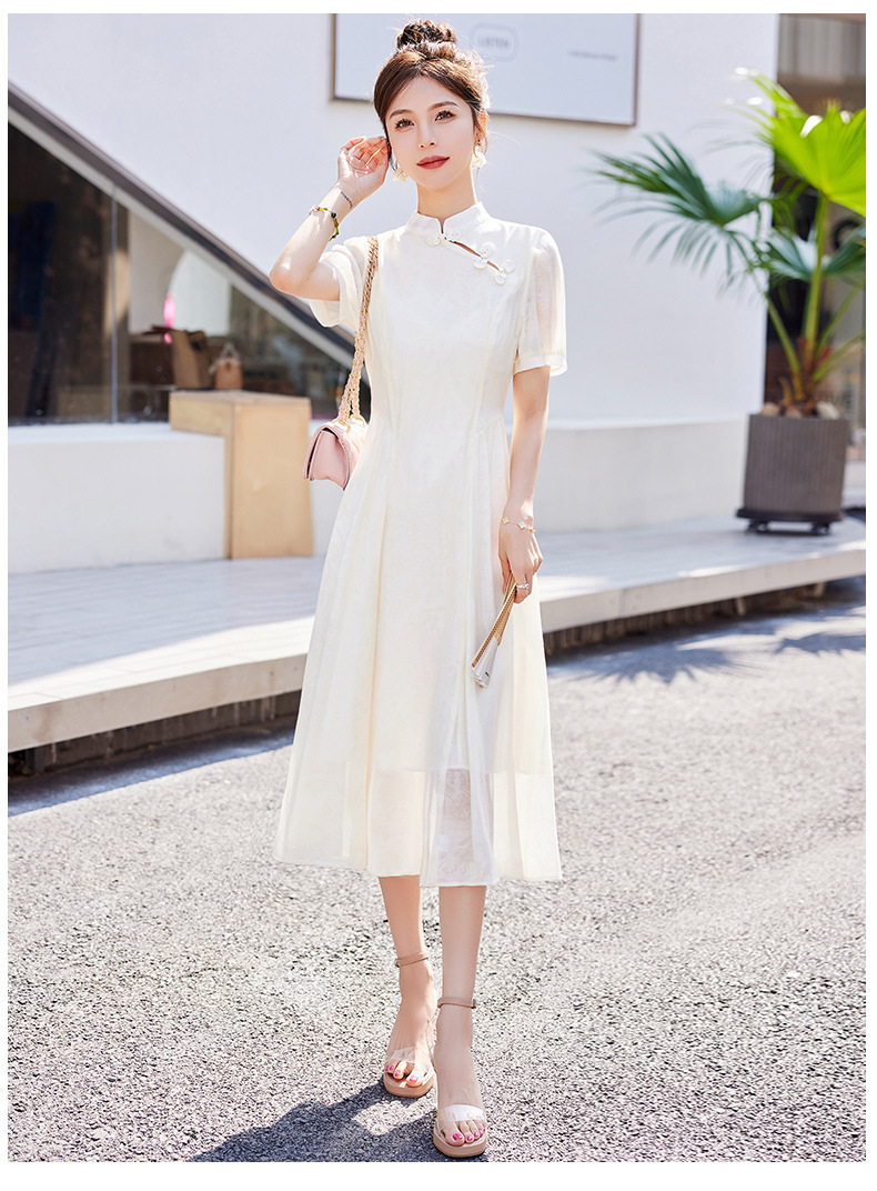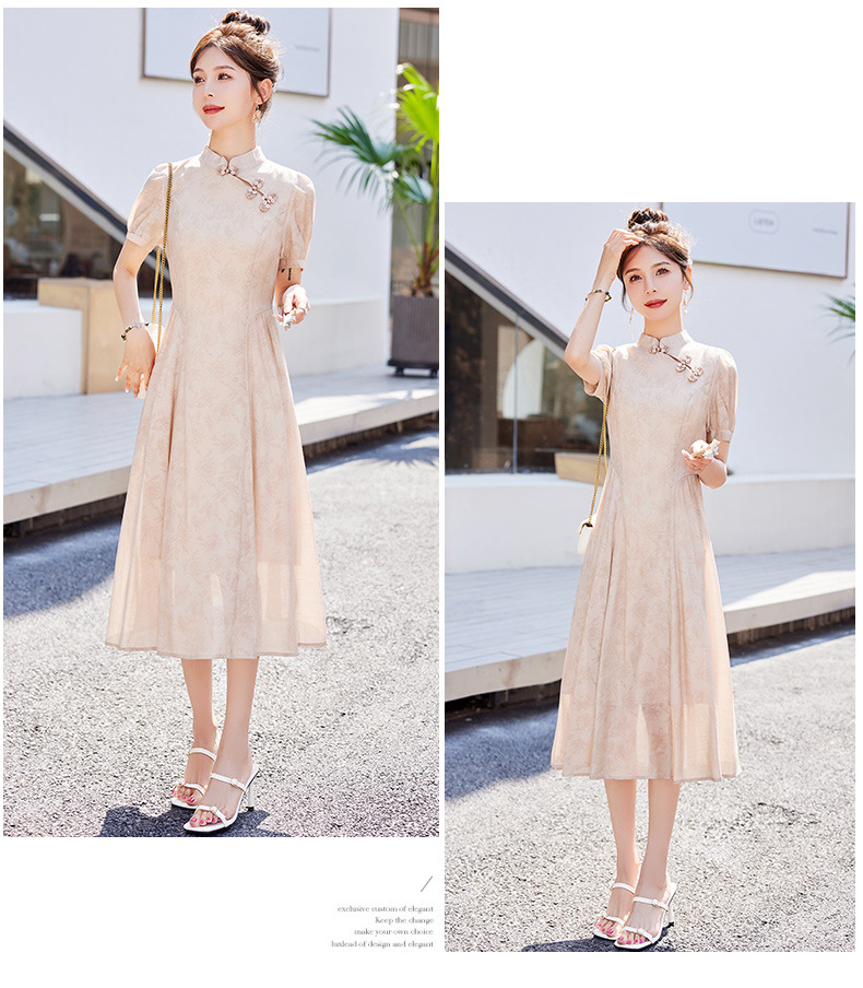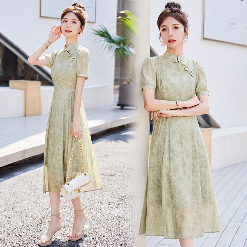Áo dài cách tân mang phong cách xưa, điểm nhấn là hàng khuy cài tinh xảo dọc theo cổ áo. Thiết kế này có cổ cao ôm, tà dài thướt tha giúp tôn dáng người mặc. Chất vải mỏng nhẹ, thoáng mát, rất phù hợp cho những ngày hè. Có thể mặc đi làm, dự tiệc hoặc trong các dịp gặp mặt. Khi giặt, nên giặt tay và phơi trong bóng râm để giữ áo được bền đẹp. | Tên sản phẩm: Váy Đầm Liền Thân Dáng Dài Nữ Hàng Mùa Hè Phục Cổ Cổ Điển - Thời Trang Nữ | Mã sản phẩm: K3449 - Giá: 1.400.000đ | Mã nhà sản xuất: HADG-G04Hình ảnh sản phẩm