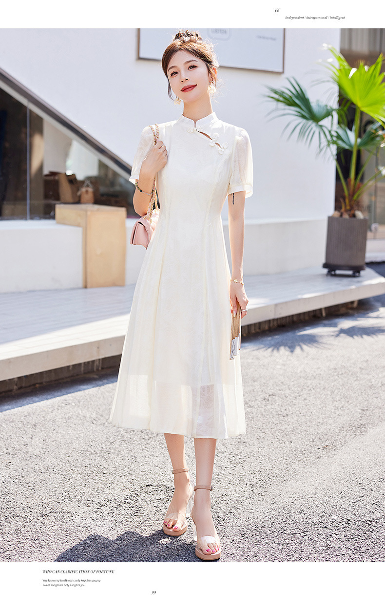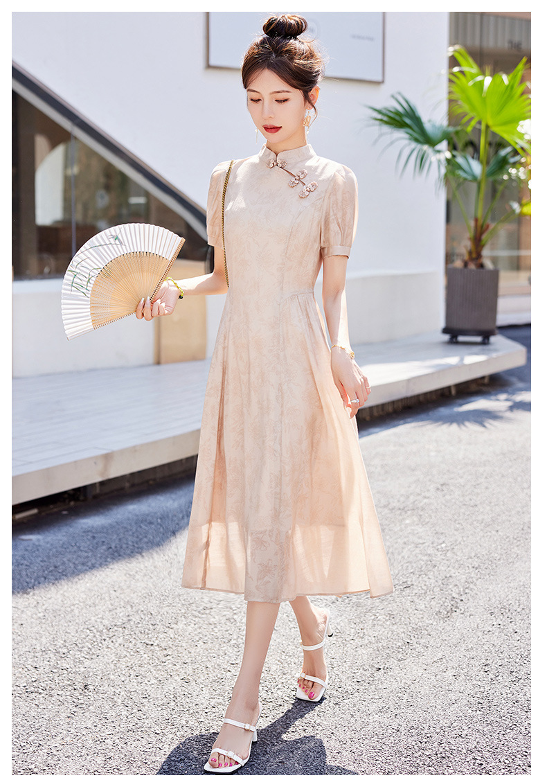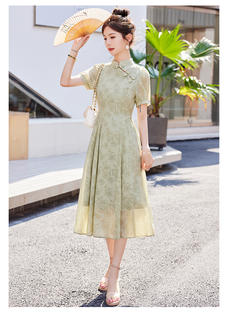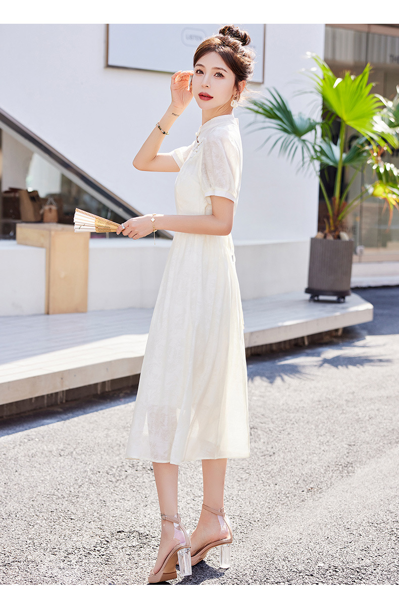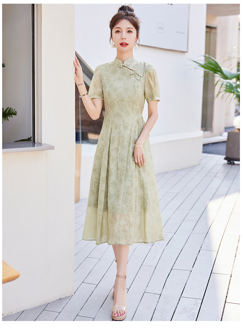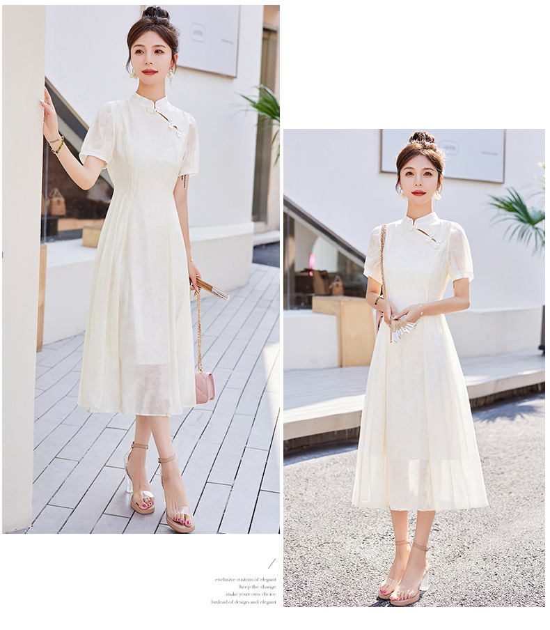 Áo dài cách tân mang phong cách xưa, điểm nhấn là hàng khuy cài tinh xảo dọc theo cổ áo. Thiết kế này có cổ cao ôm, tà dài thướt tha giúp tôn dáng người mặc. Chất vải mỏng nhẹ, thoáng mát, rất phù hợp cho những ngày hè. Có thể mặc đi làm, dự tiệc hoặc trong các dịp gặp mặt. Khi giặt, nên giặt tay và phơi trong bóng râm để giữ áo được bền đẹp. | Tên sản phẩm: Váy Đầm Liền Thân Dáng Dài Nữ Hàng Mùa Hè Phục Cổ Cổ Điển - Thời Trang Nữ | Mã sản phẩm: K3449 - Giá: 1.400.000đ | Mã nhà sản xuất: HADG-G04Hình ảnh sản phẩm