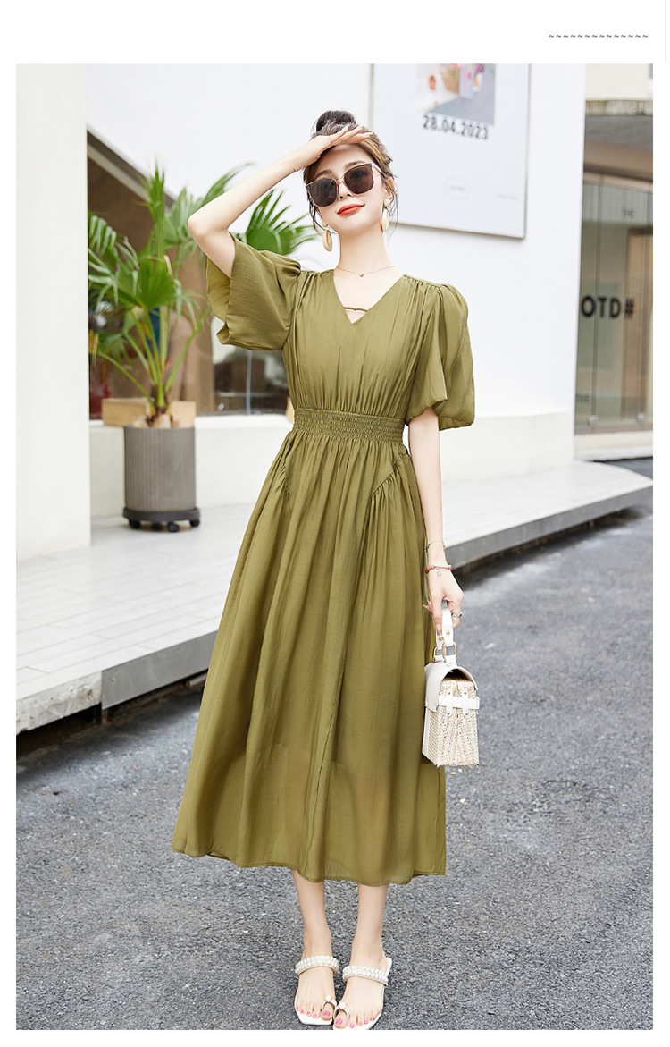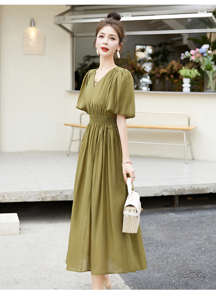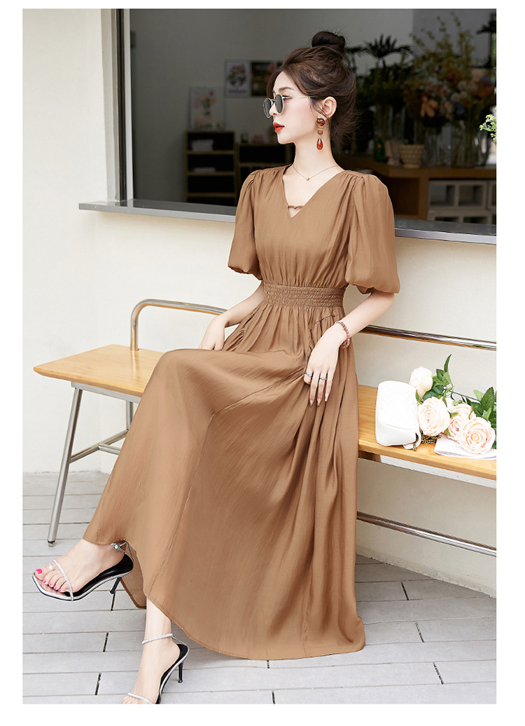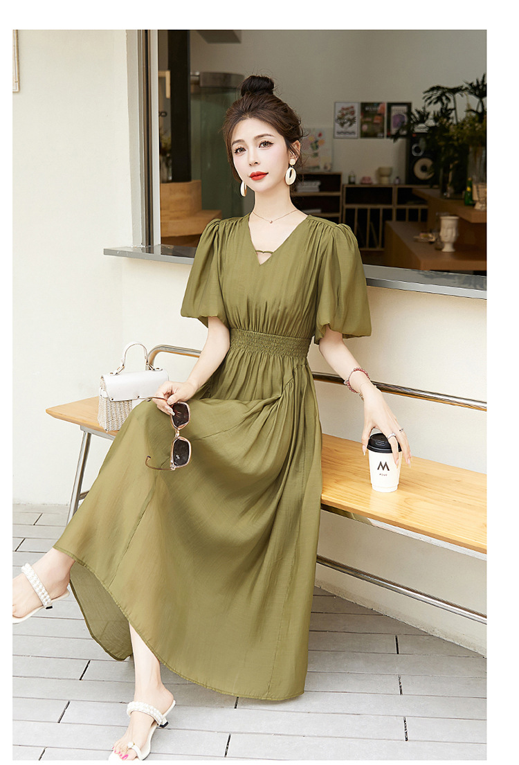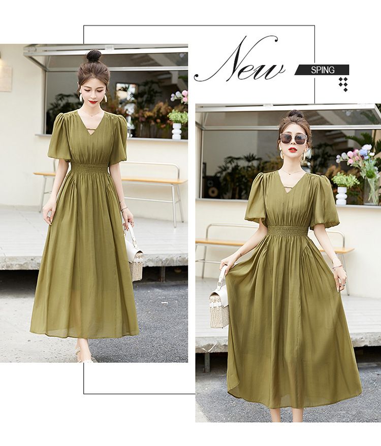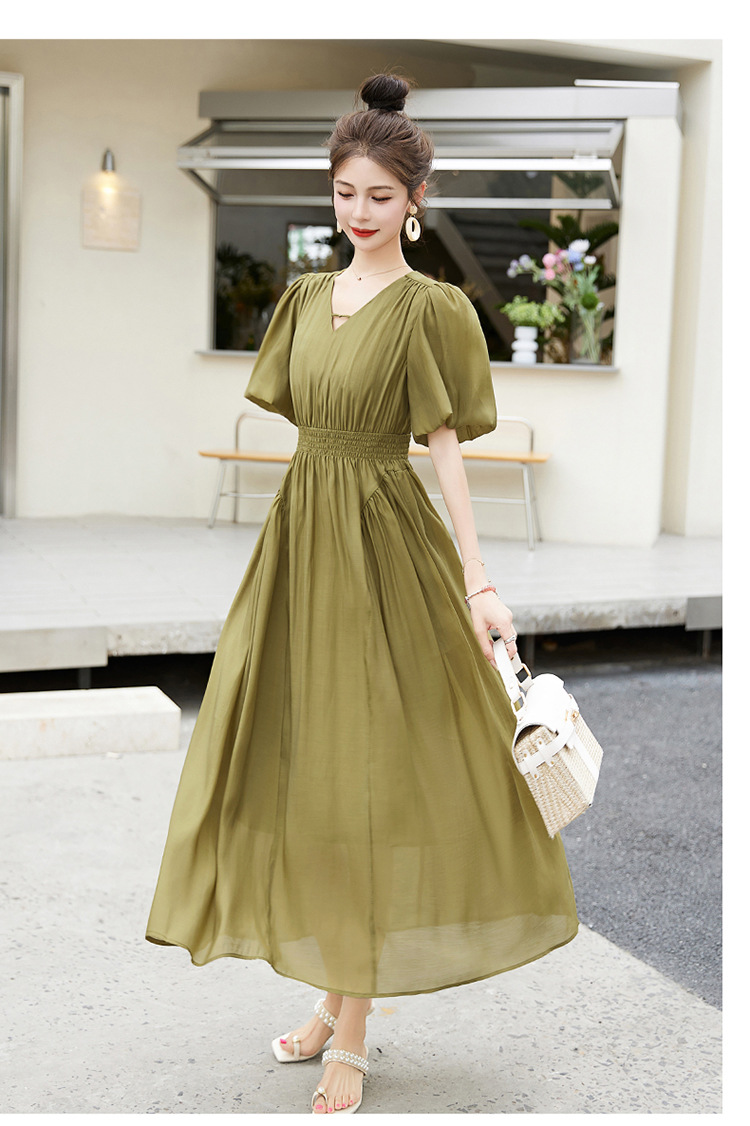 Váy dài thiết kế cổ chữ V tôn dáng, tay điểm nơ nhẹ nhàng. Phần eo được may dạng thun co giãn, ôn hờn và tạo điểm nhấn. Vải dày dặn, chiếc váy có độ xòe đẹp, dáng dài thướt tha phù hợp nhiều dịp. Dễ dàng phối cùng giày dép và phụ kiện. Mặc vào là đẹp, thích hợp cho những ngày hè mát mẻ. | Tên sản phẩm: Váy Đầm Liền Thân Nữ Cổ Chữ V Hàng Mùa Hè Phong Cách Hàn Quốc - Thời Trang Nữ | Mã sản phẩm: K3741 - Giá: 1.390.000đ | Mã nhà sản xuất: HADG-G04Hình ảnh sản phẩm